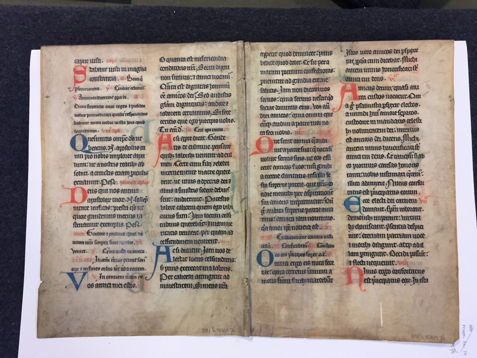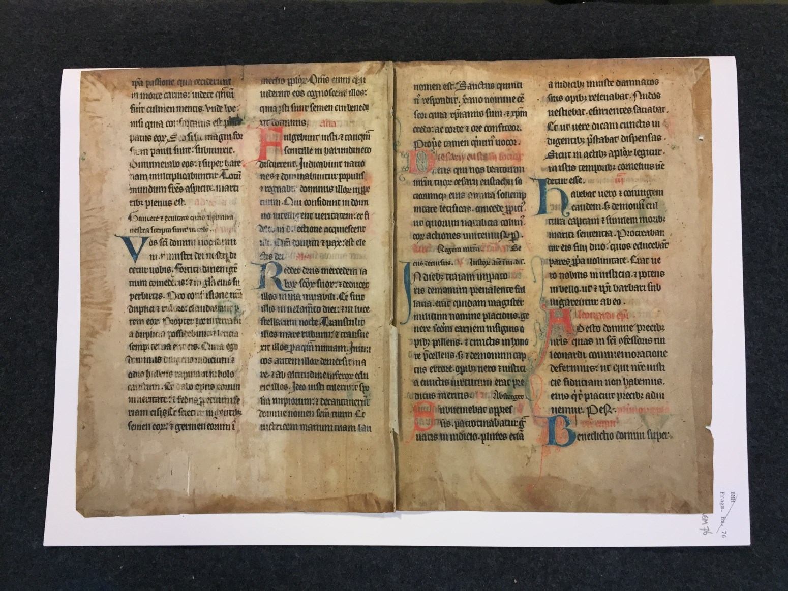 Fragmenten, 2 stuks, met teksten uit missale, Proprium Sanctorum de festo Caesarii, Eustachii et sociorum Leonardi (episc.); Commune Apostolorum