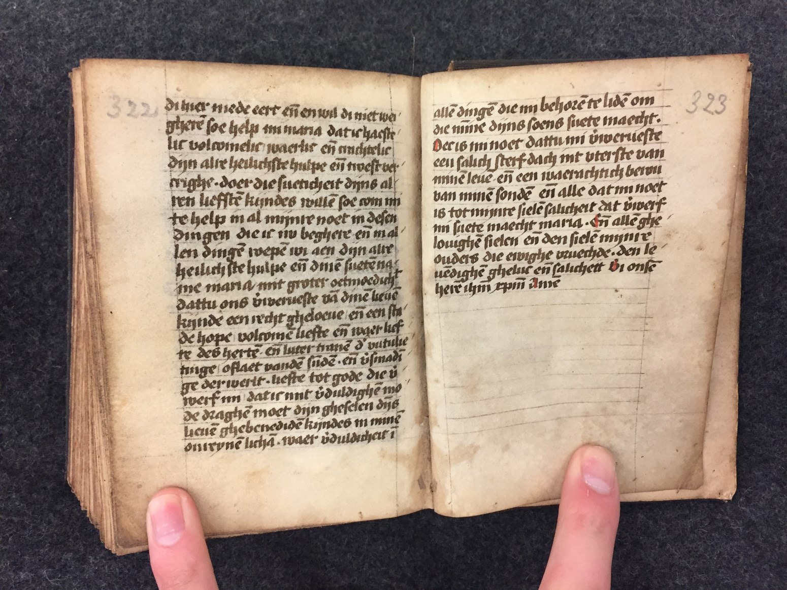 Het handschrift is in het Nederlands geschreven in een eenvoudig gebruiksschrift. Het handschrift bevat verschillende devote teksten, zoals het Boecxken vander edelre doecht der verduldicheit, een brief over het leven en lijden van Christus van Johannes Vos van Heusden, de honderd artikelen van Suso, oefening voor de zielen, boetepsalmen en litanie voor overledenen, en een ...