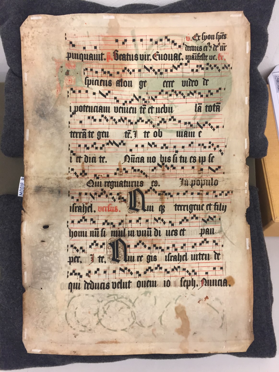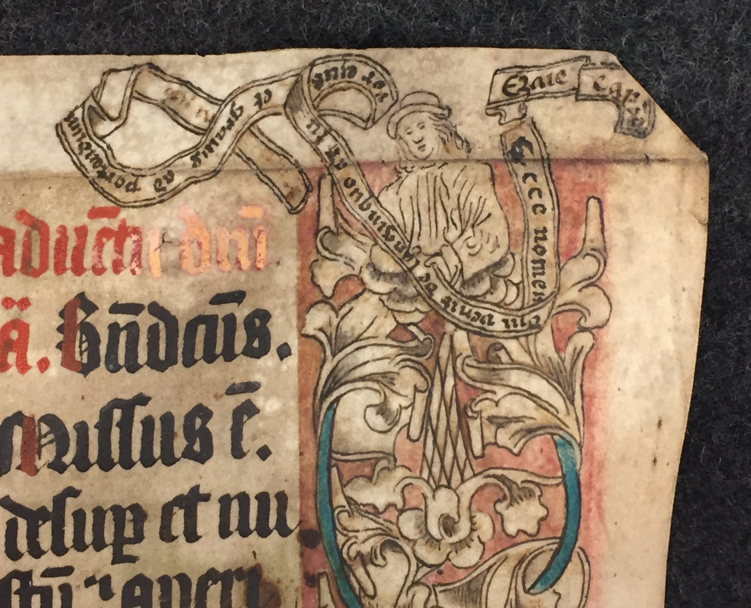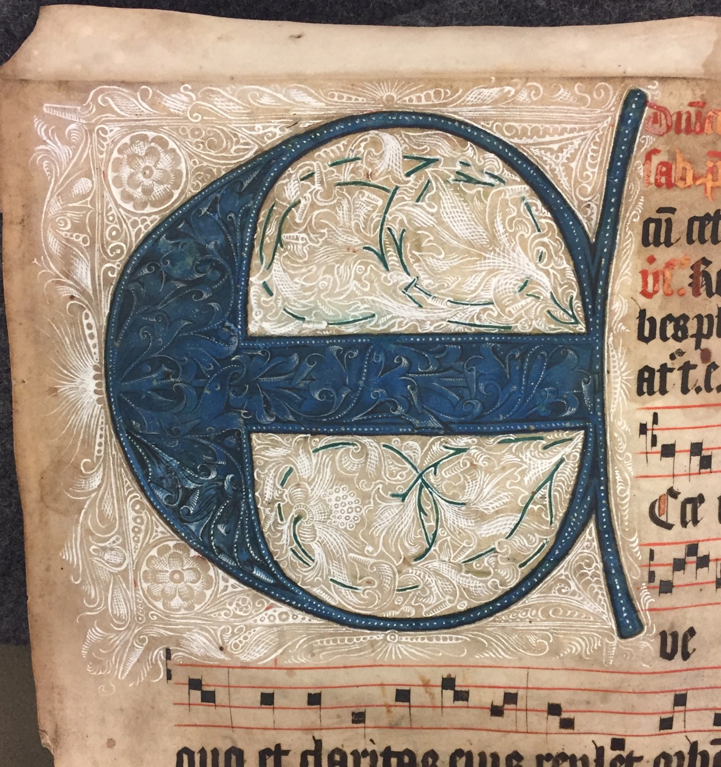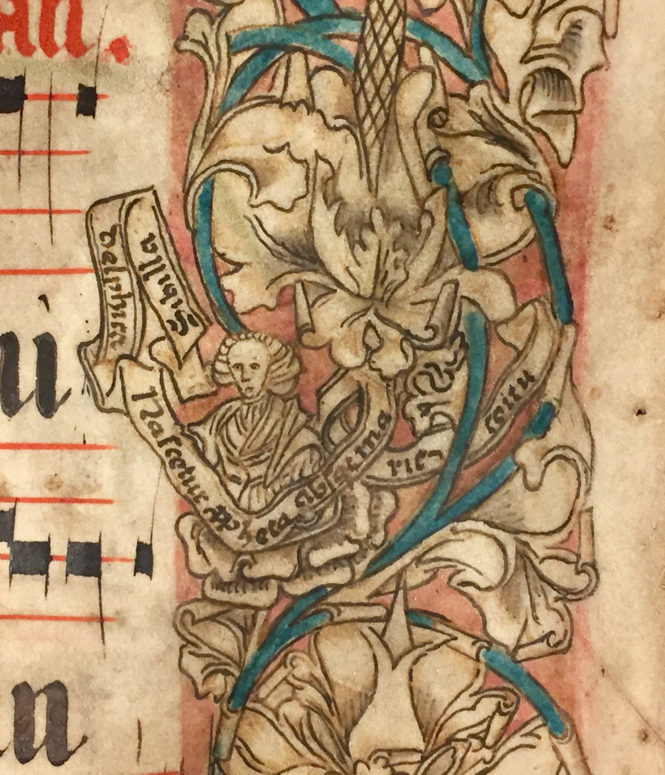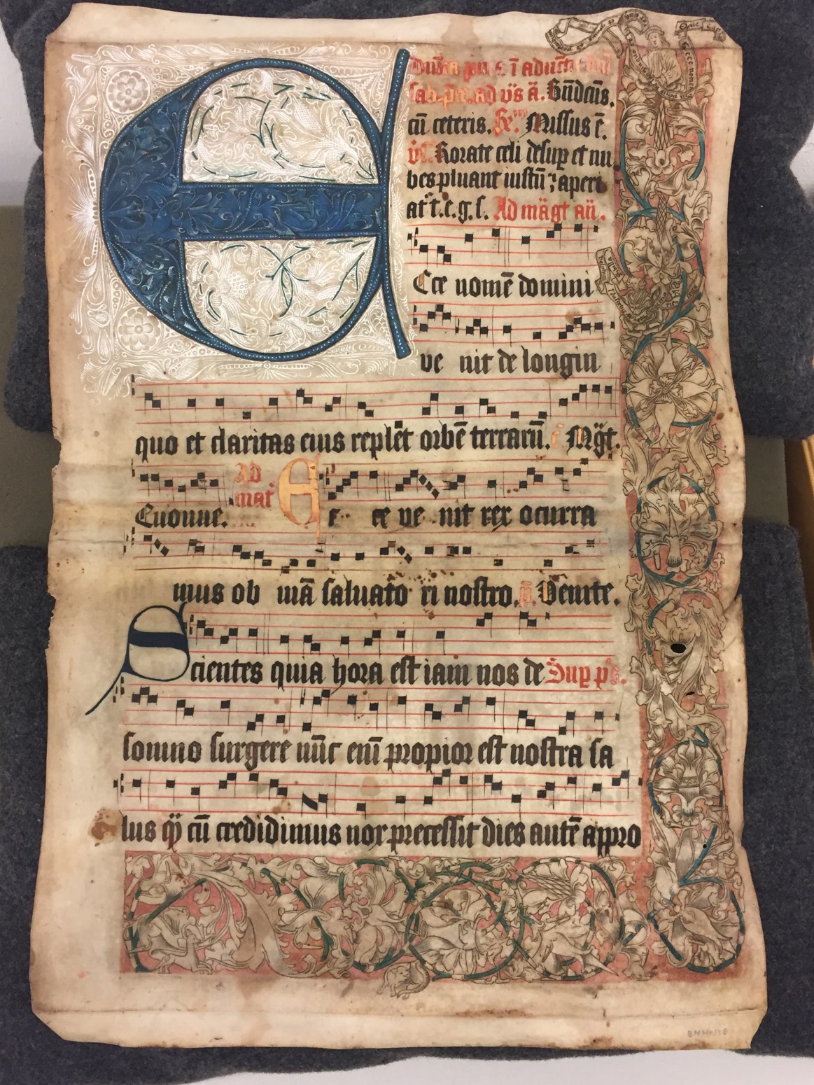 Fragment van een antiphonarium. Naast een grote, met zilver en groen, versierde initiaal E in blauw, heeft het fragment rijk geïllustreerde marges (Jesaja en een Delphische Sibille, beiden belangrijk bij de Aankondiging van Christus).