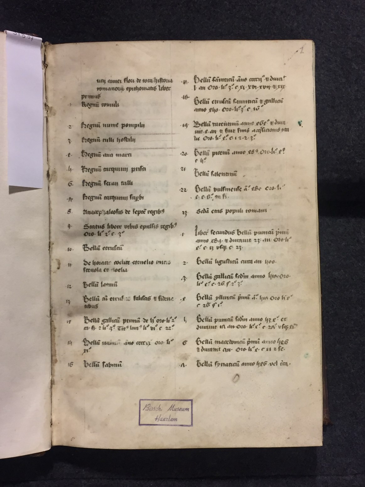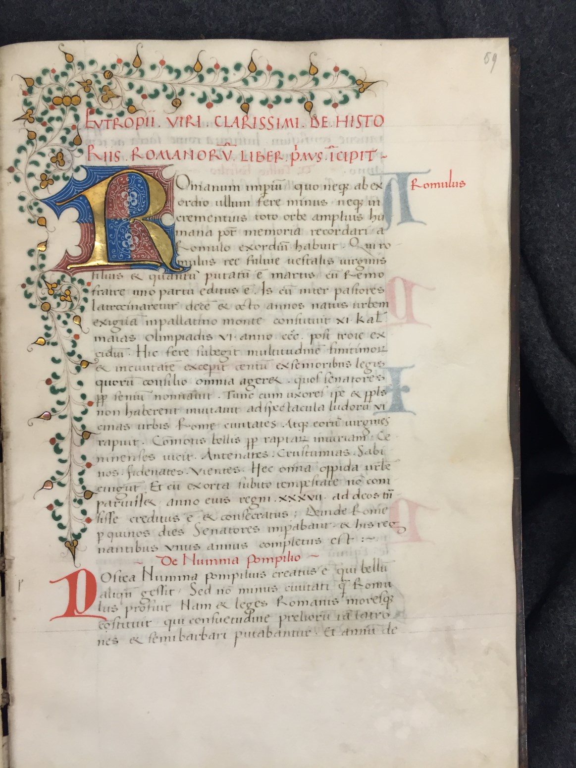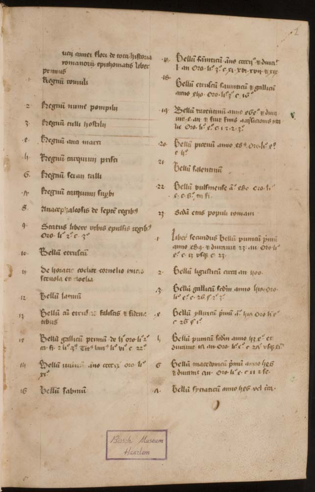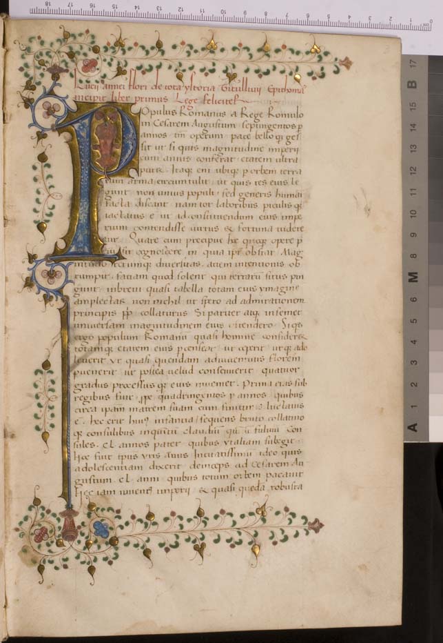 Dit handschrift met de teksten van Florus en Eutropius dateert uit d eerste helft van de 15de eeuw en is in humanistisch schrift geschreven. De decoraties in de marges zijn onmiskenbaar Delfts. De inhoudsopgave is in gotisch schrift geschreven en waarschijnlijk ook in Delft toegevoegd.