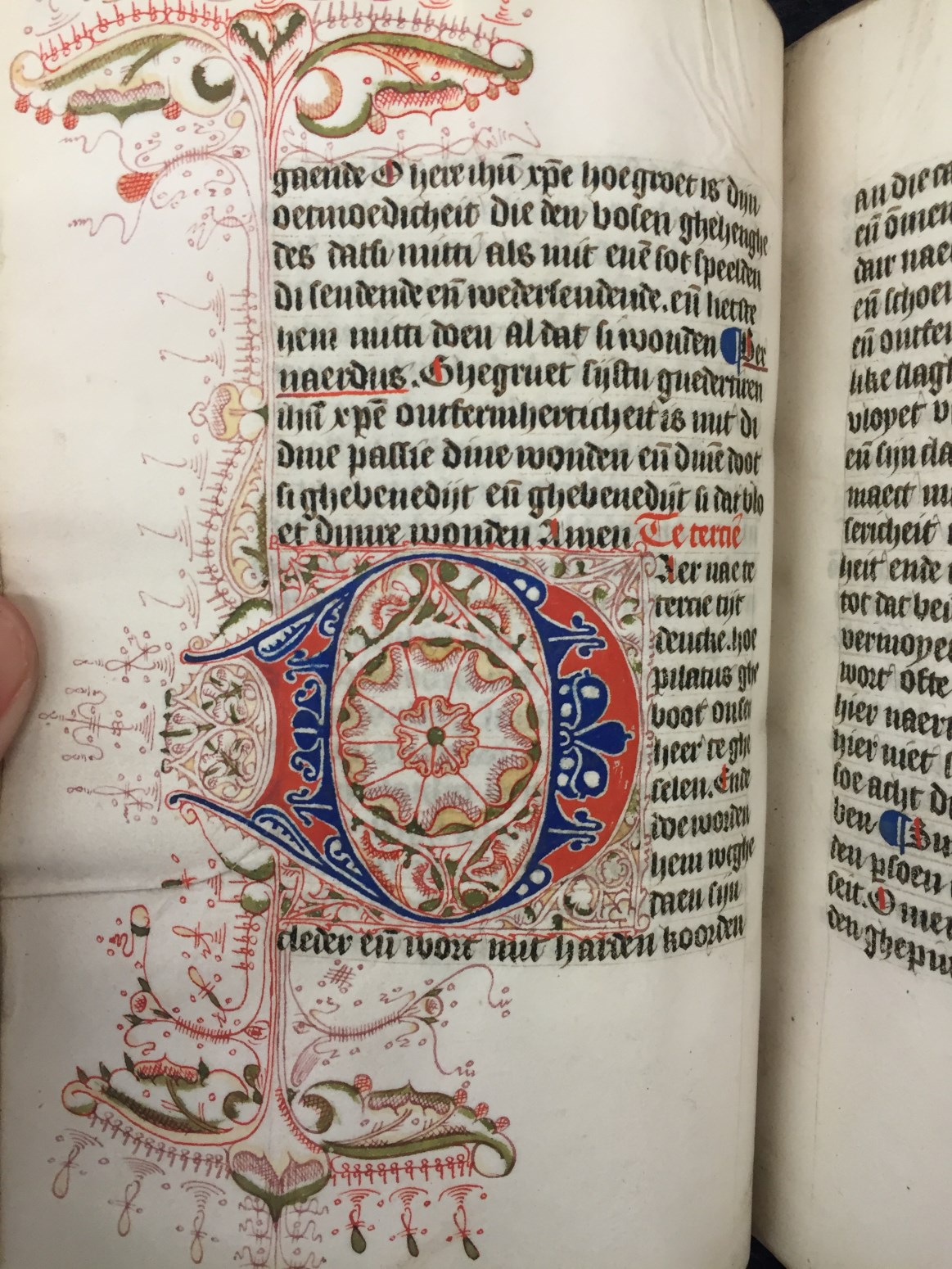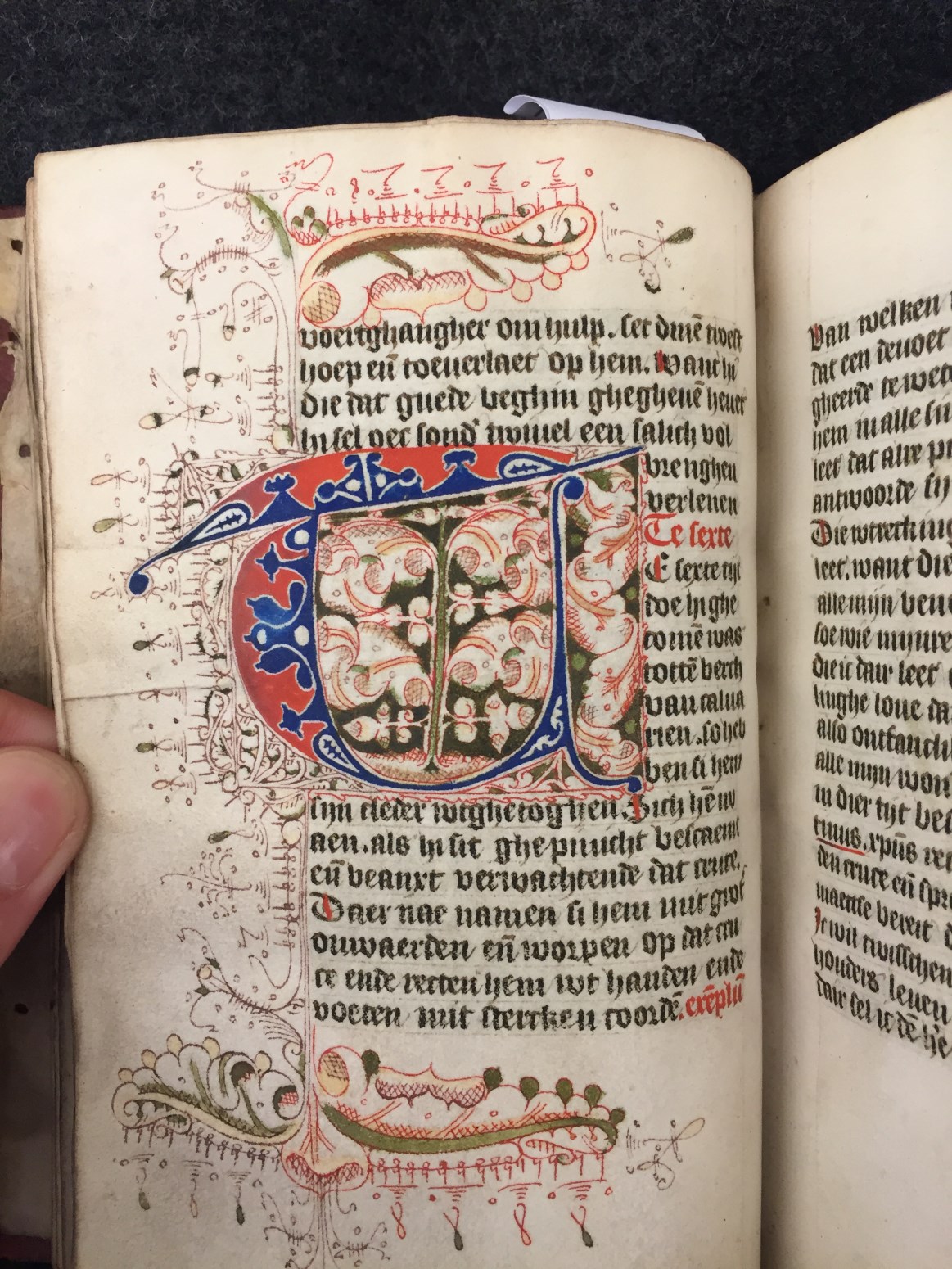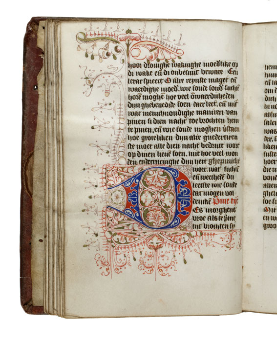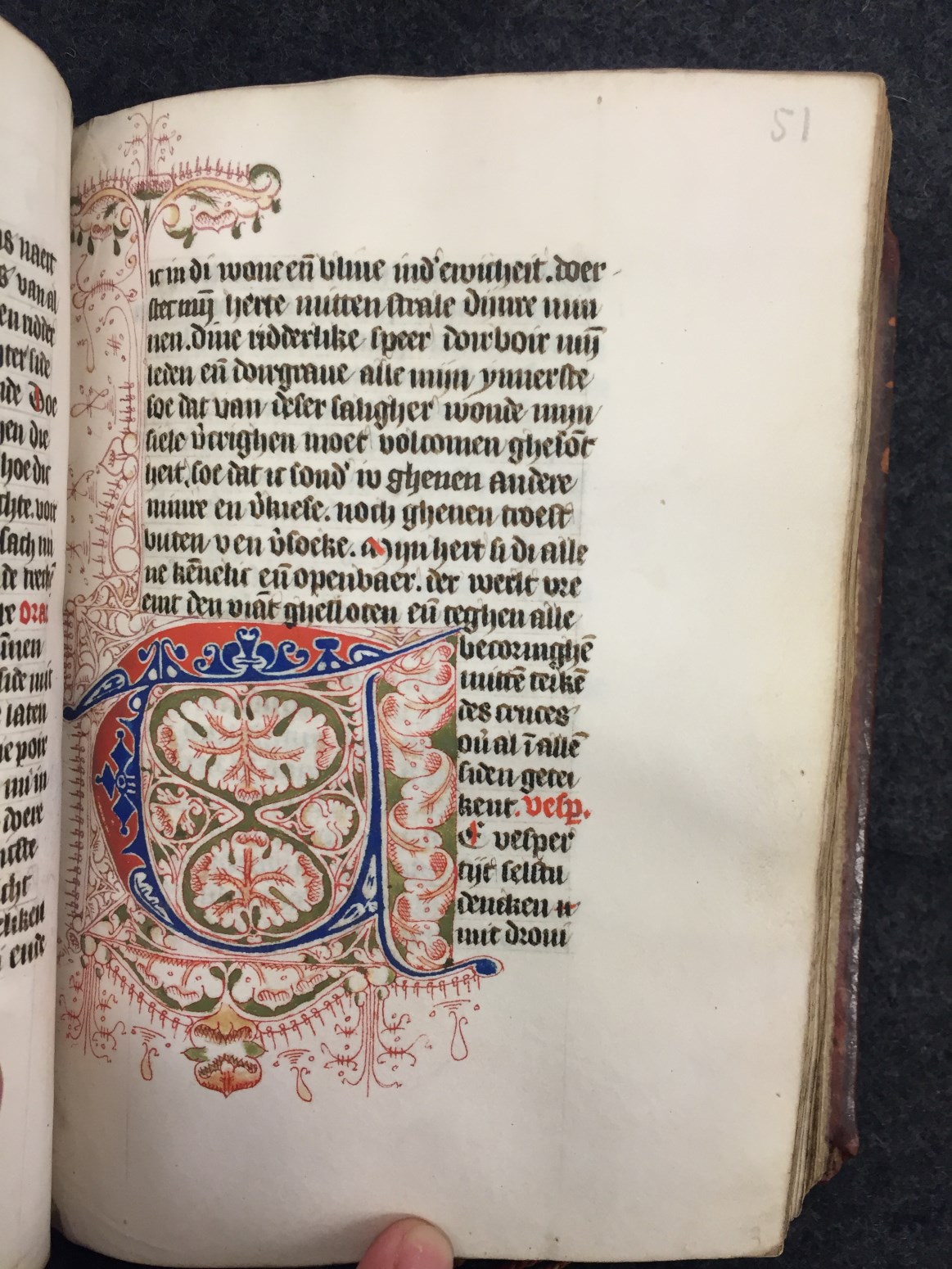 Een handschrift met Passie meditaties uit de Noordelijke-Nederlanden (mogelijk Haarlem) gemaakt rond 1480. Het boek werd gebruikt door de monniken van het Sint Antonius Boomgaardklooster. Bij het begin van een nieuwe hoofdtekst zien we zeer kunstig uitgewerkt Noord-Hollands penwerk, dat zich over vier marges uitspreidt, bij nieuwe hoofdstukken is de versiering eenvoudiger. Een bekend type ...