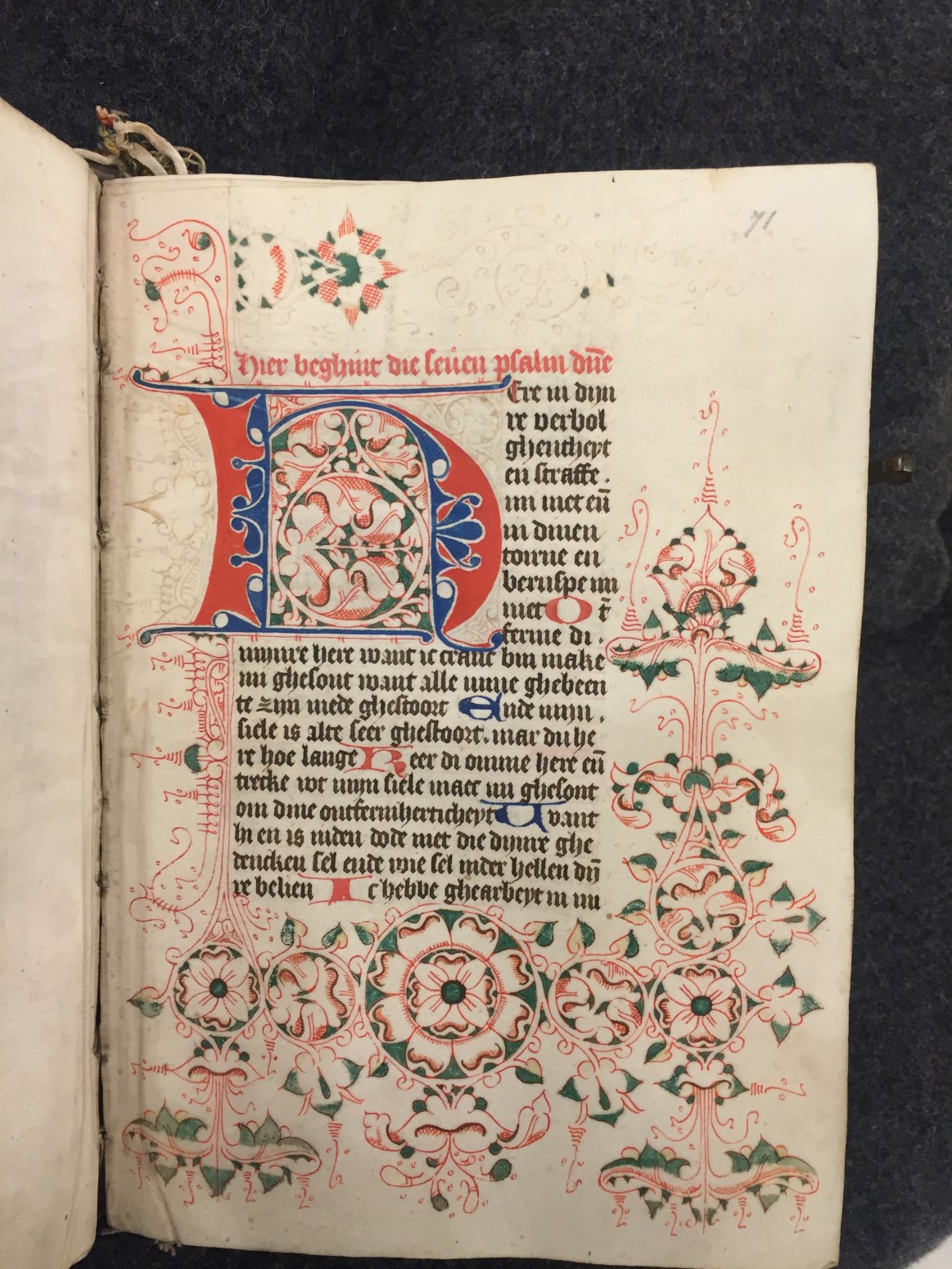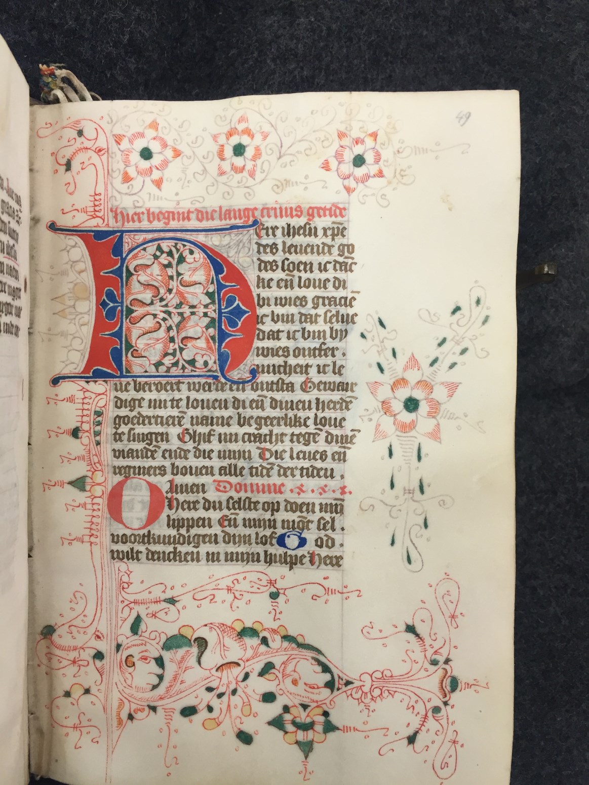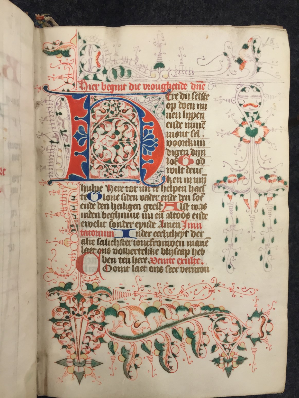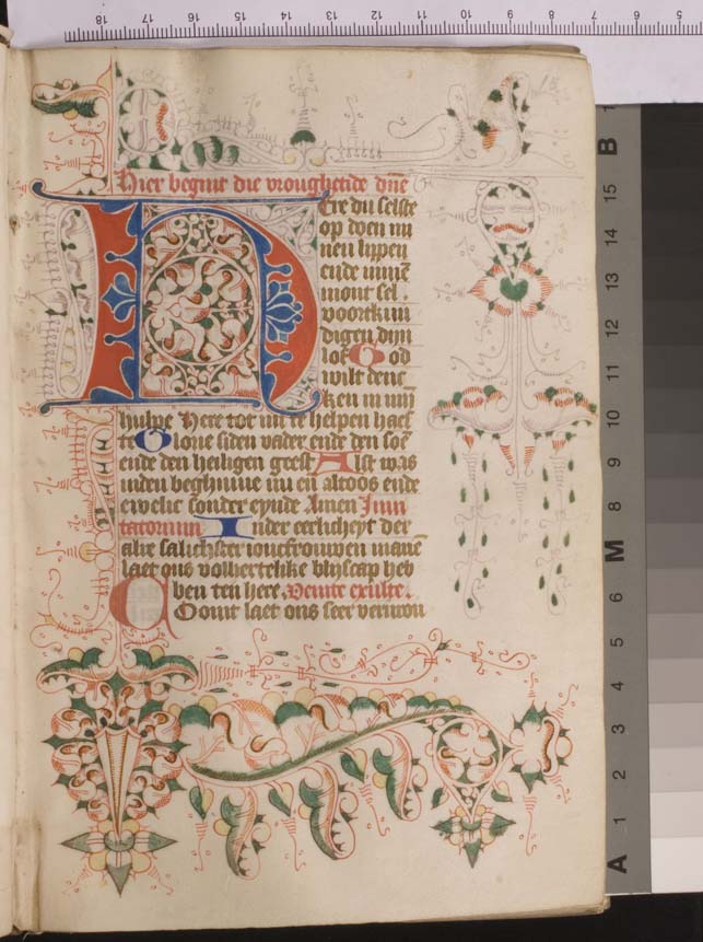 Bij het begin van een nieuwe hoofdtekst zien we zeer kunstig uitgewerkt Noord-Hollands penwerk, dat zich over vier marges uitspreidt, bij nieuwe hoofdstukken is de versiering eenvoudiger. Een bekend type is het Noordhollandse `doornen en steekjes' (of `prikkeldraad')-penwerk, waarin soms `maskertjes' of `tronies' verwerkt zijn. De grootste initialen, die de getijden openen, zijn in rood ...