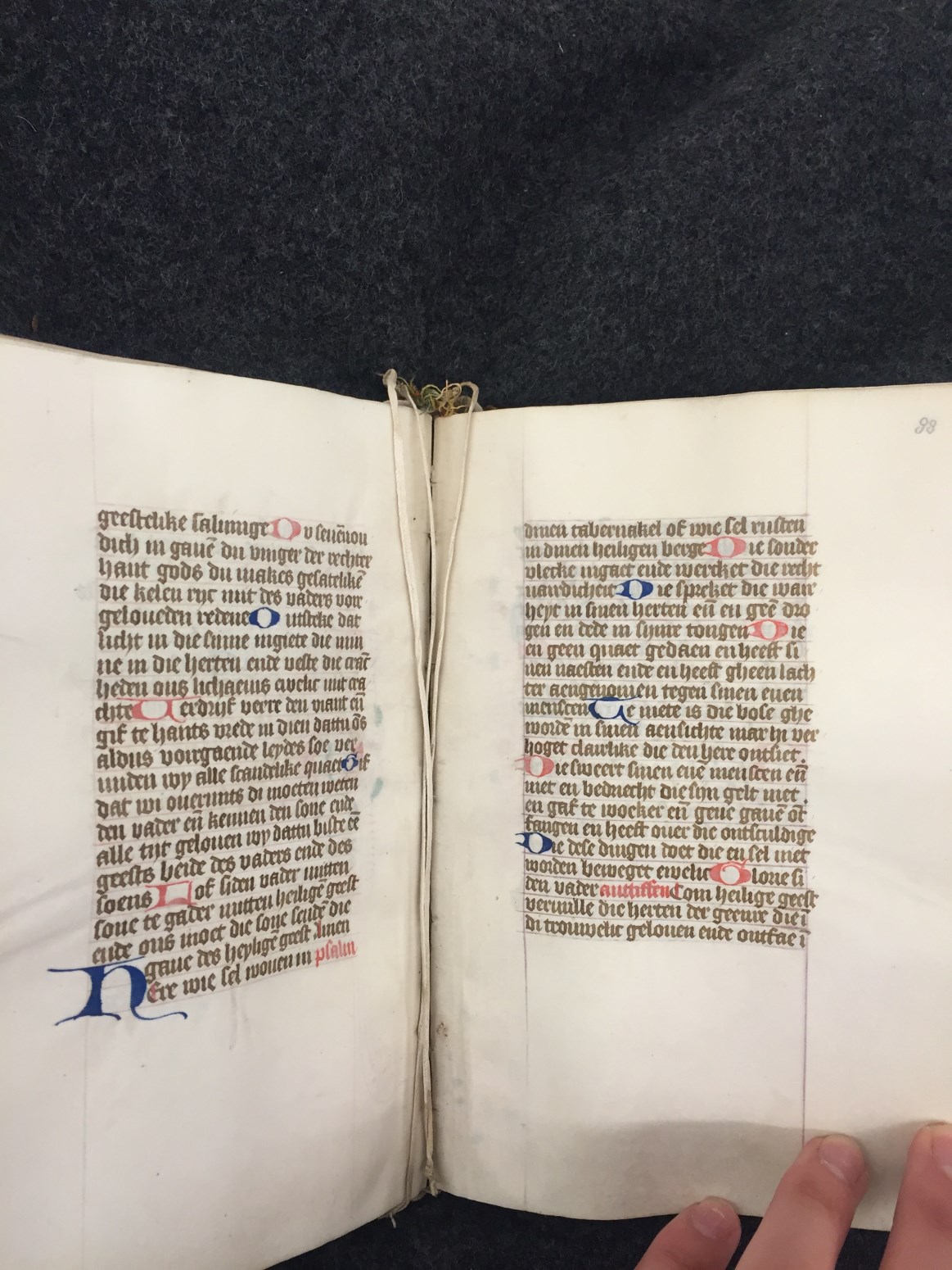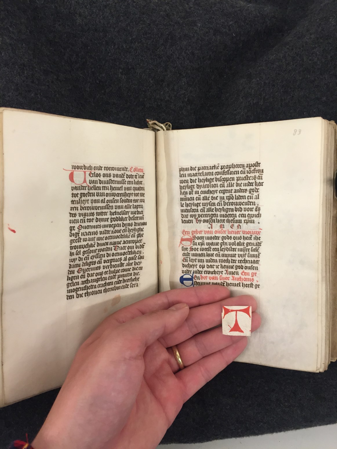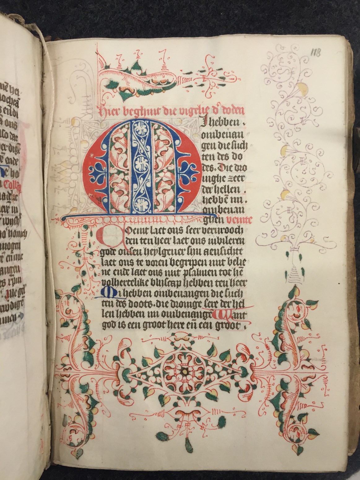 Bij het begin van een nieuwe hoofdtekst zien we zeer kunstig uitgewerkt Noord-Hollands penwerk, dat zich over vier marges uitspreidt, bij nieuwe hoofdstukken is de versiering eenvoudiger. Een bekend type is het Noordhollandse `doornen en steekjes' (of `prikkeldraad')-penwerk, waarin soms `maskertjes' of `tronies' verwerkt zijn. De grootste initialen, die de getijden openen, zijn in rood ...