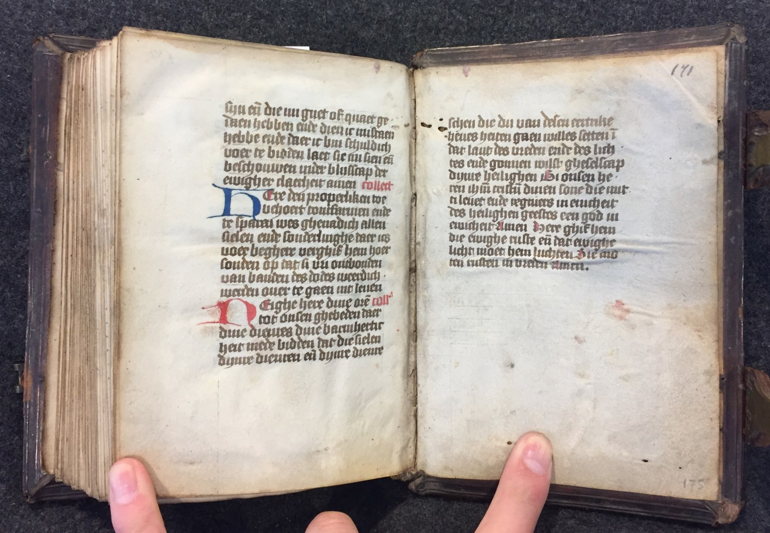 Een getijden- en gebedenboek uit de omgeving van Zwolle. Wüstefeld dateerde het handschrift in de tweede helft van de 15de eeuw, terwijl Gumbert omme nabij 1480 een plausibele conceptiedatum vond. Het op perkament geschreven handschrift telt 171 folia, bevat 1 gehistoriseerde initiaal (f. 15r, Maria Moeder Gods met Christus Kind in haar armen) en enkele ...
