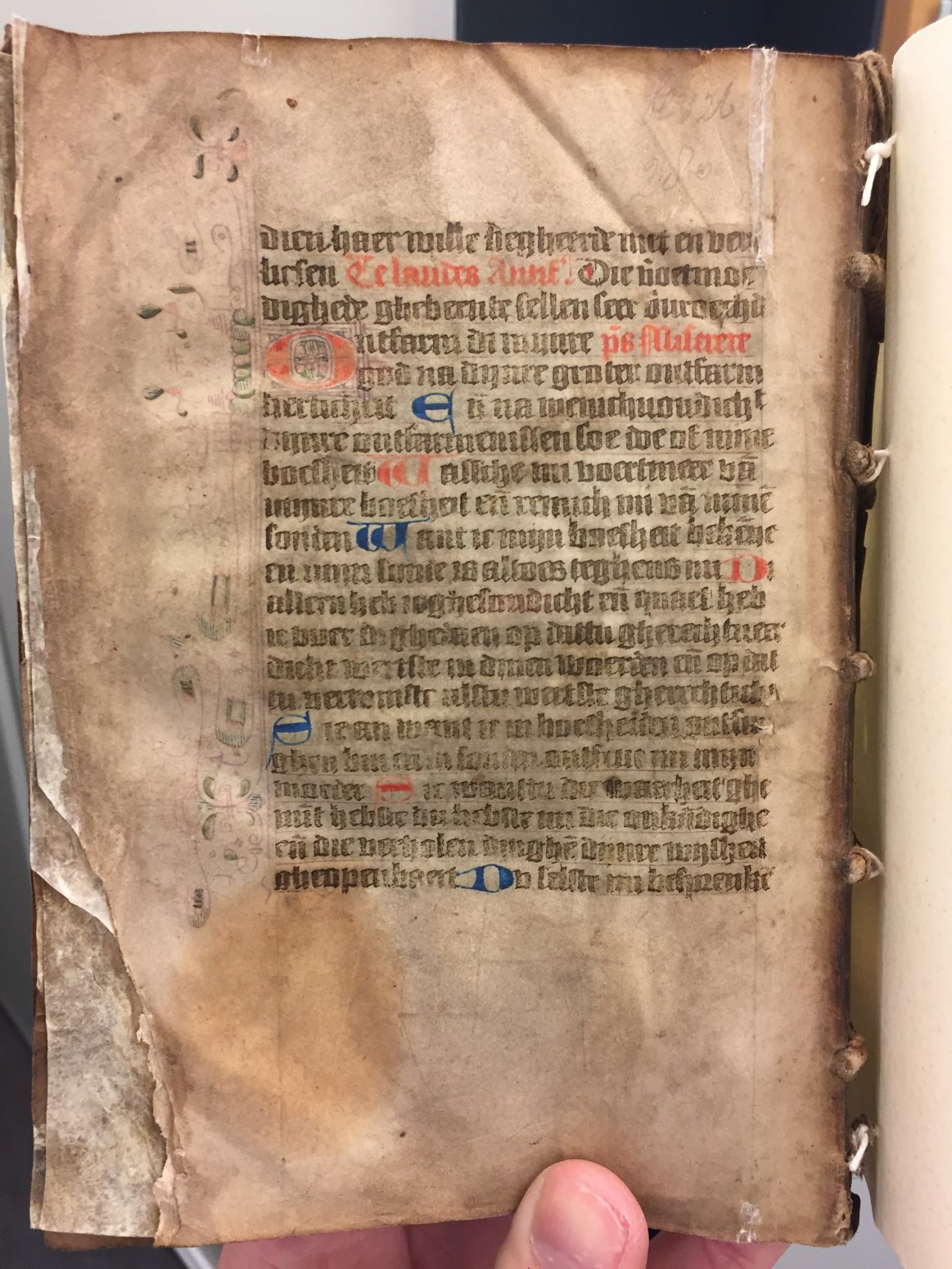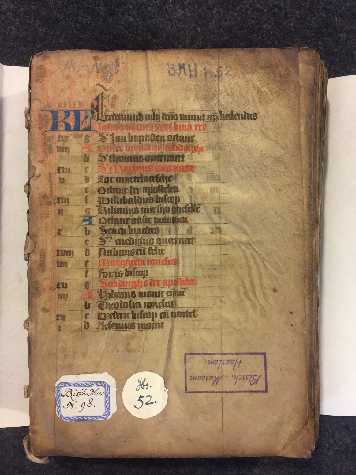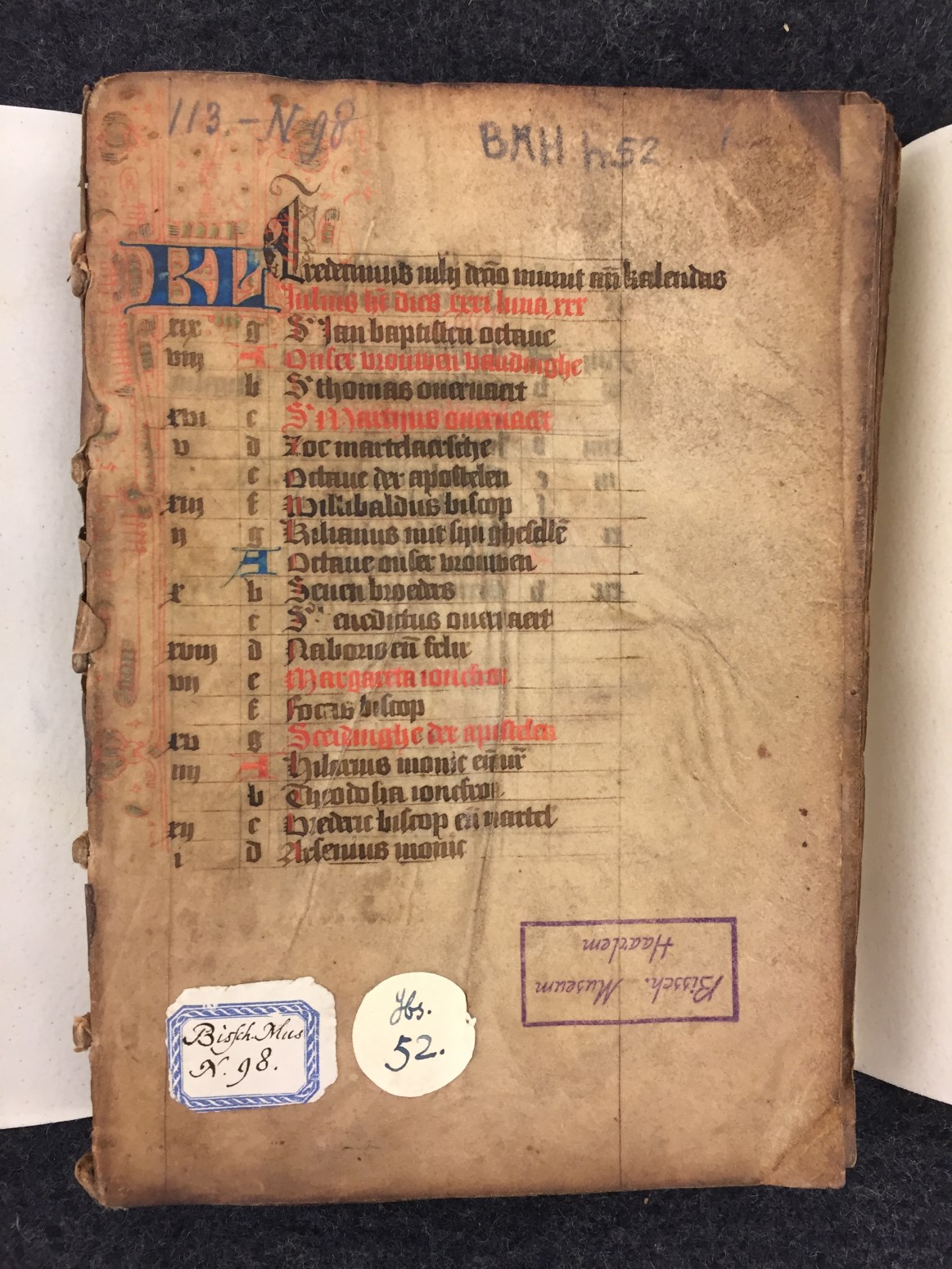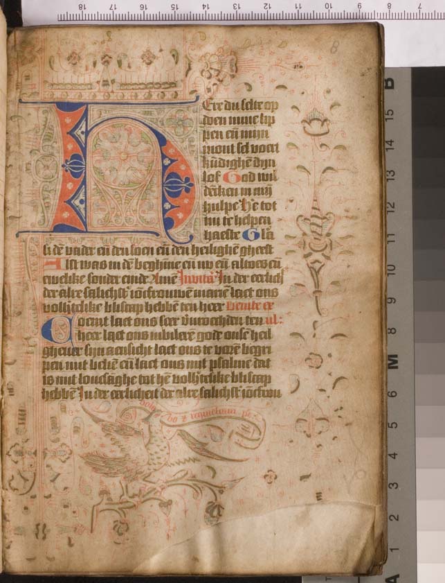 Dit getijden- en gebedenboek wordt geplaatst in het Haarlem van de tweede helft van de 15de eeuw. De kalender (die begint in juli, eerdere maanden ontbreken), is echter voor de Noord-Hollandse stad Hoorn bedoeld. Het handschrift bevat enkele grote penwerk initialen uitgevoerd in levendig rood en blauw. De florale randversieringen, die bijna elke pagina sieren, ...