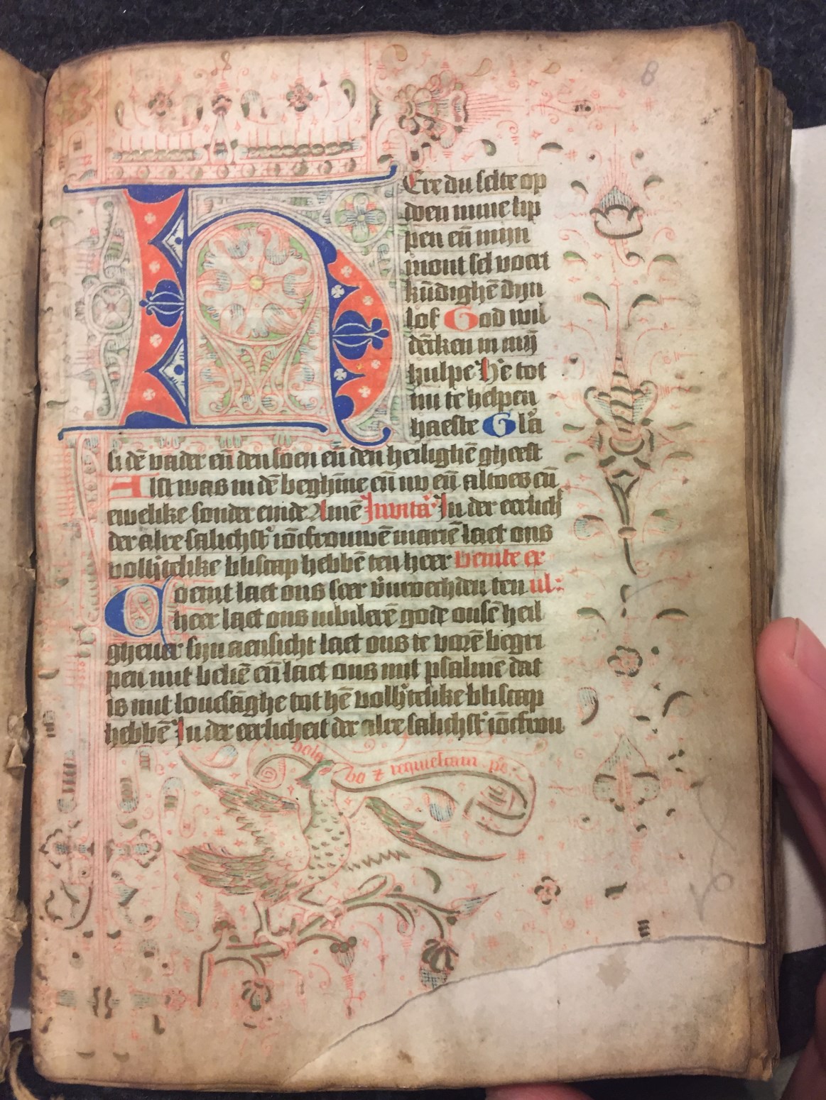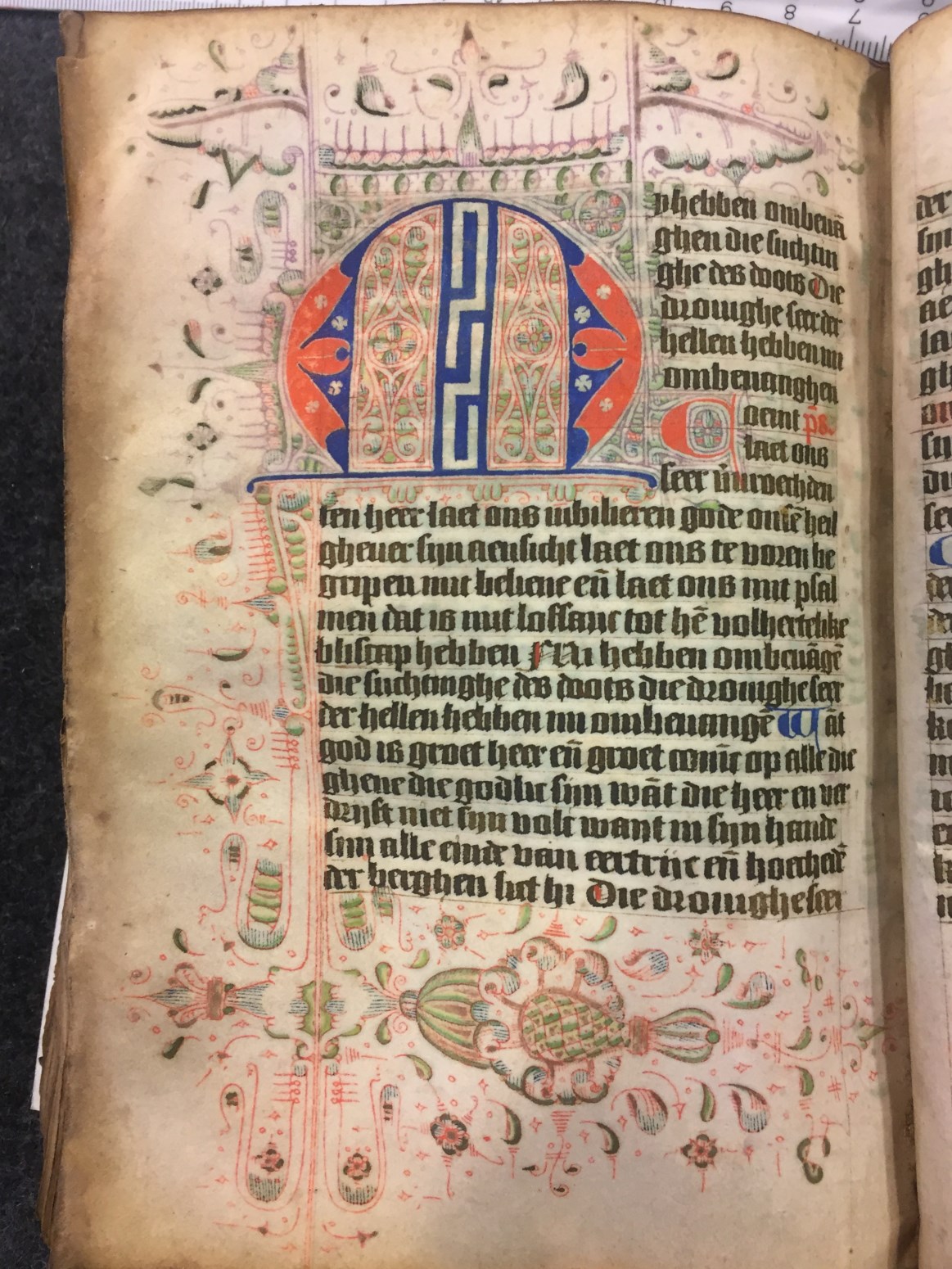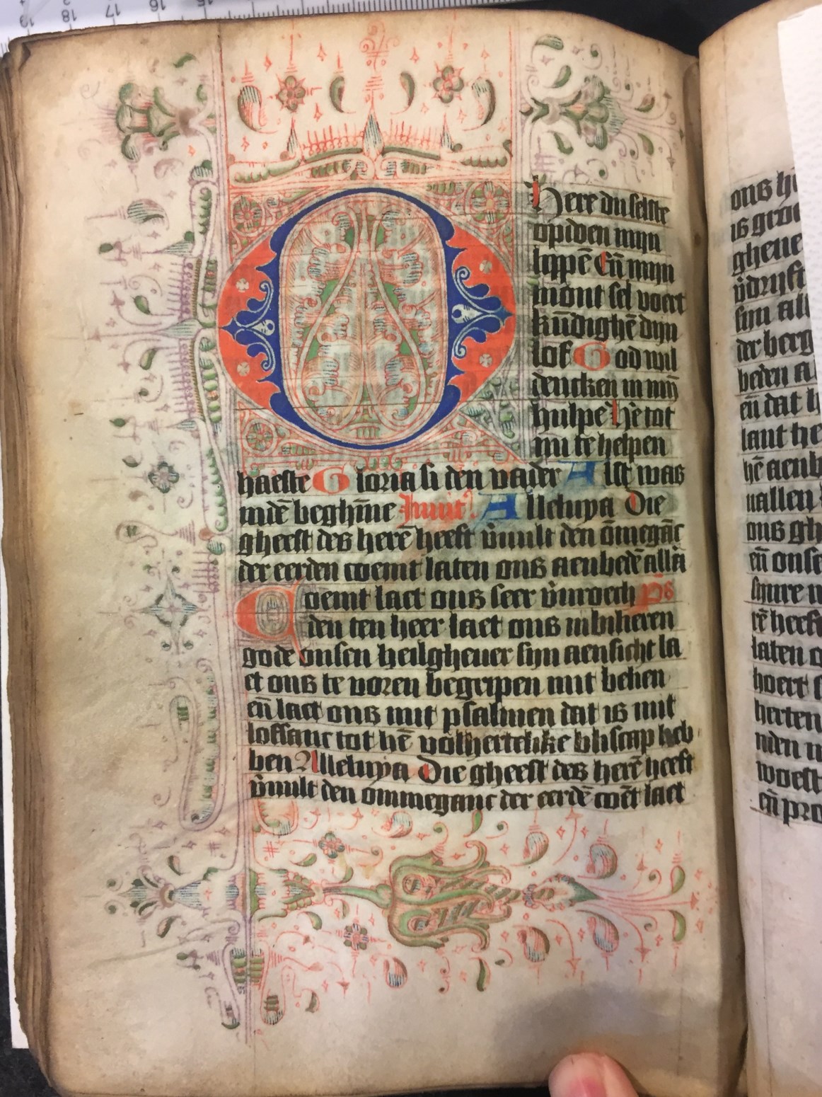 Dit getijden- en gebedenboek wordt geplaatst in het Haarlem van de tweede helft van de 15de eeuw. De kalender (die begint in juli, eerdere maanden ontbreken), is echter voor de Noord-Hollandse stad Hoorn bedoeld. Het handschrift bevat enkele grote penwerk initialen uitgevoerd in levendig rood en blauw. De florale randversieringen, die bijna elke pagina sieren, ...