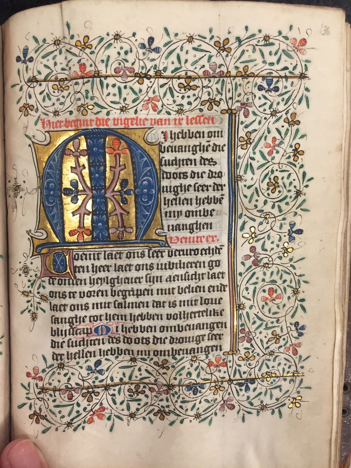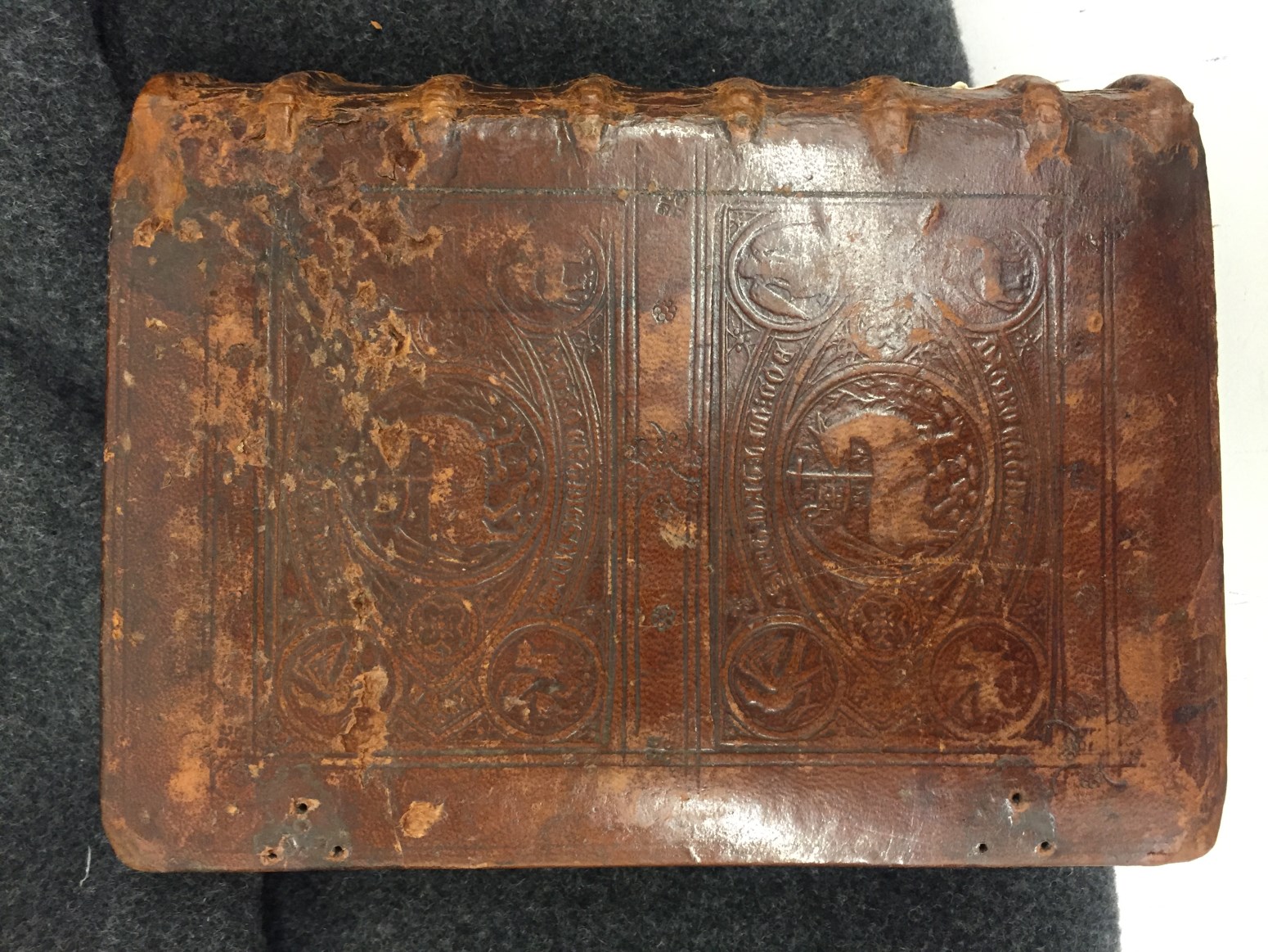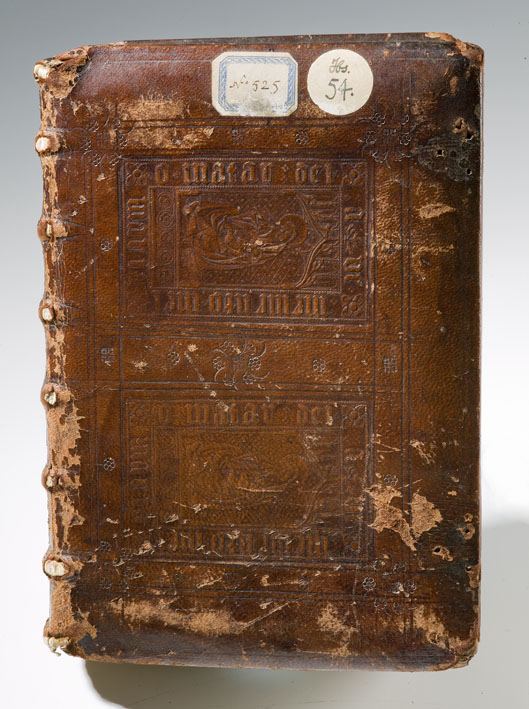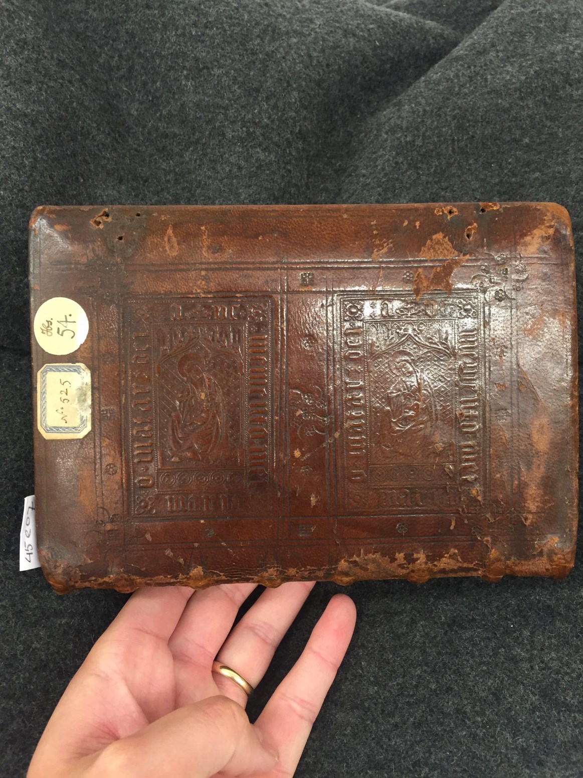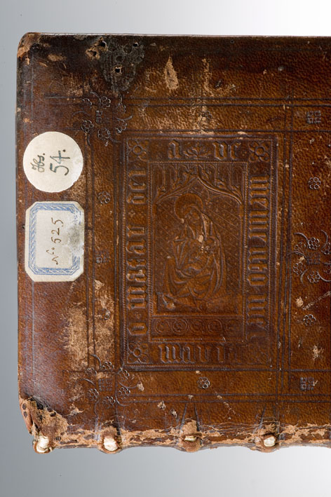 Dit handschrift is nog gebonden in de originele boekband met op de voorzijde een paneelstempel van Moeder en Kind, terwijl op de achterzijde een Lam Godsstempel met kruisbannier staat gedrukt. De beide stempels worden omgeven door kleine stempeltjes van bloemen en halve cirkels, hetgeen gezamenlijk wijst op een Noordhollandse oorsprong. Deze herkomst wordt nog eens ...