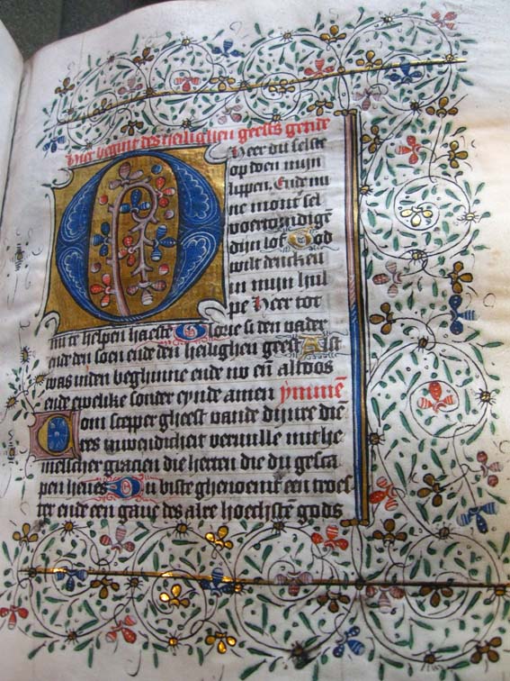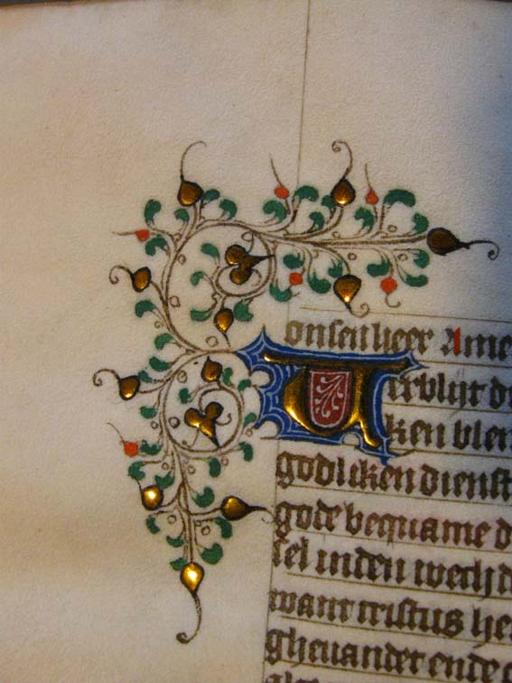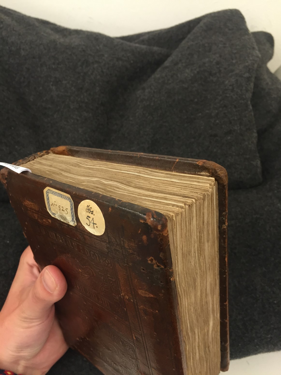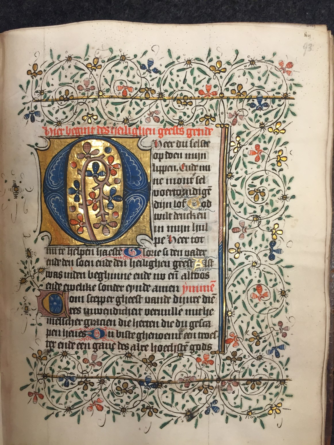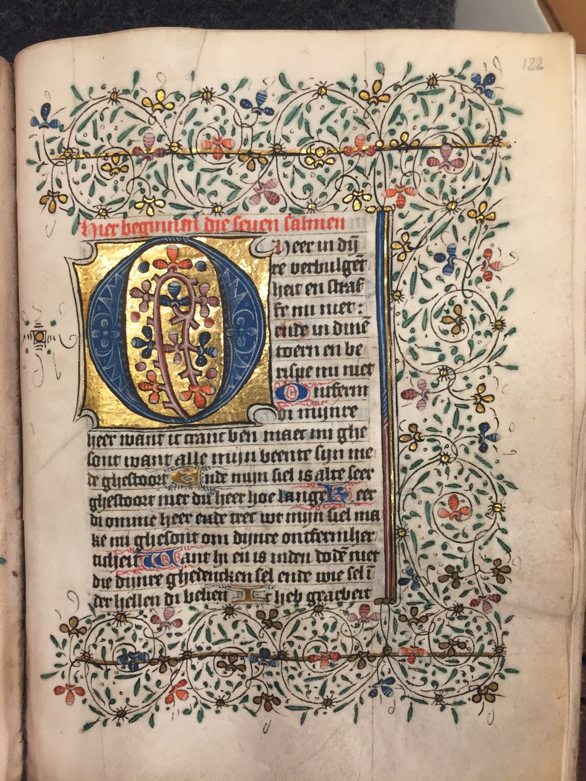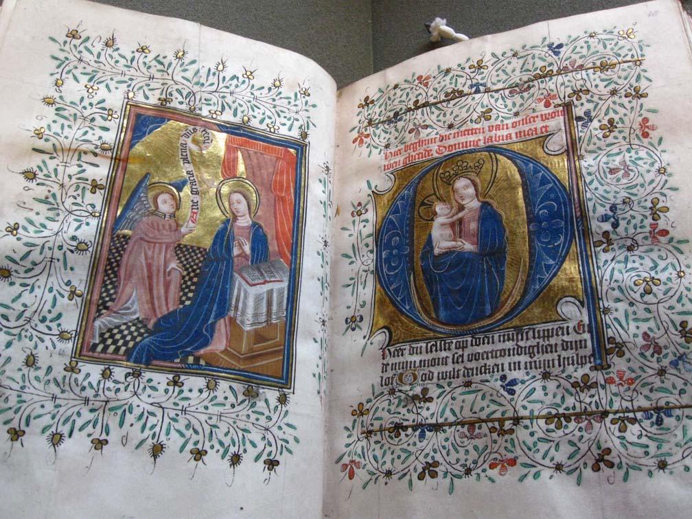 Dit handschrift is nog gebonden in de originele boekband met op de voorzijde een paneelstempel van Moeder en Kind, terwijl op de achterzijde een Lam Godsstempel met kruisbannier staat gedrukt. De beide stempels worden omgeven door kleine stempeltjes van bloemen en halve cirkels, hetgeen gezamenlijk wijst op een Noordhollandse oorsprong. Deze herkomst wordt nog eens ...