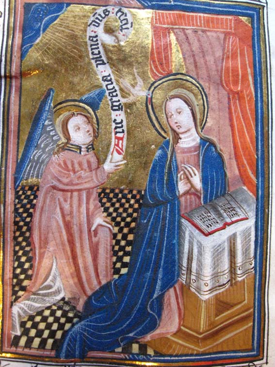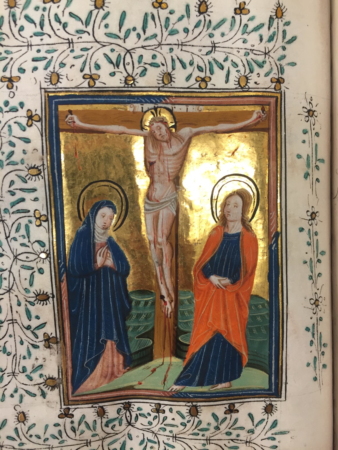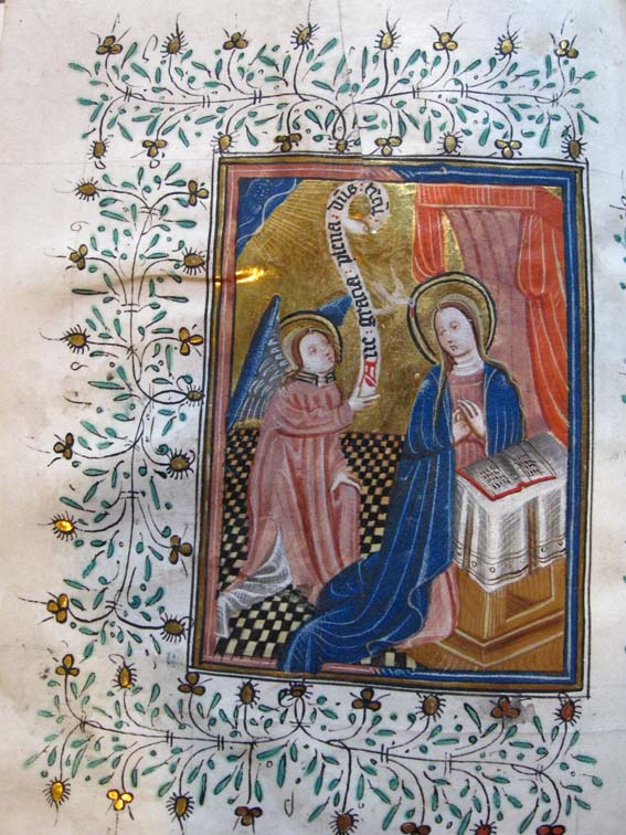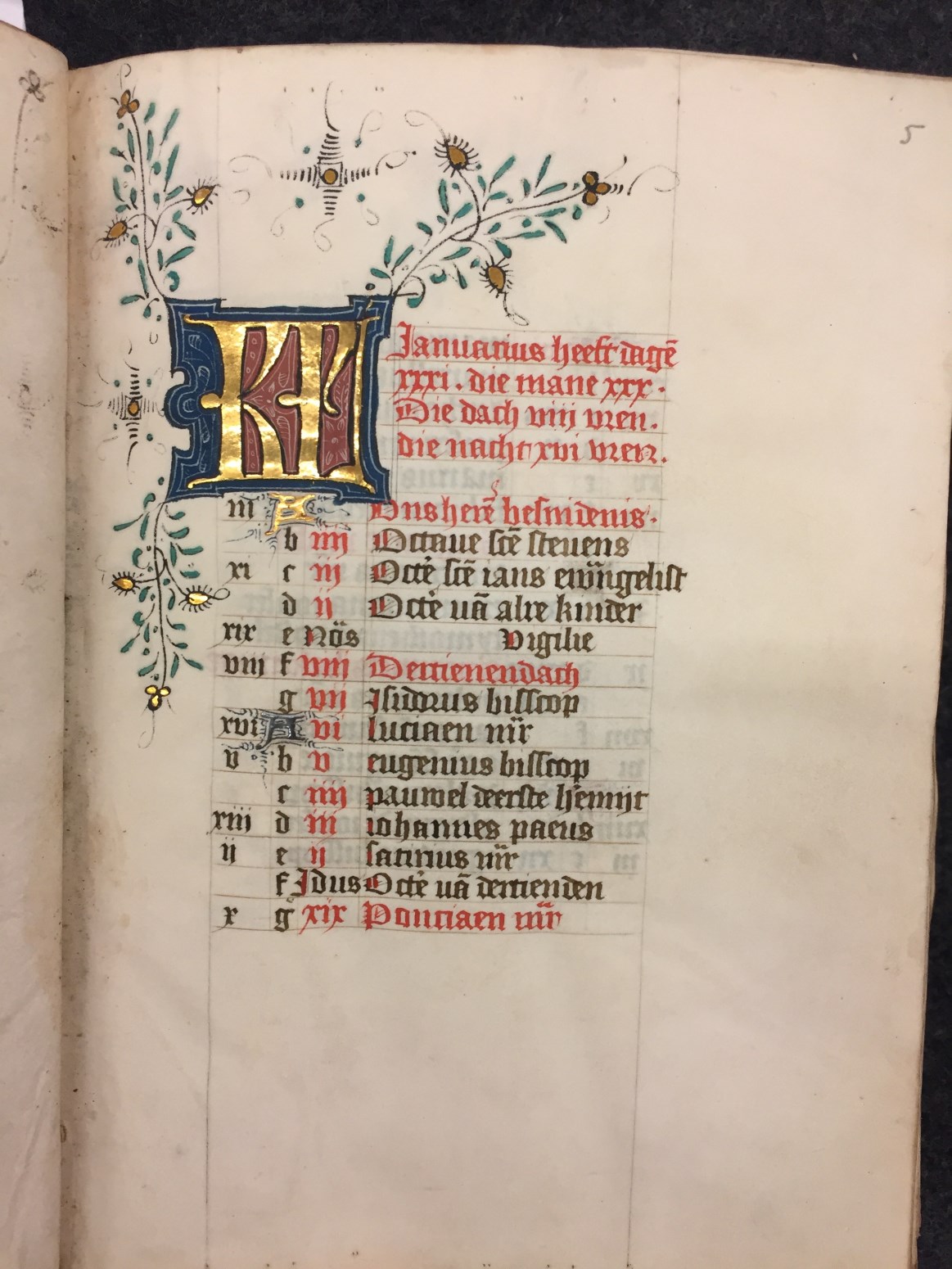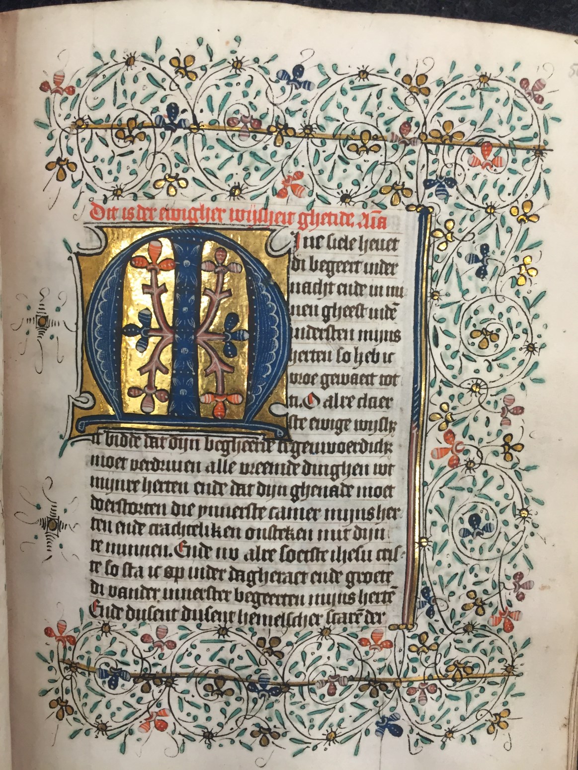 Dit handschrift is nog gebonden in de originele boekband met op de voorzijde een paneelstempel van Moeder en Kind, terwijl op de achterzijde een Lam Godsstempel met kruisbannier staat gedrukt. De beide stempels worden omgeven door kleine stempeltjes van bloemen en halve cirkels, hetgeen gezamenlijk wijst op een Noordhollandse oorsprong. Deze herkomst wordt nog eens ...