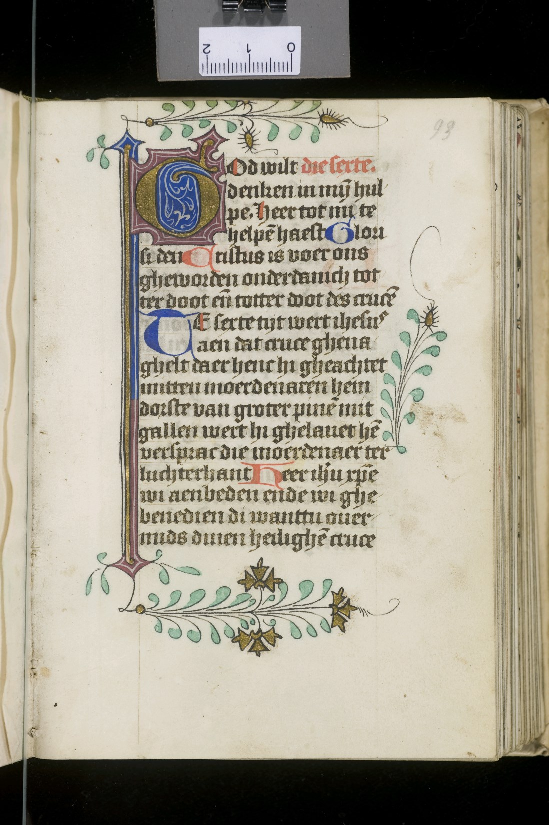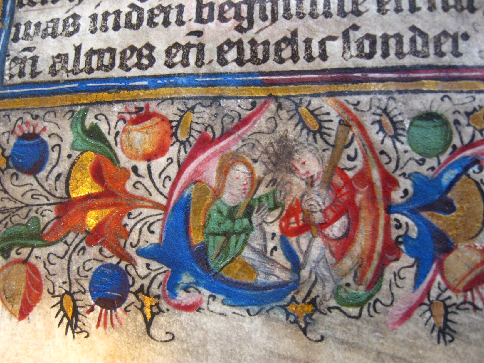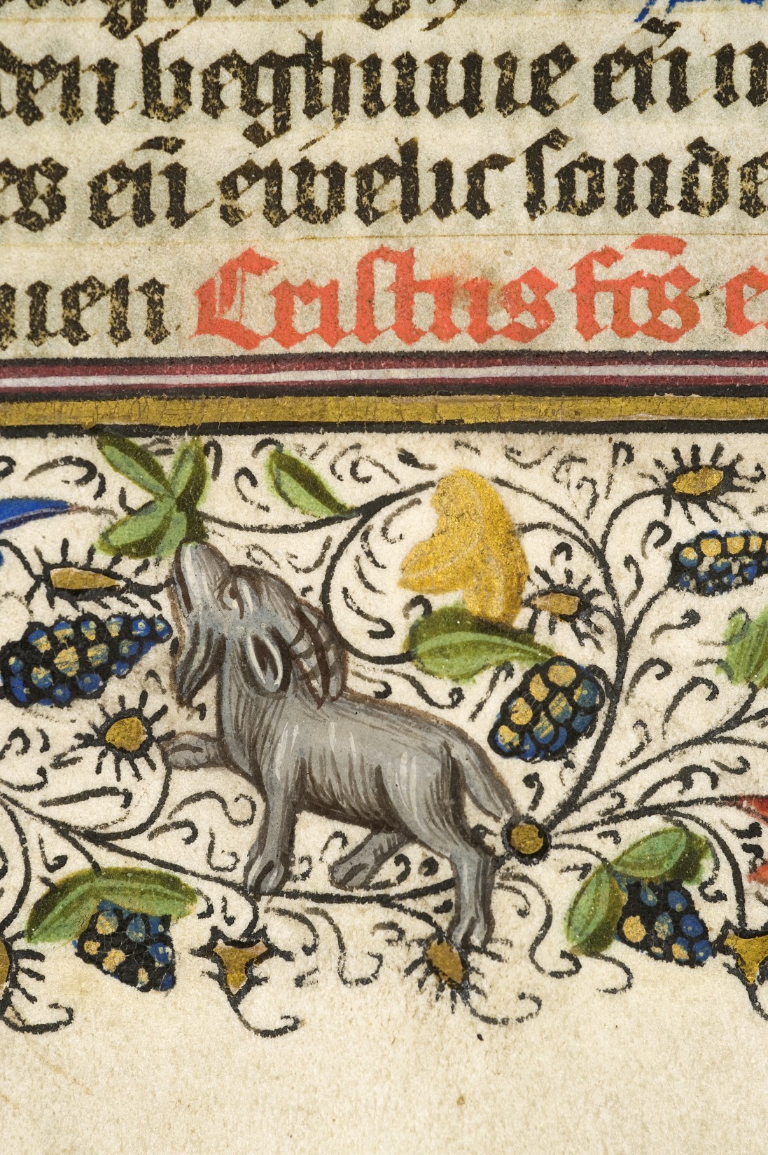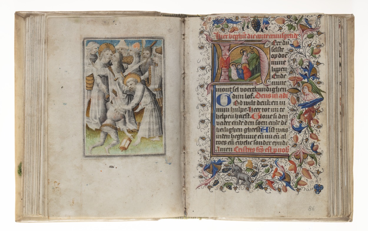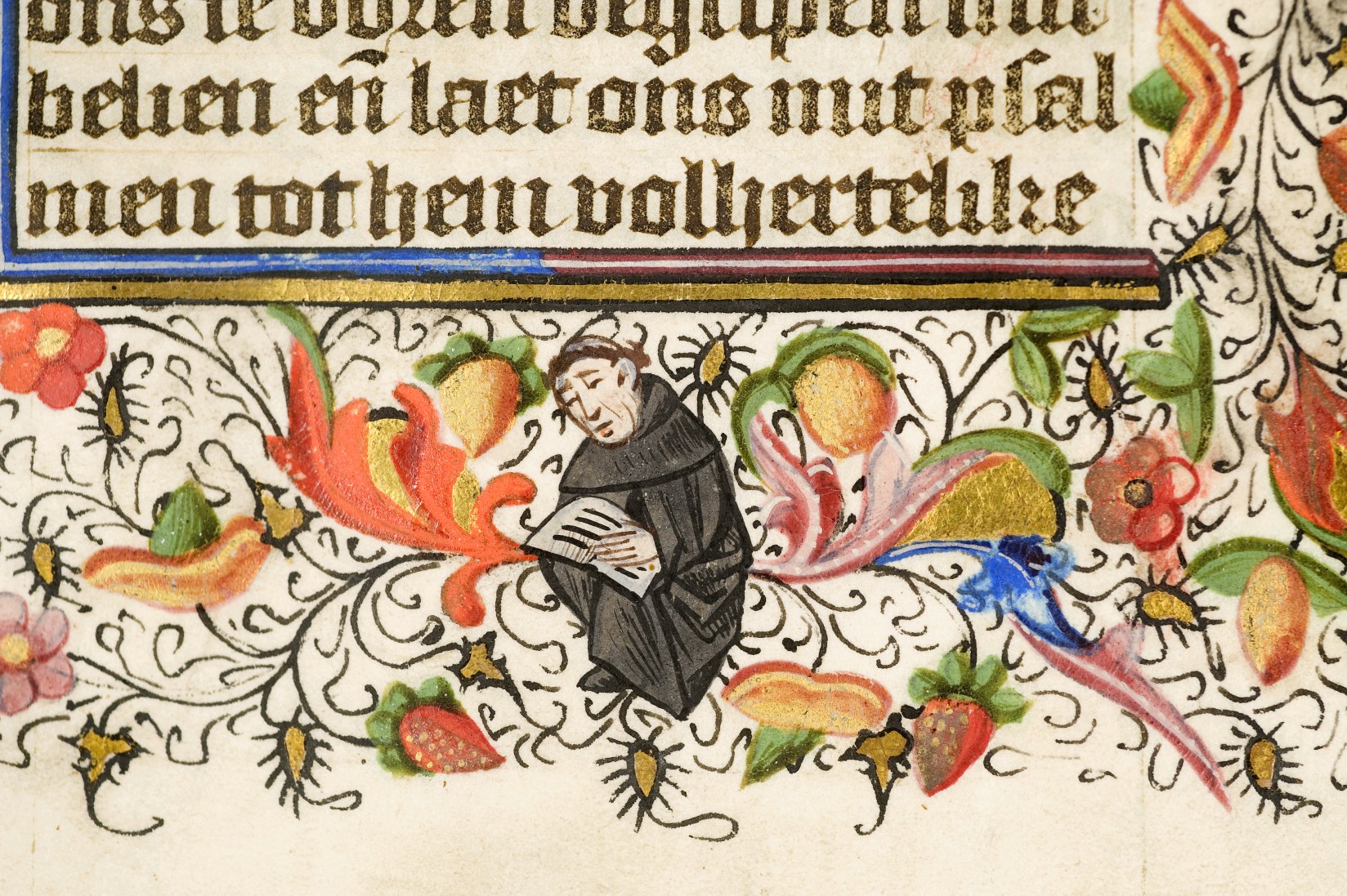 Dat het handschrift waarschijnlijk in Holland geschreven is, kunnen we afleiden uit het feit dat Jeroen in de kalender in rood vermeld staat. Opmerkelijk is echter dat de randversiering afkomstig is van een der zogenaamde Meesters van de Bostonse `Stad Gods', actief in Utrecht in de jaren 1460-1470. De kleurrijke versiering rond staaflijsten van inktlijnen ...