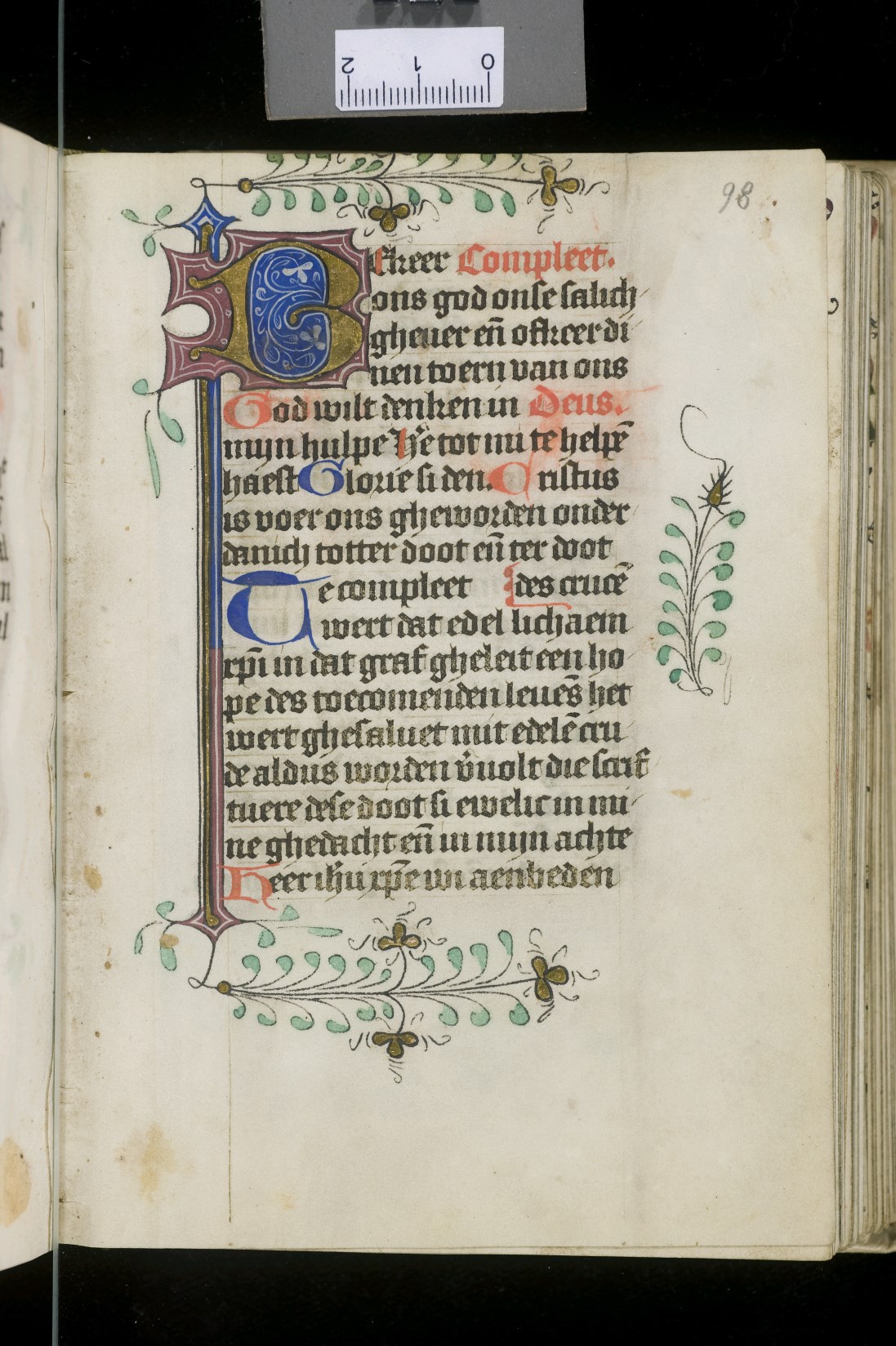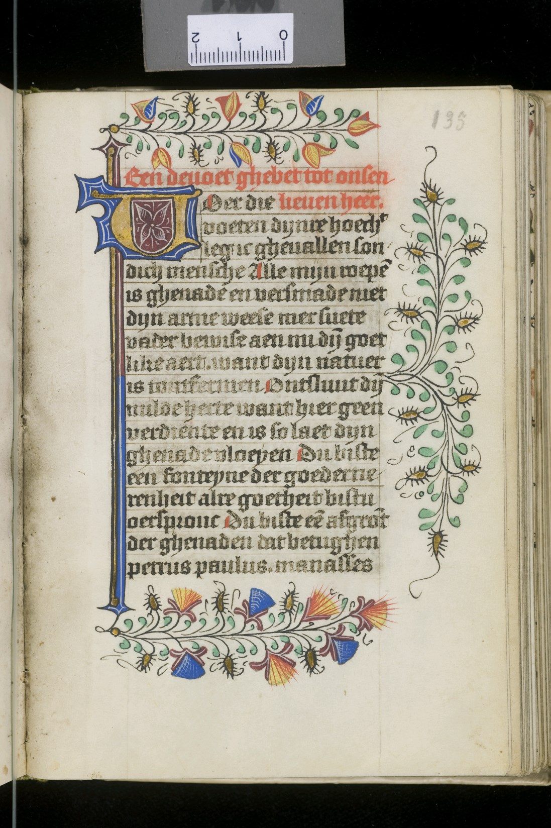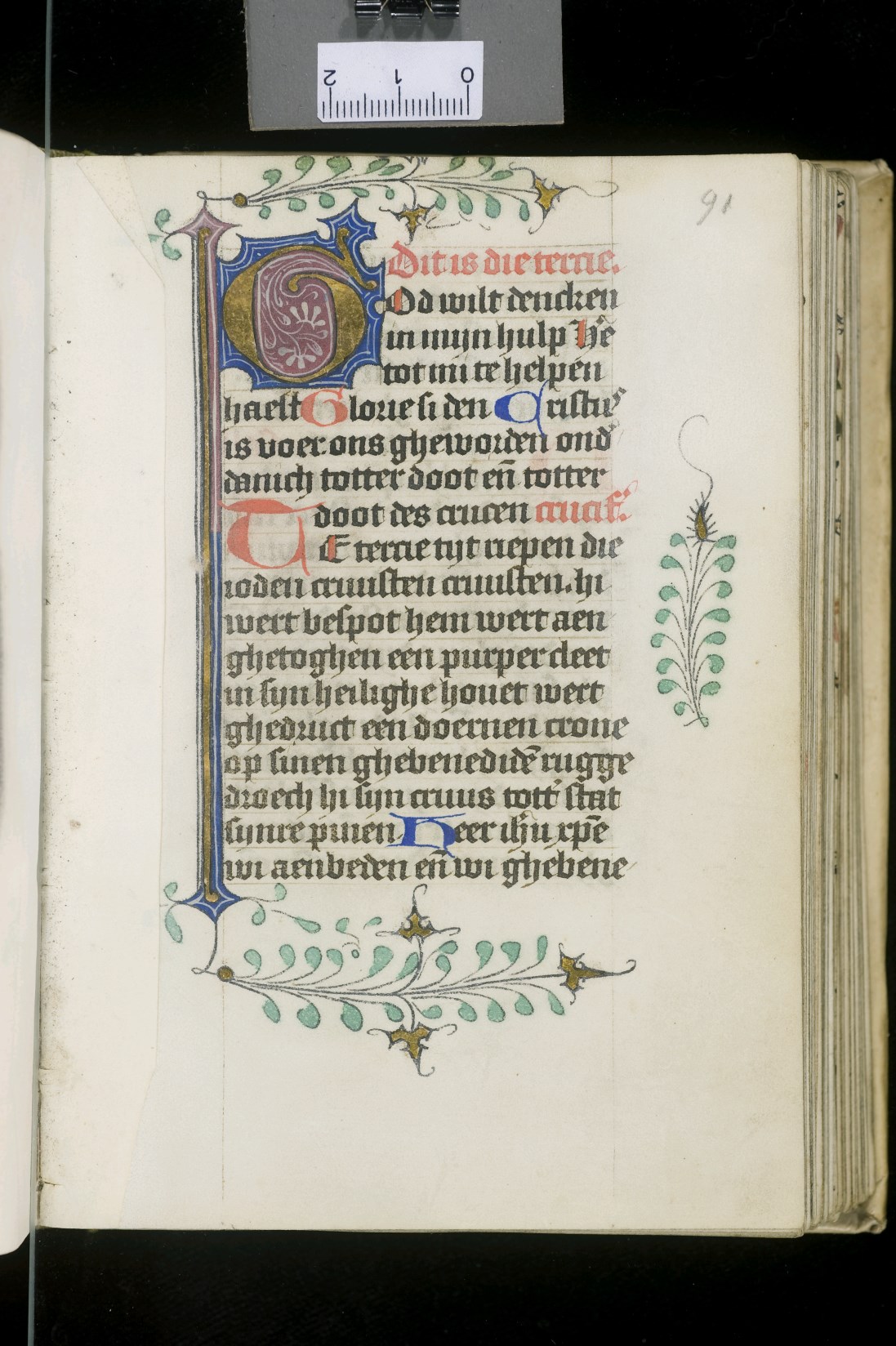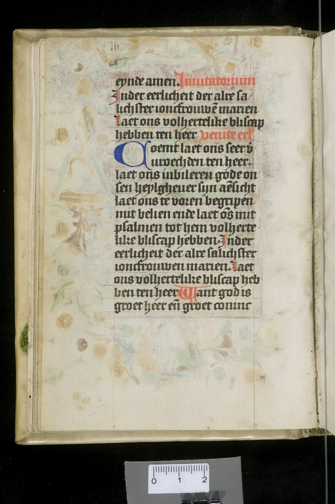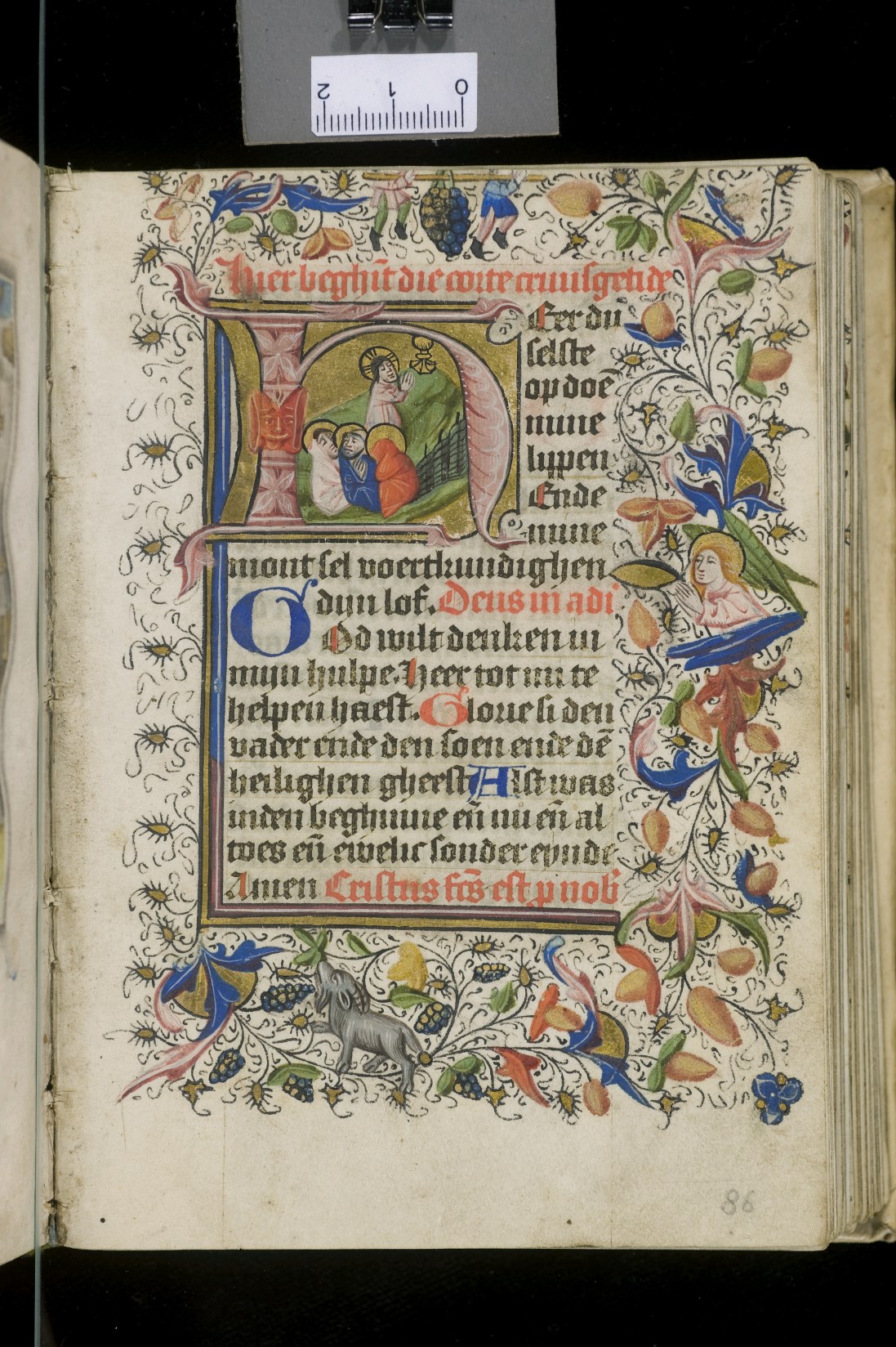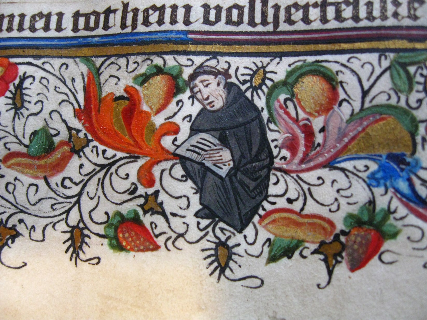 Dat het handschrift waarschijnlijk in Holland geschreven is, kunnen we afleiden uit het feit dat Jeroen in de kalender in rood vermeld staat. Opmerkelijk is echter dat de randversiering afkomstig is van een der zogenaamde Meesters van de Bostonse `Stad Gods', actief in Utrecht in de jaren 1460-1470. De kleurrijke versiering rond staaflijsten van inktlijnen ...