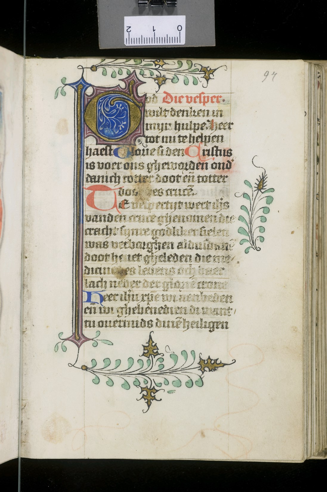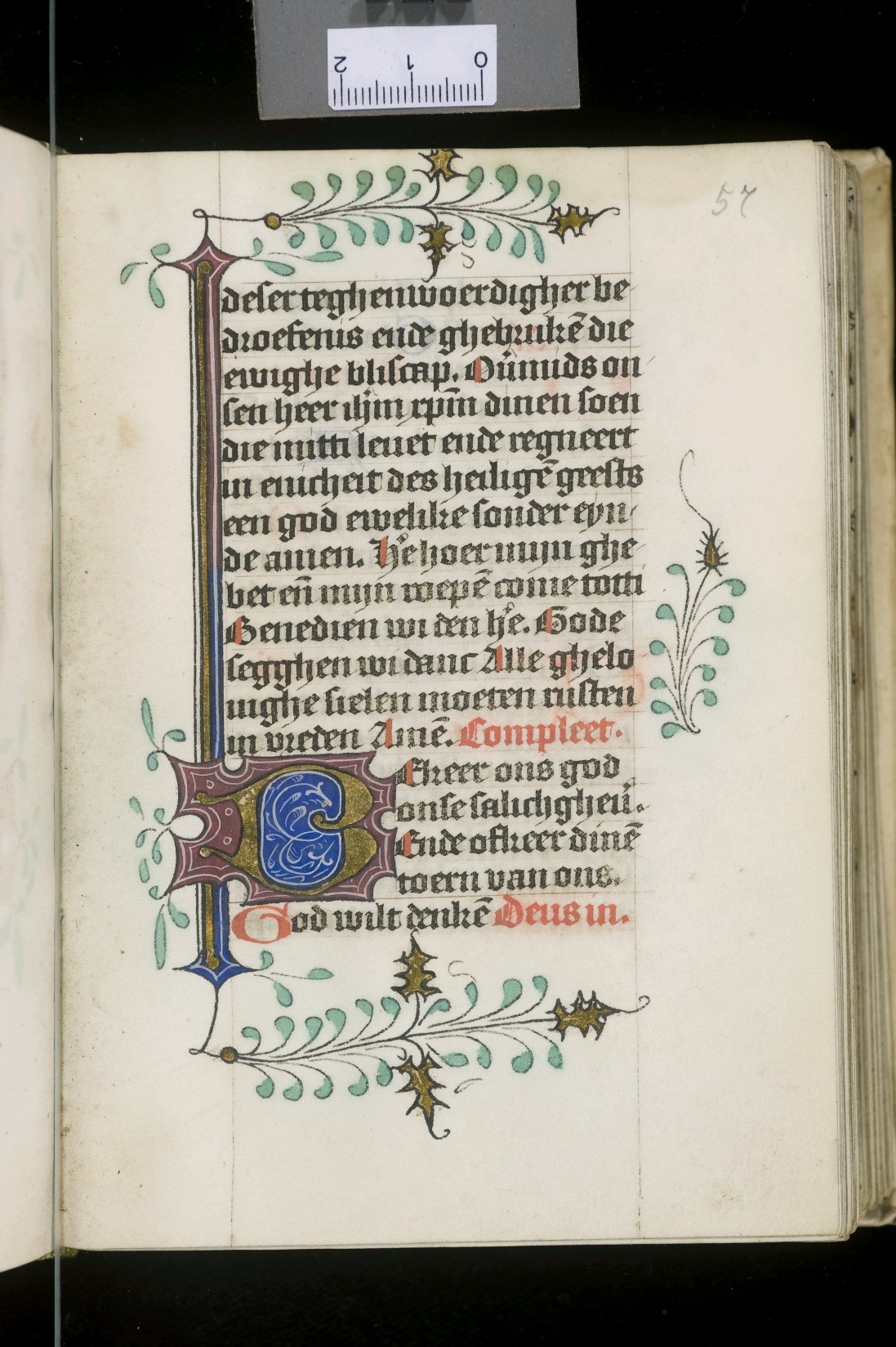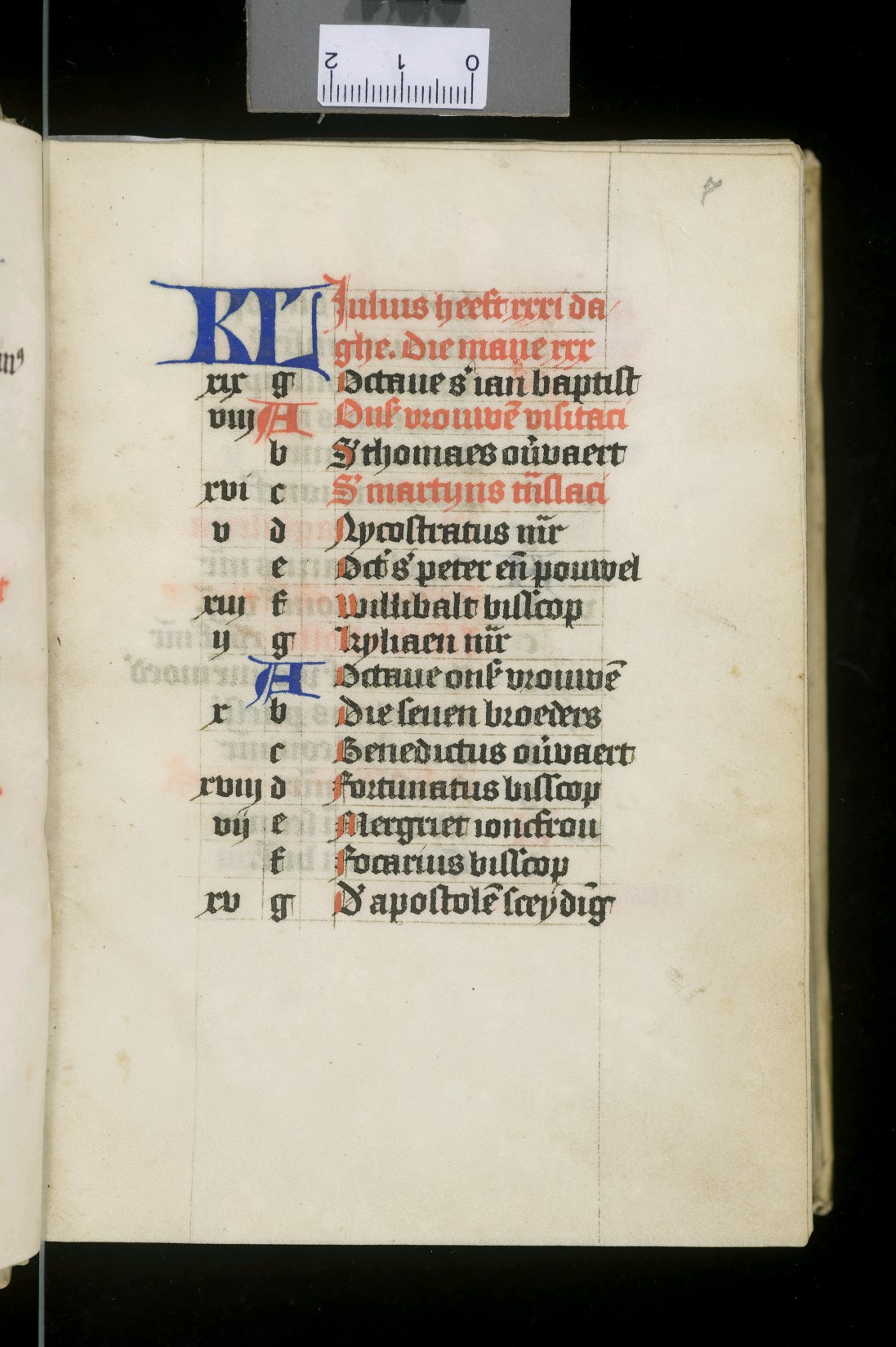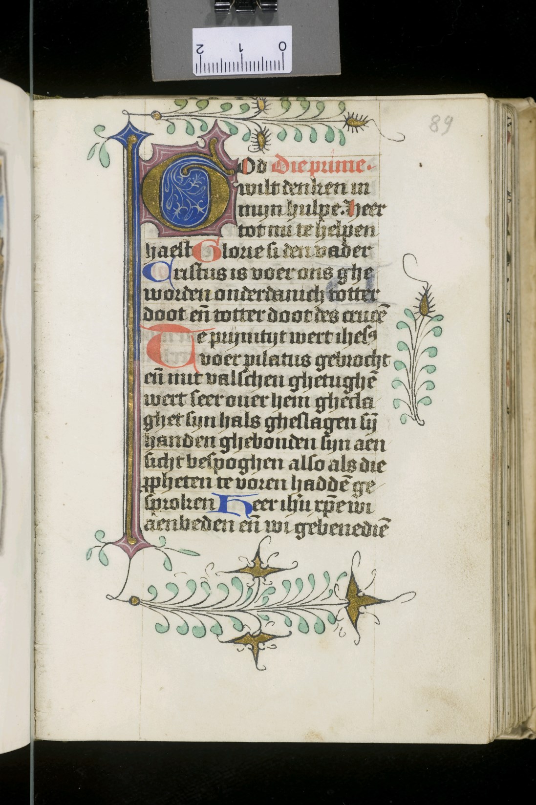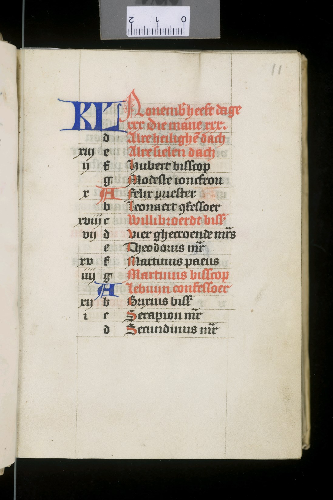 Dat het handschrift waarschijnlijk in Holland geschreven is, kunnen we afleiden uit het feit dat Jeroen in de kalender in rood vermeld staat. Opmerkelijk is echter dat de randversiering afkomstig is van een der zogenaamde Meesters van de Bostonse `Stad Gods', actief in Utrecht in de jaren 1460-1470. De kleurrijke versiering rond staaflijsten van inktlijnen ...