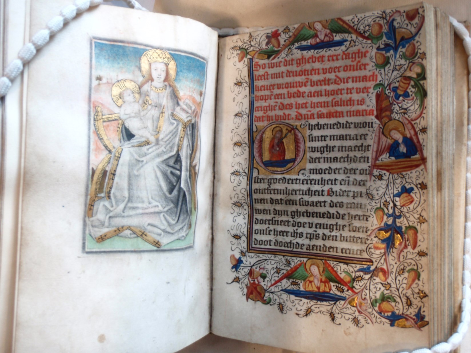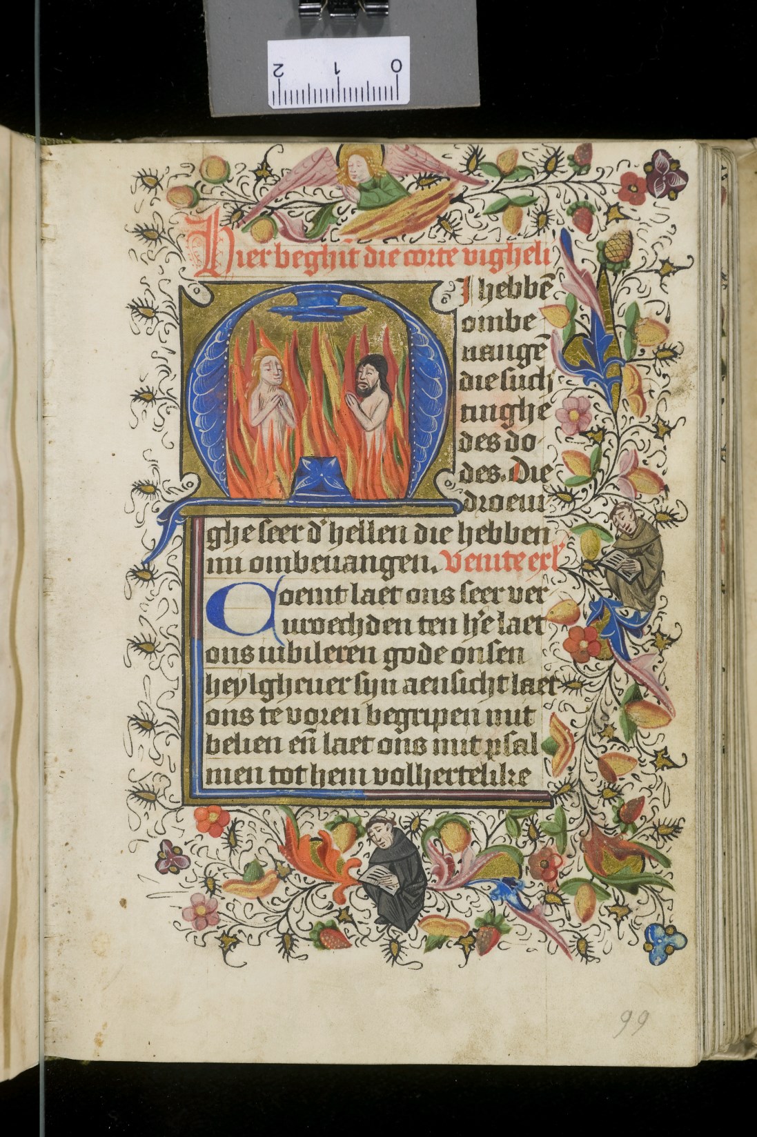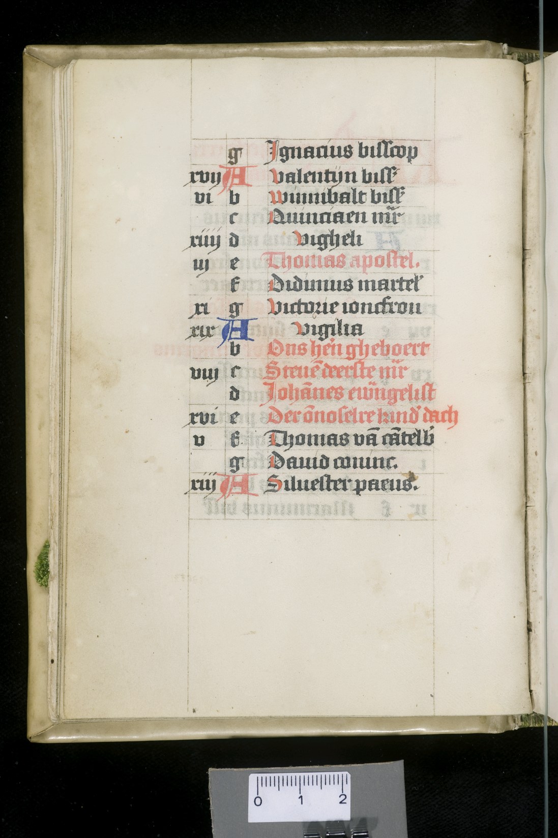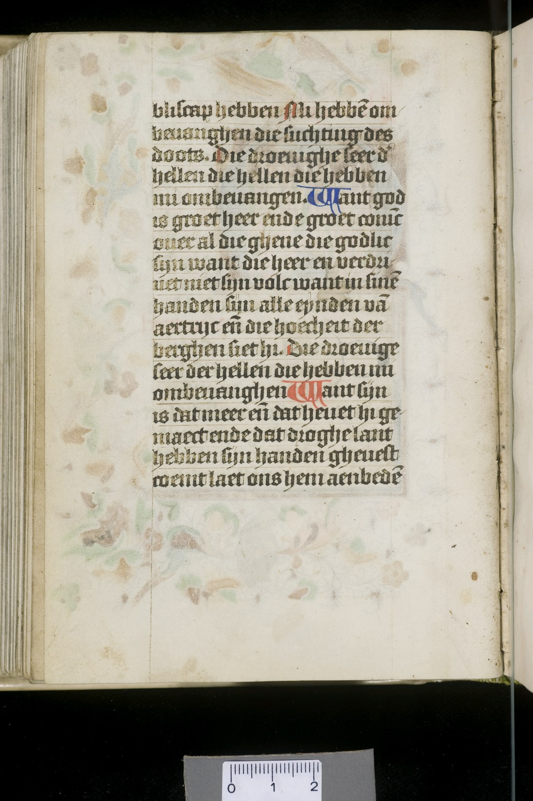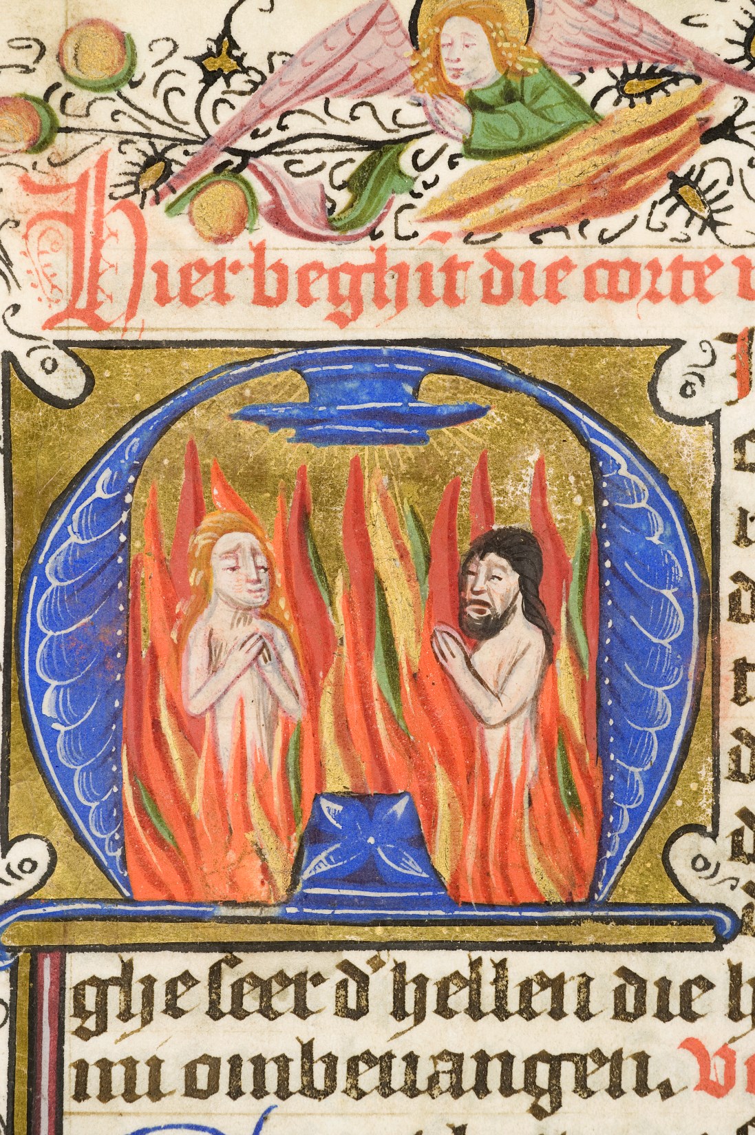 Dat het handschrift waarschijnlijk in Holland geschreven is, kunnen we afleiden uit het feit dat Jeroen in de kalender in rood vermeld staat. Opmerkelijk is echter dat de randversiering afkomstig is van een der zogenaamde Meesters van de Bostonse `Stad Gods', actief in Utrecht in de jaren 1460-1470. De kleurrijke versiering rond staaflijsten van inktlijnen ...