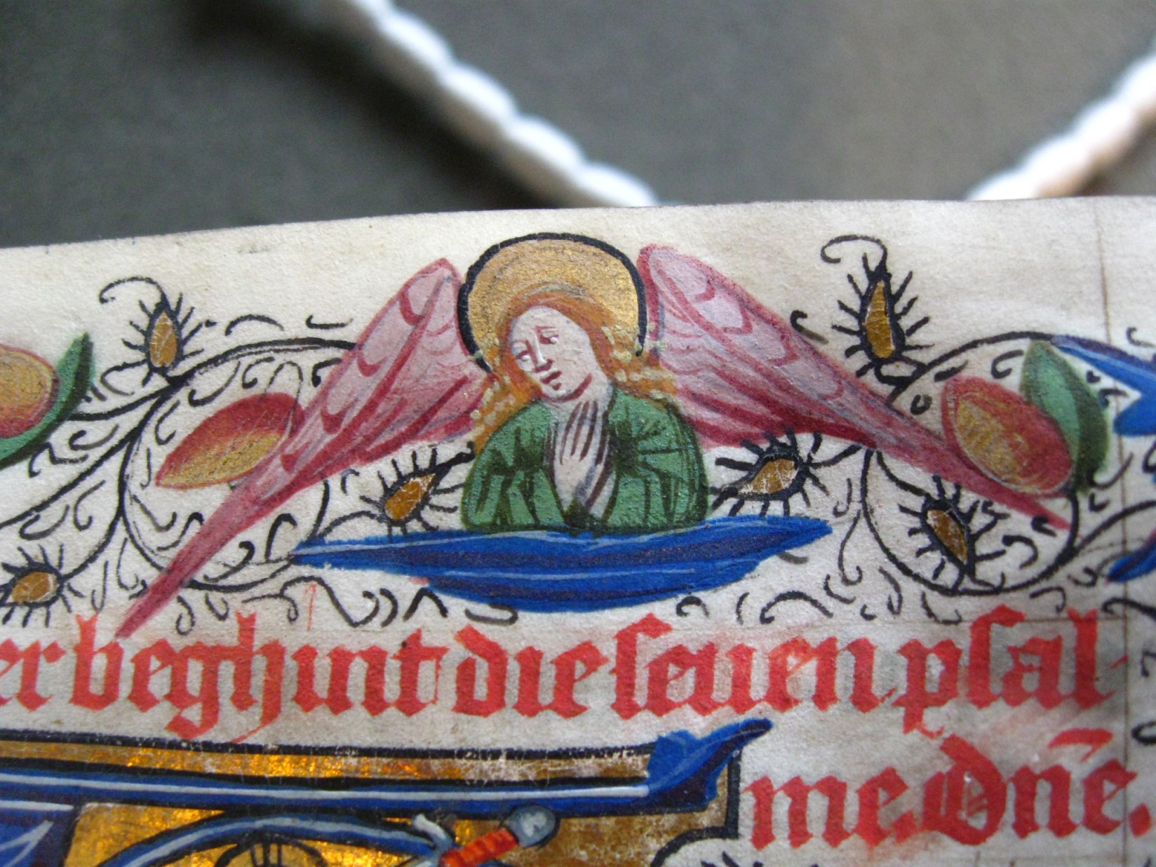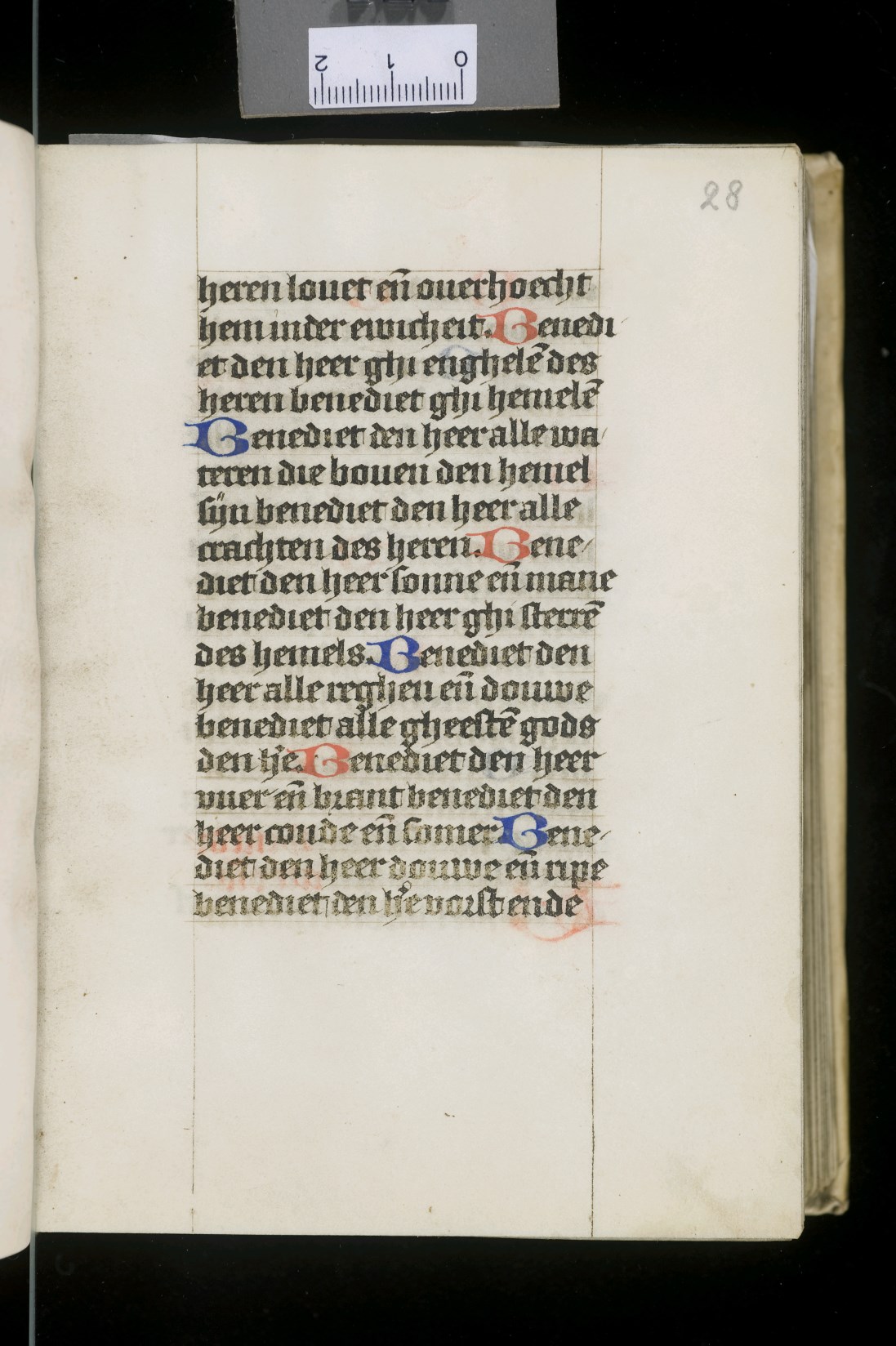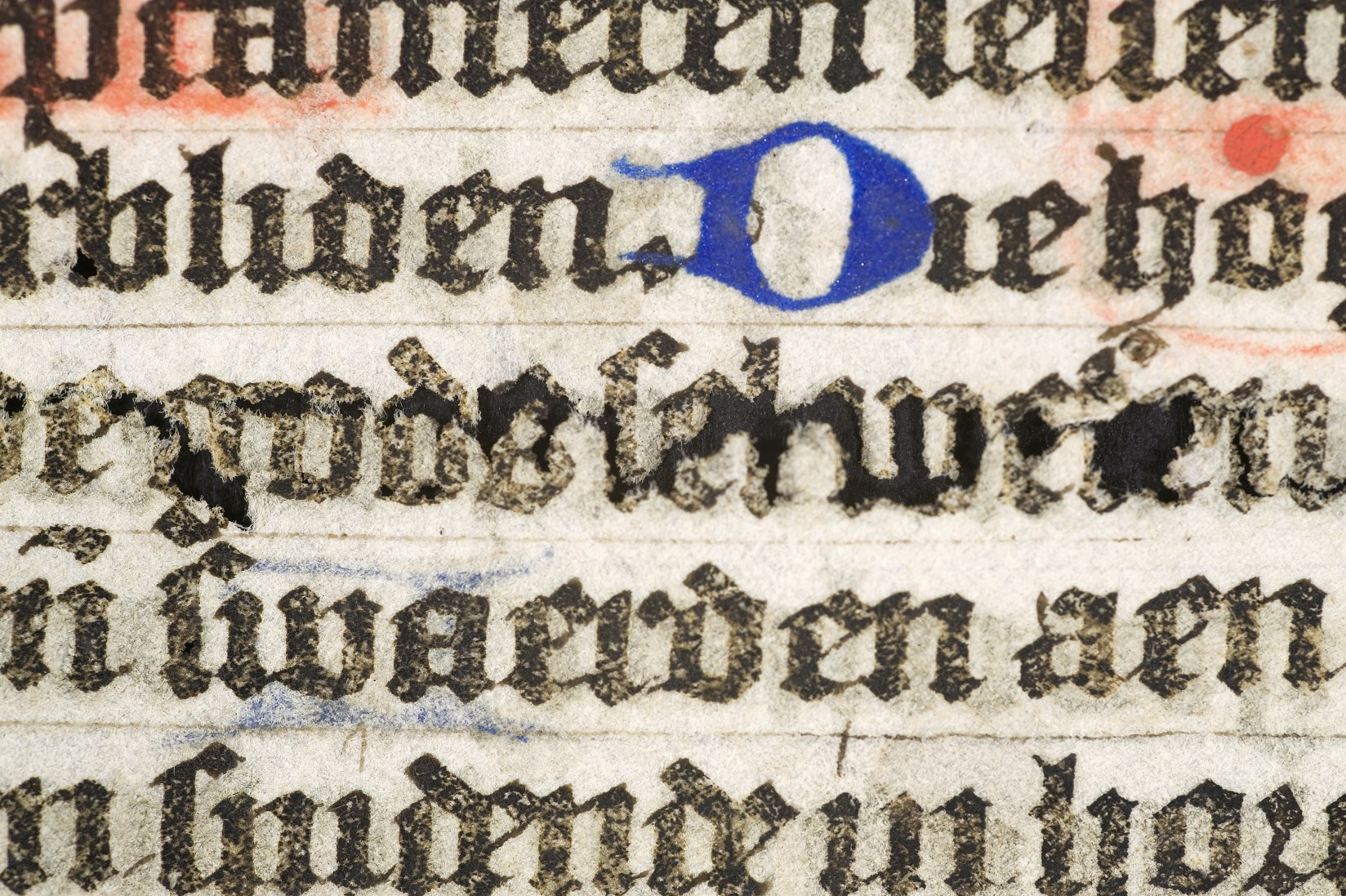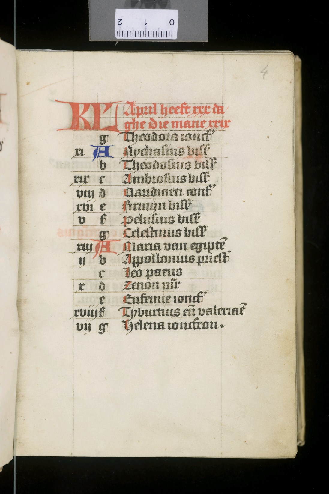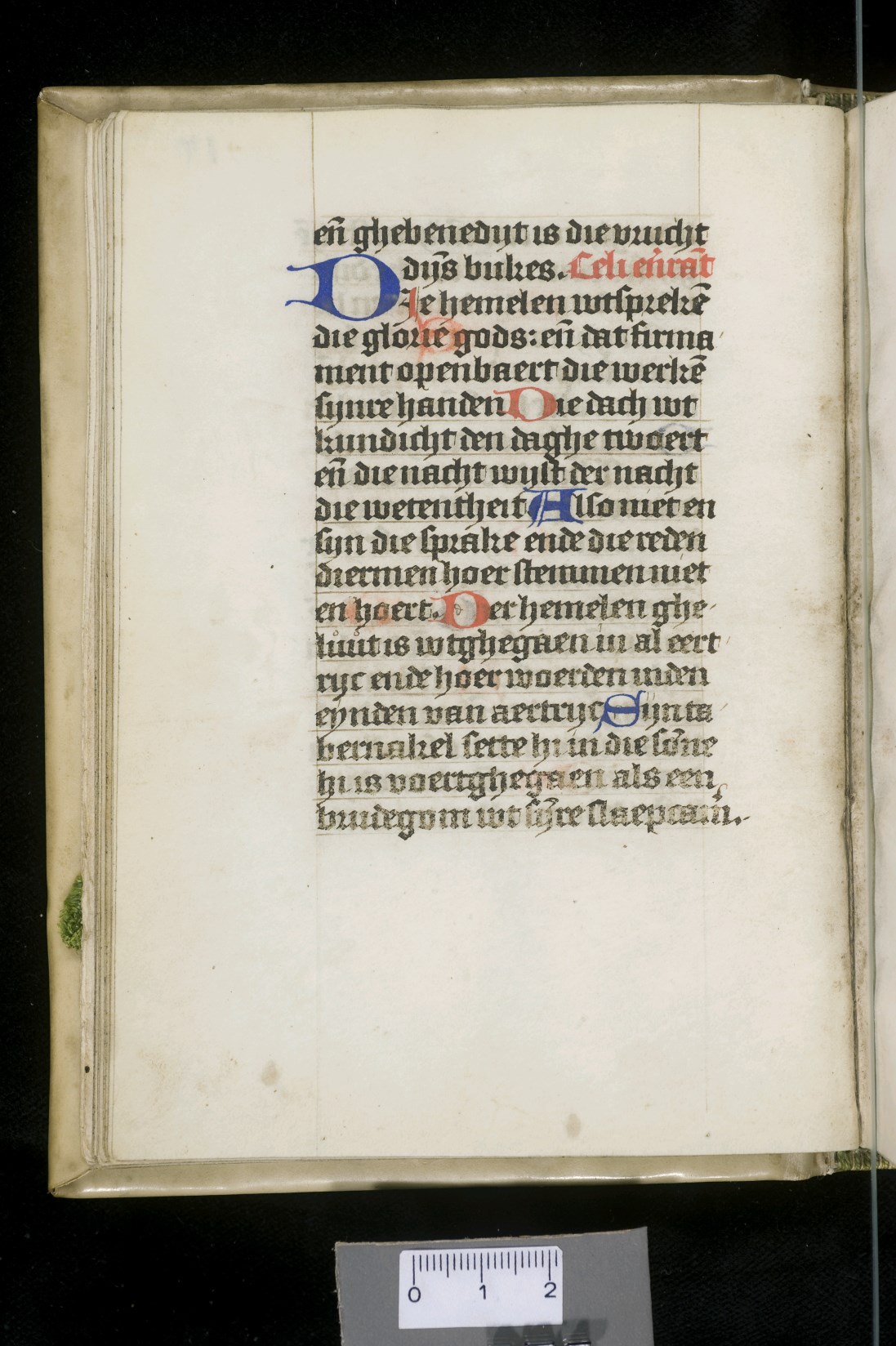Dat het handschrift waarschijnlijk in Holland geschreven is, kunnen we afleiden uit het feit dat Jeroen in de kalender in rood vermeld staat. Opmerkelijk is echter dat de randversiering afkomstig is van een der zogenaamde Meesters van de Bostonse `Stad Gods', actief in Utrecht in de jaren 1460-1470. De kleurrijke versiering rond staaflijsten van inktlijnen ...