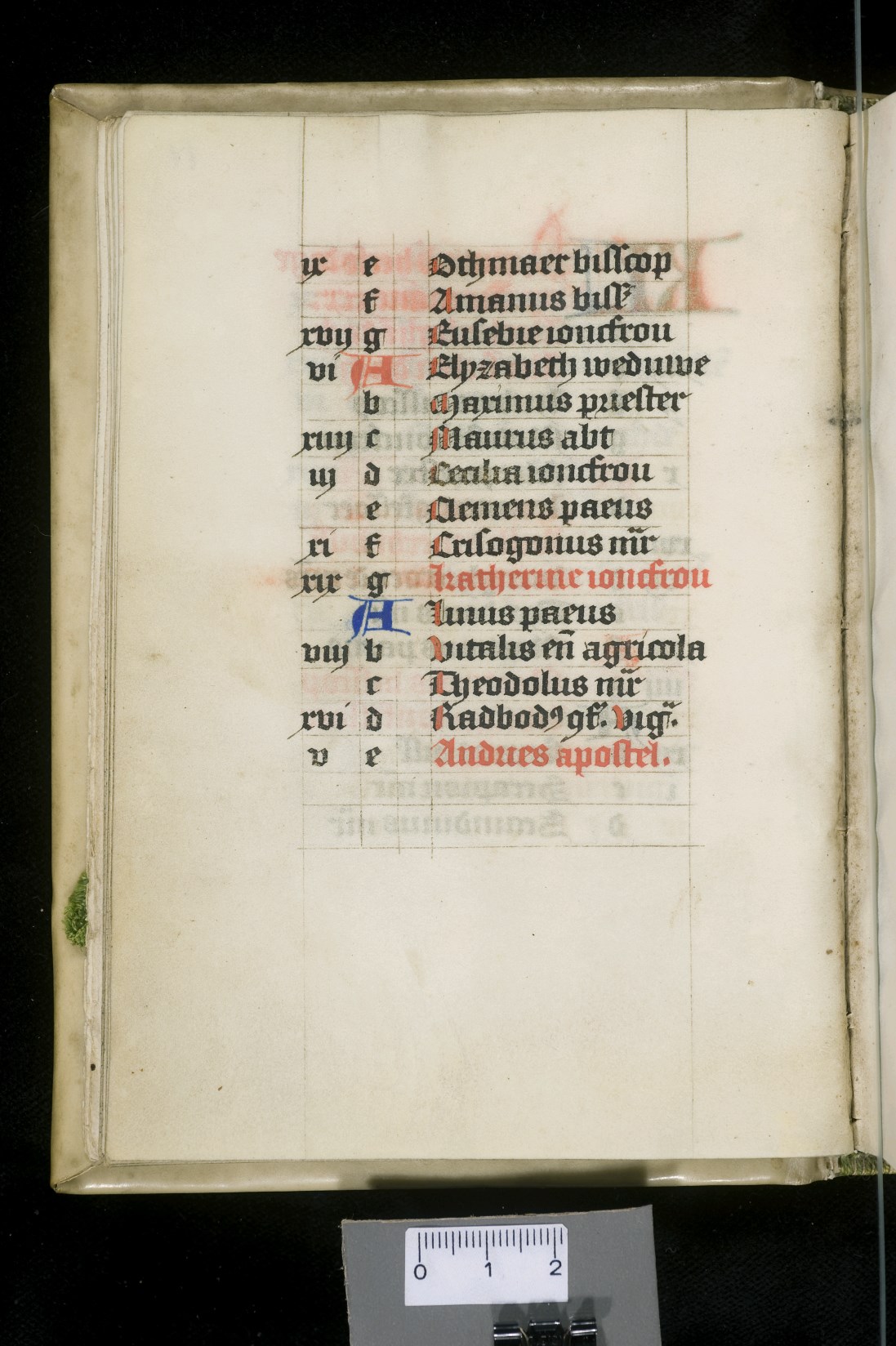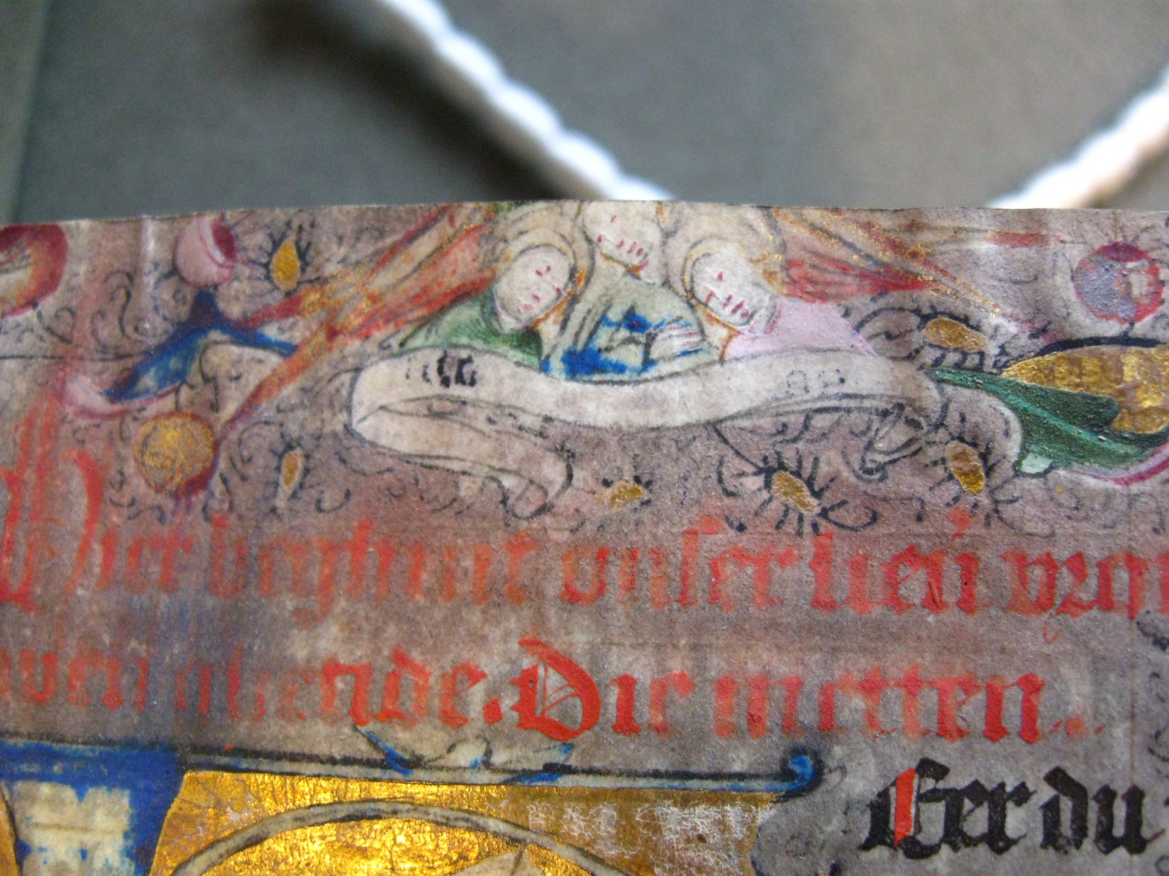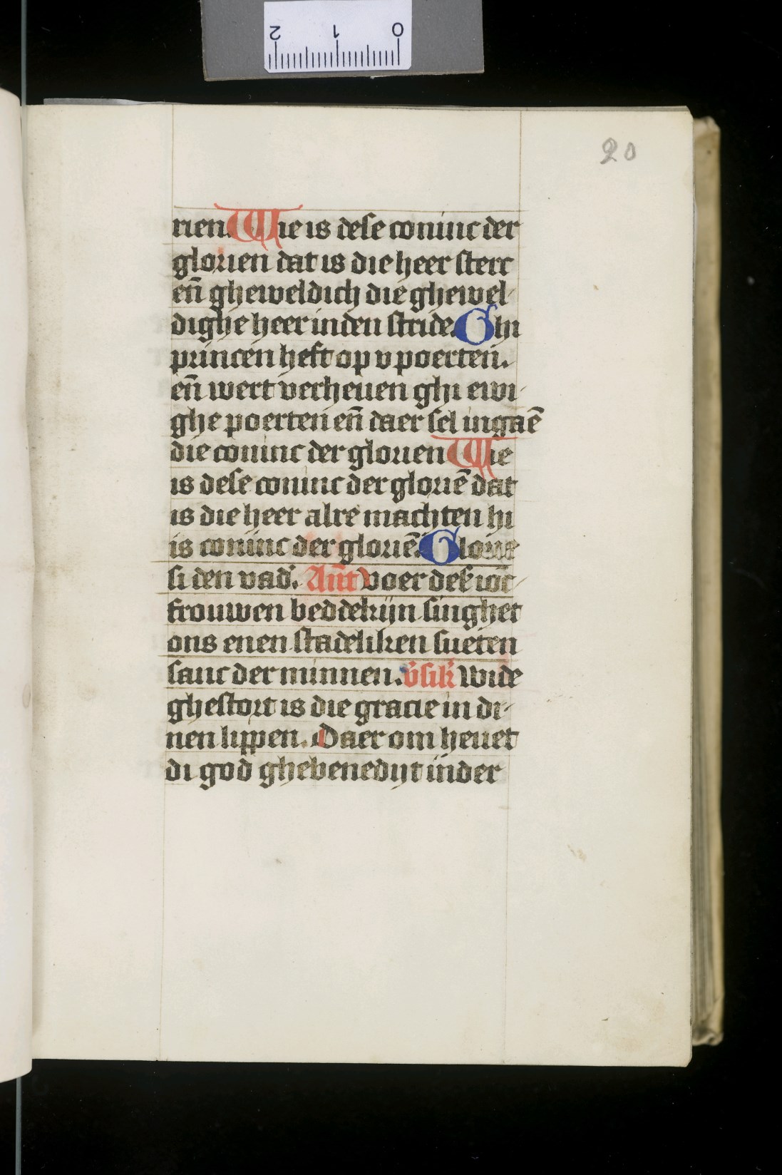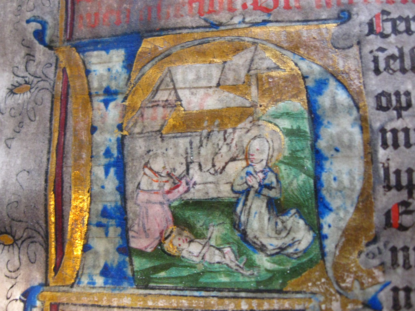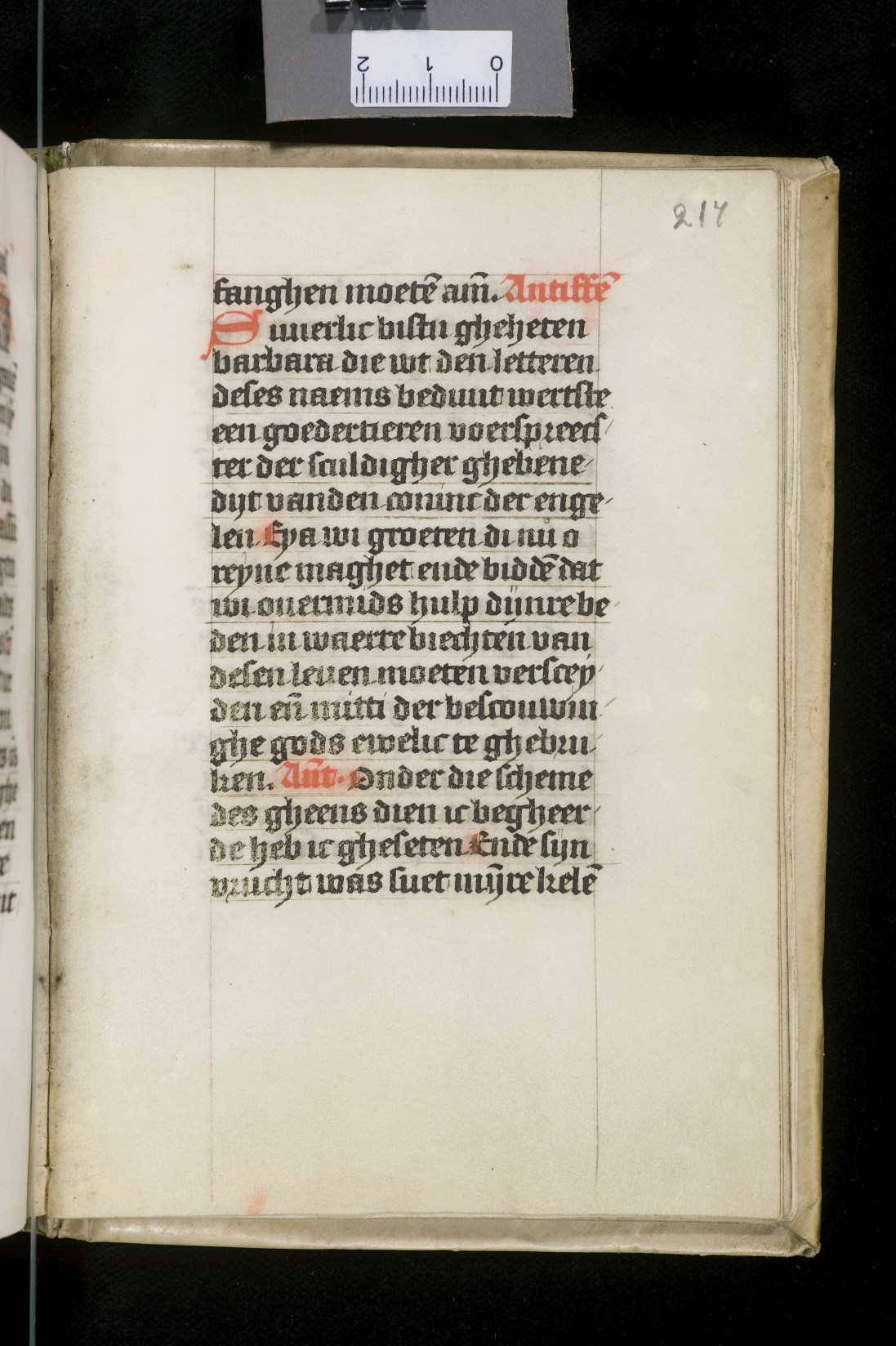 Dat het handschrift waarschijnlijk in Holland geschreven is, kunnen we afleiden uit het feit dat Jeroen in de kalender in rood vermeld staat. Opmerkelijk is echter dat de randversiering afkomstig is van een der zogenaamde Meesters van de Bostonse `Stad Gods', actief in Utrecht in de jaren 1460-1470. De kleurrijke versiering rond staaflijsten van inktlijnen ...