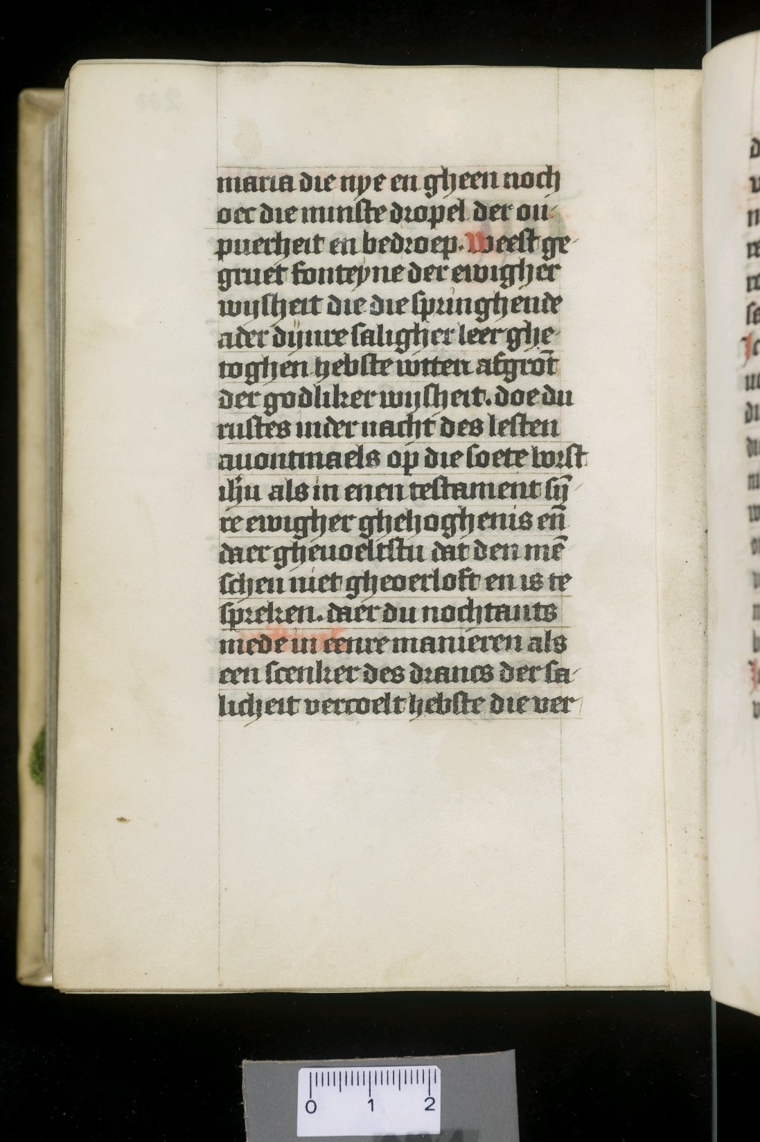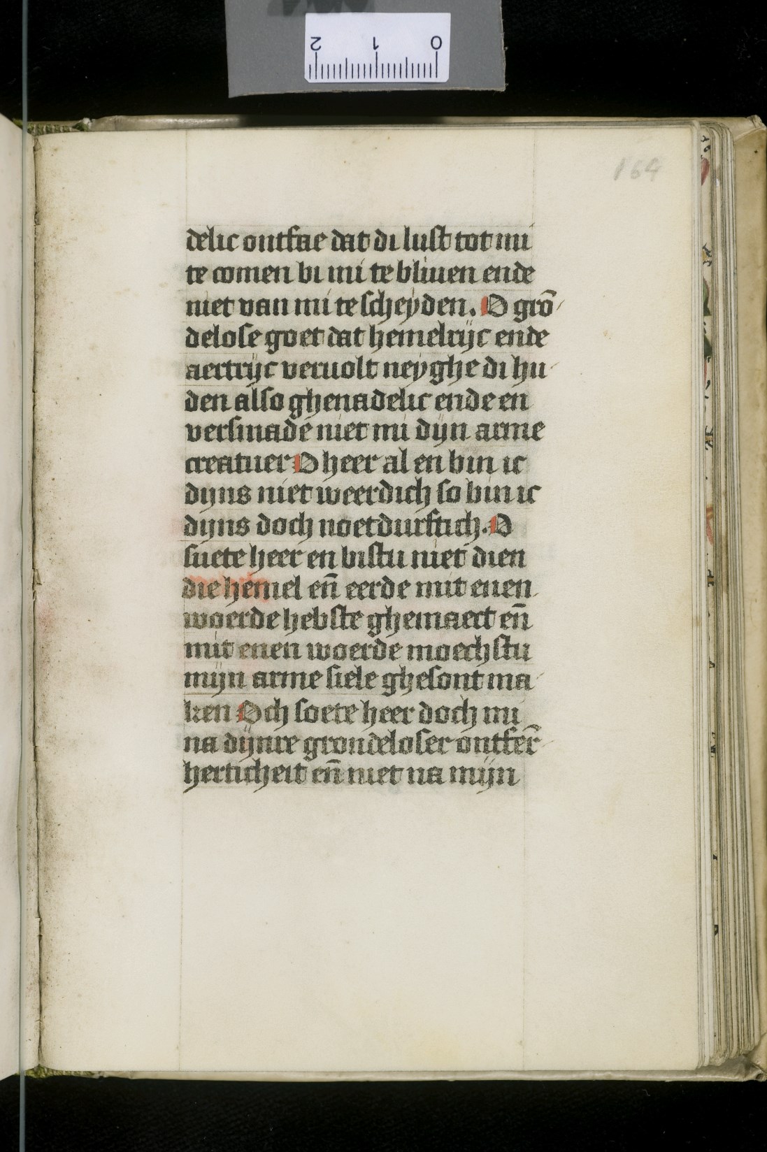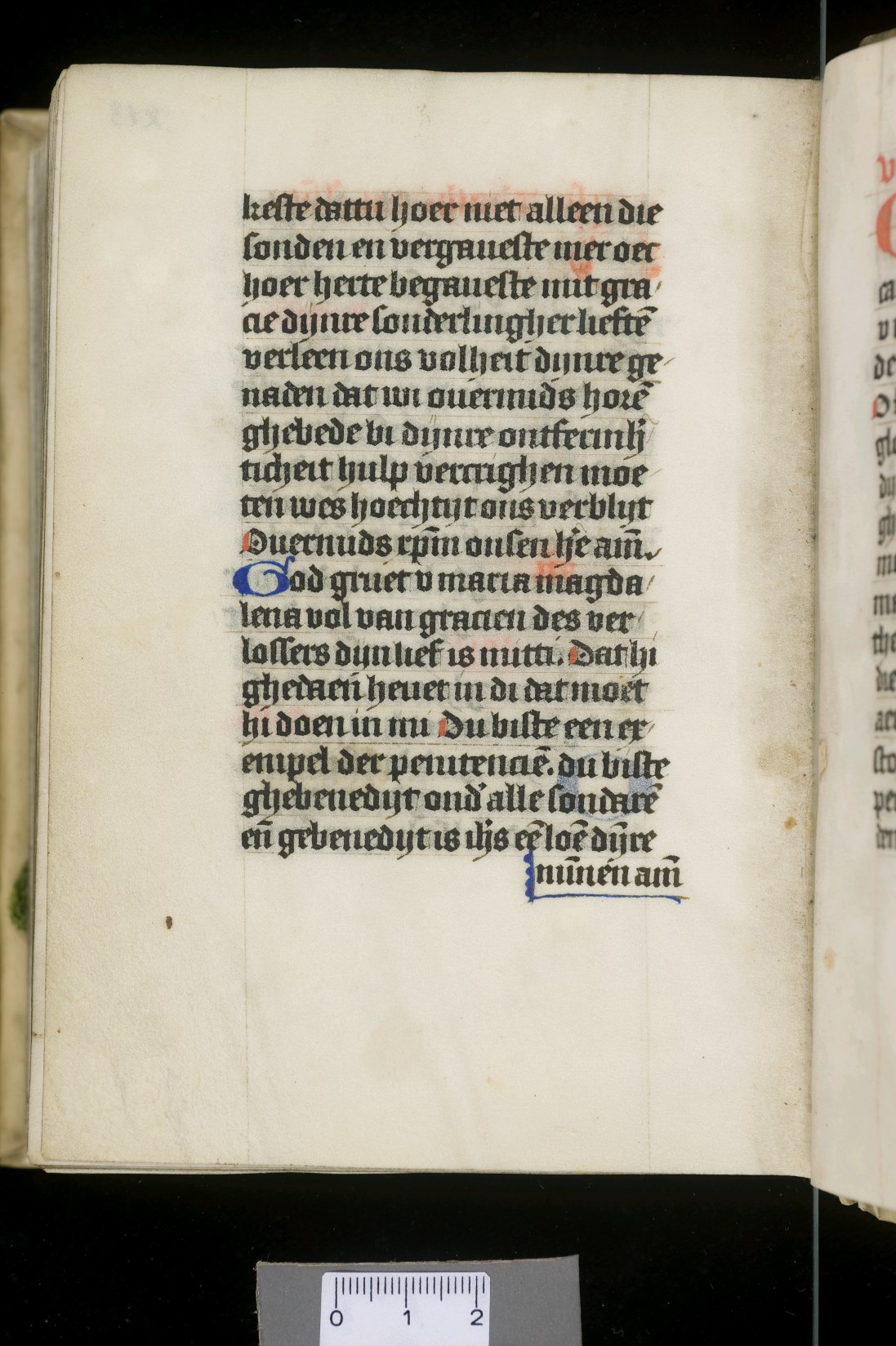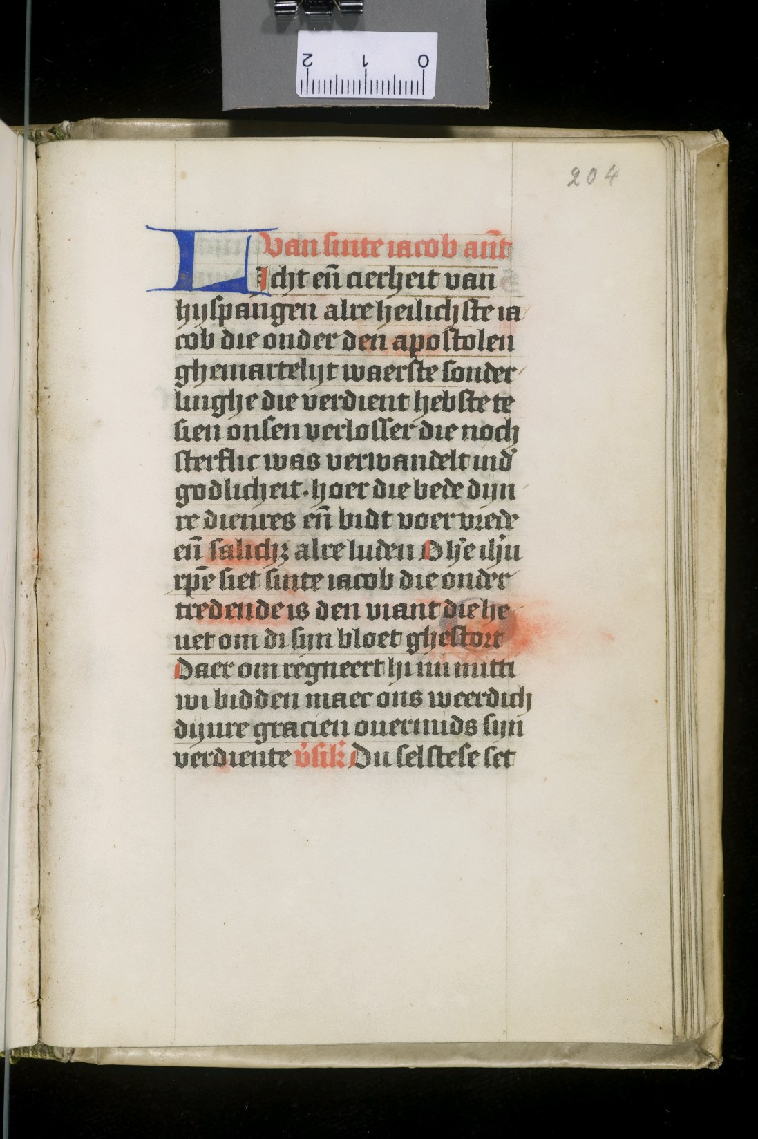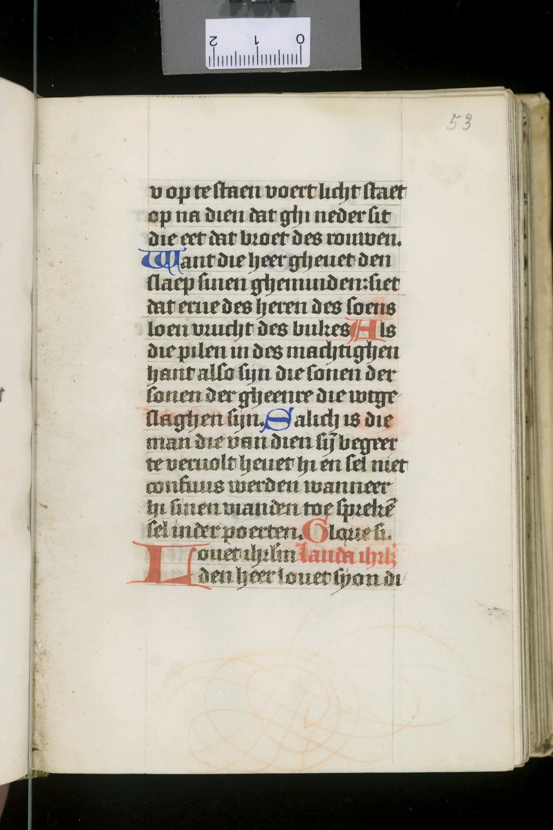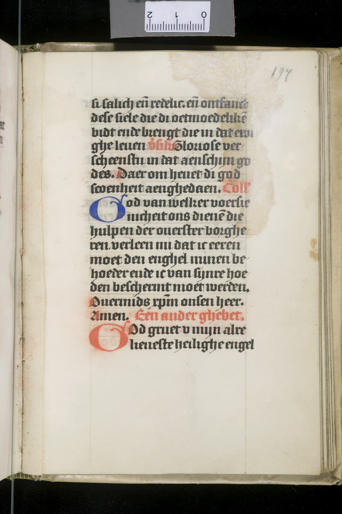Dat het handschrift waarschijnlijk in Holland geschreven is, kunnen we afleiden uit het feit dat Jeroen in de kalender in rood vermeld staat. Opmerkelijk is echter dat de randversiering afkomstig is van een der zogenaamde Meesters van de Bostonse `Stad Gods', actief in Utrecht in de jaren 1460-1470. De kleurrijke versiering rond staaflijsten van inktlijnen ...