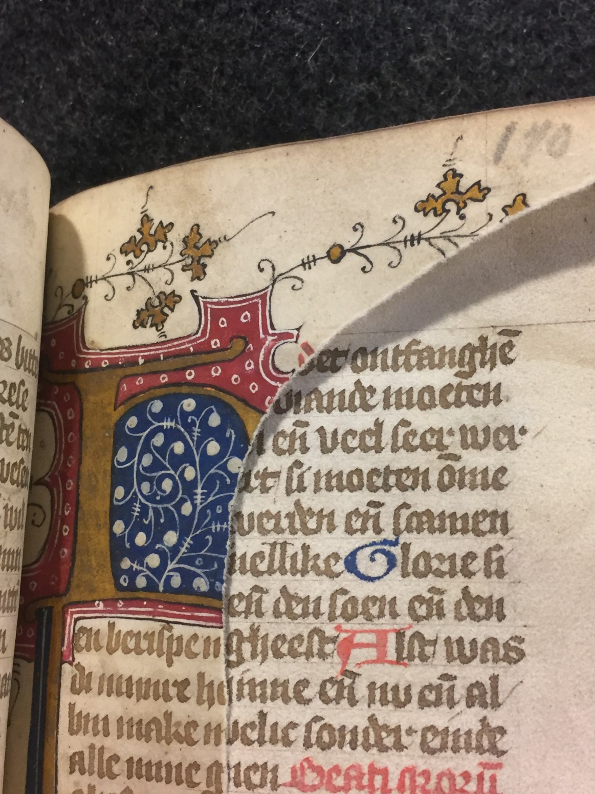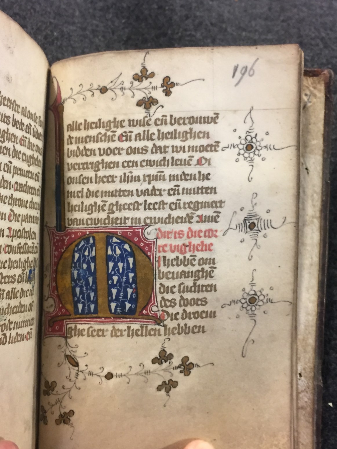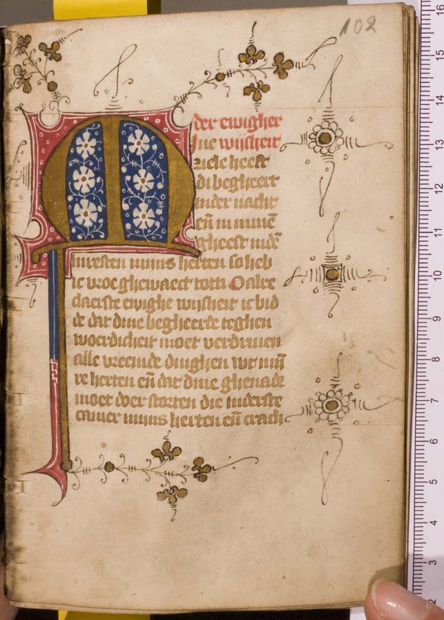 Een getijden- en gebedenboek dat wordt gedateerd in de tweede helft van de 15de eeuw (Gumbert opperde Utrecht als plaats van ontstaan). Het handschrift begint met een kalender (Middel-Nederlands), heeft enkele initialen in goud (rood en blauw versierd) en in marges een randversiering de stijl van de Utrechtse blaadjes. Verschillende folia zijn in- en/of afgescheurd ...