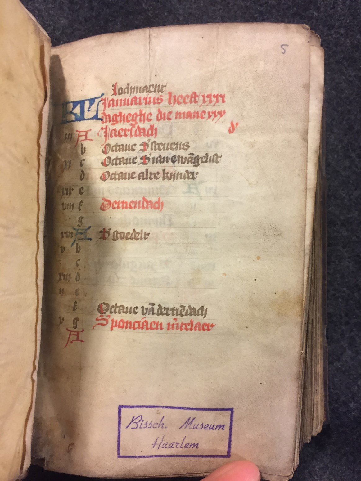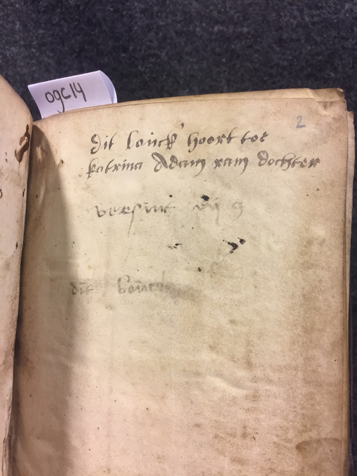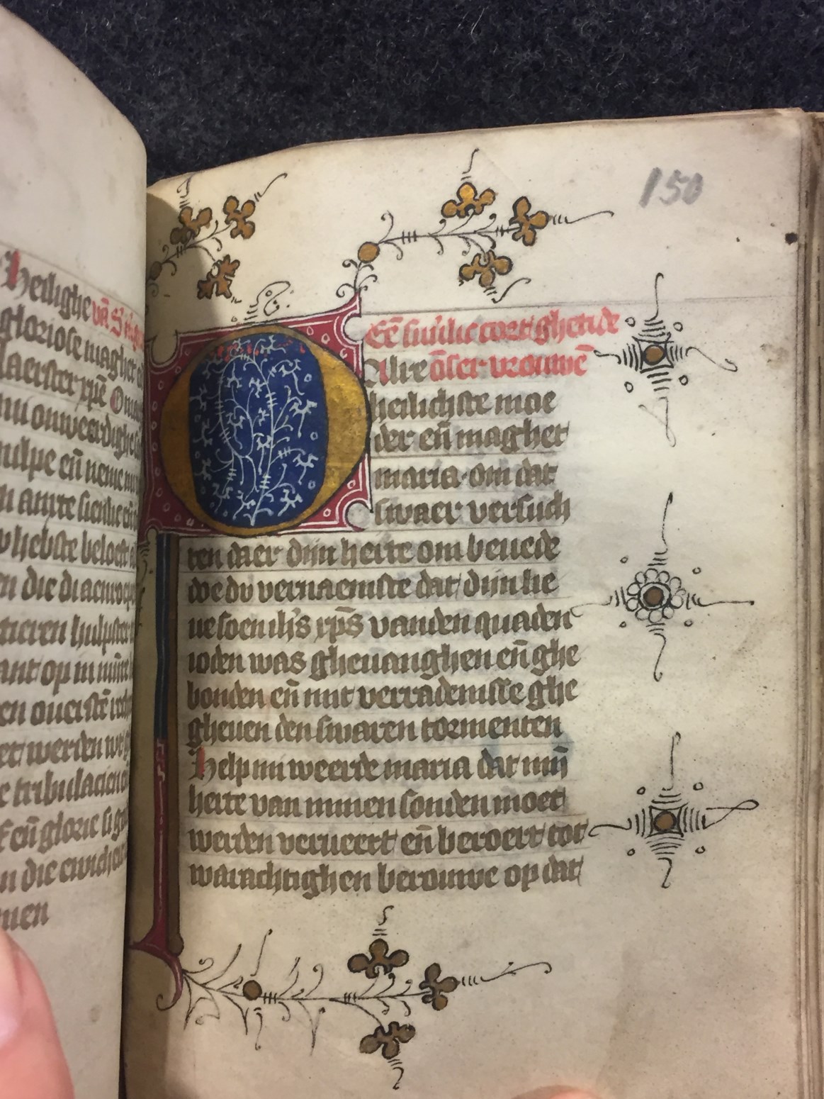 Een getijden- en gebedenboek dat wordt gedateerd in de tweede helft van de 15de eeuw (Gumbert opperde Utrecht als plaats van ontstaan). Het handschrift begint met een kalender (Middel-Nederlands), heeft enkele initialen in goud (rood en blauw versierd) en in marges een randversiering de stijl van de Utrechtse blaadjes. Verschillende folia zijn in- en/of afgescheurd ...