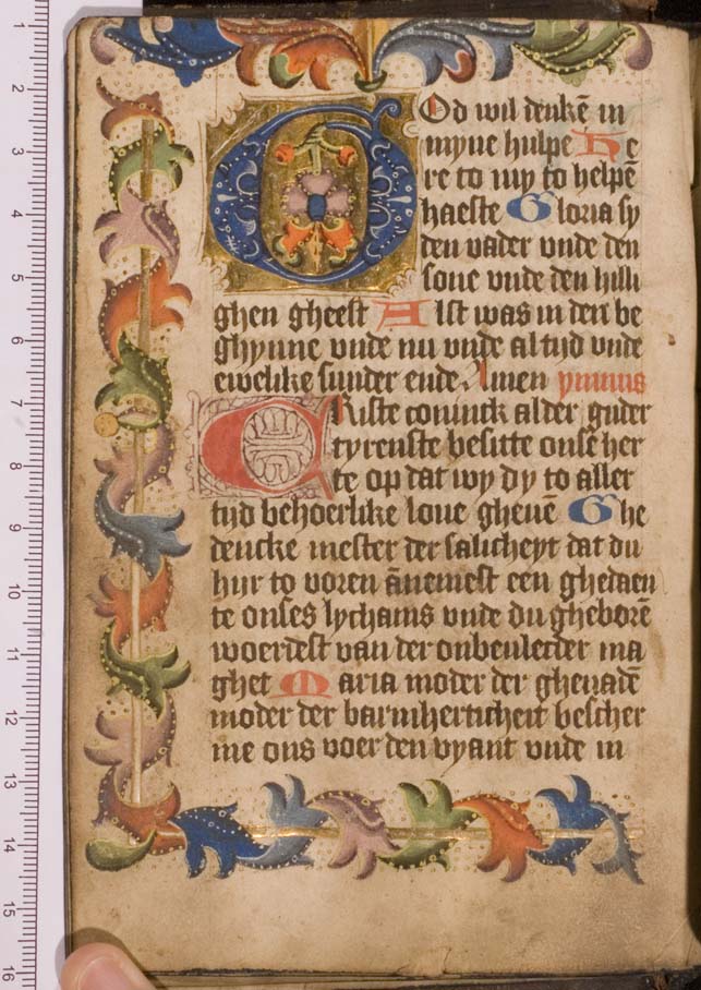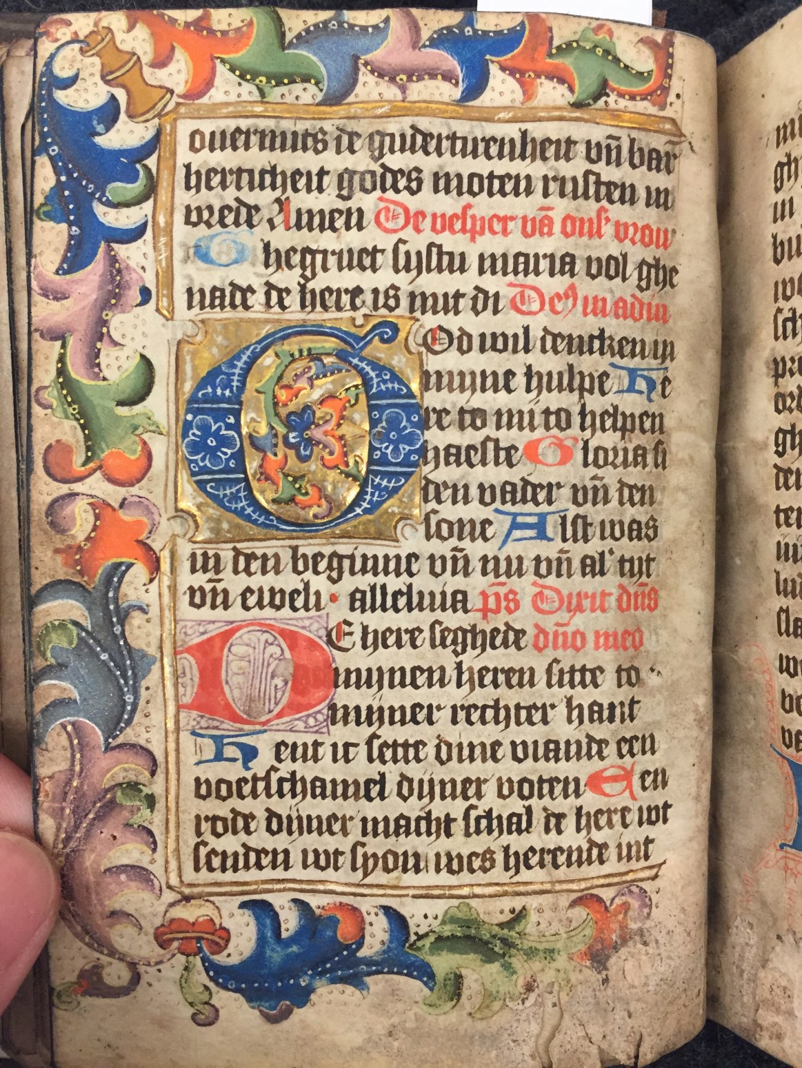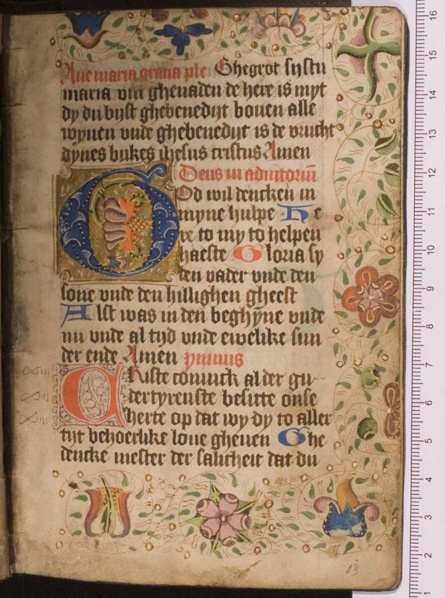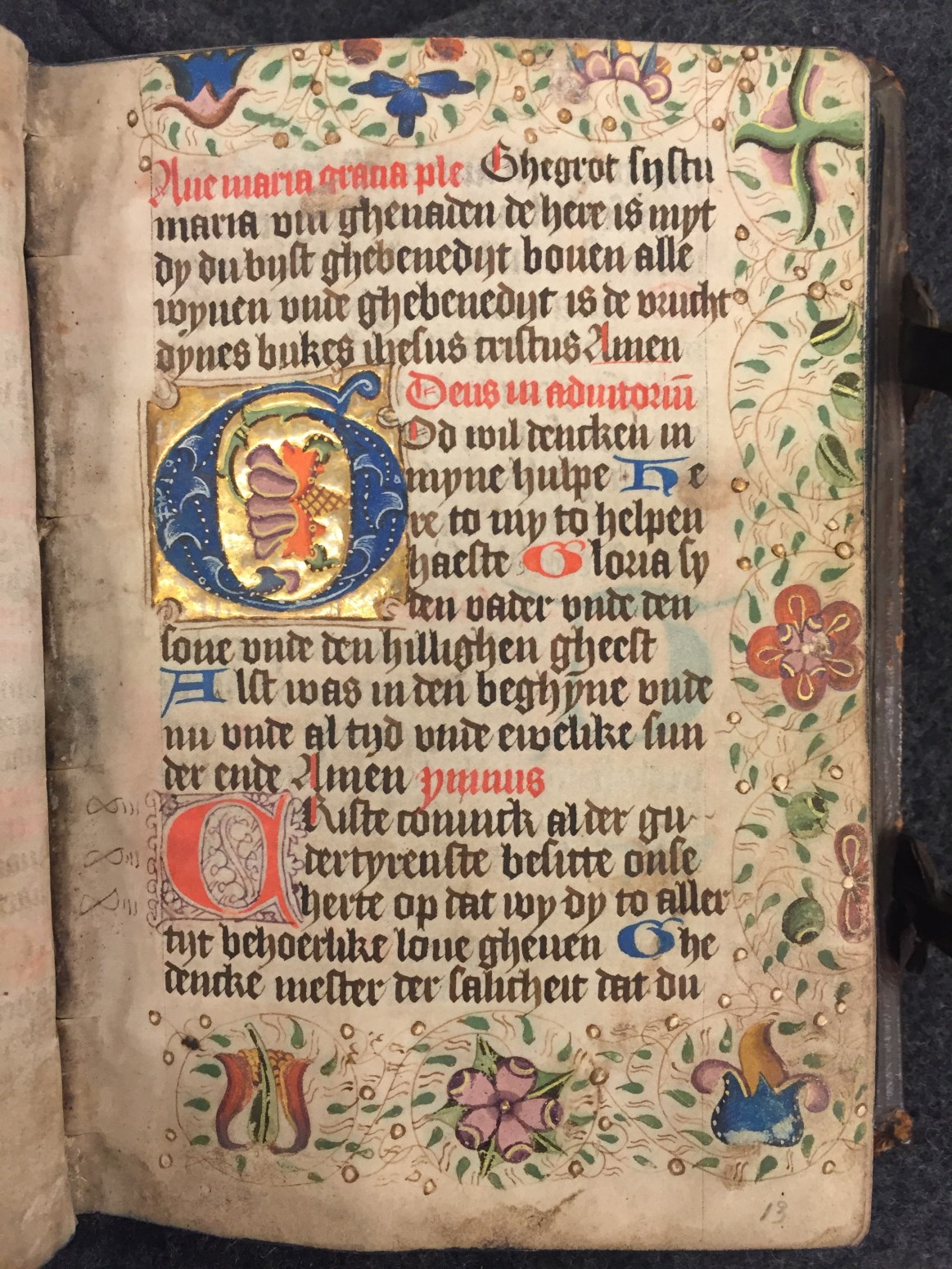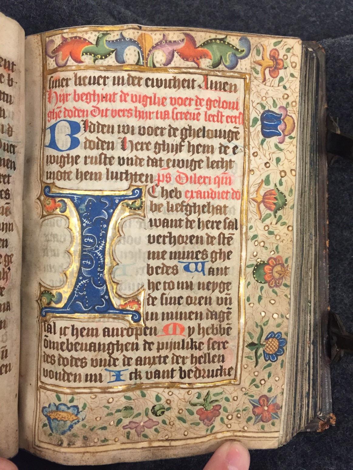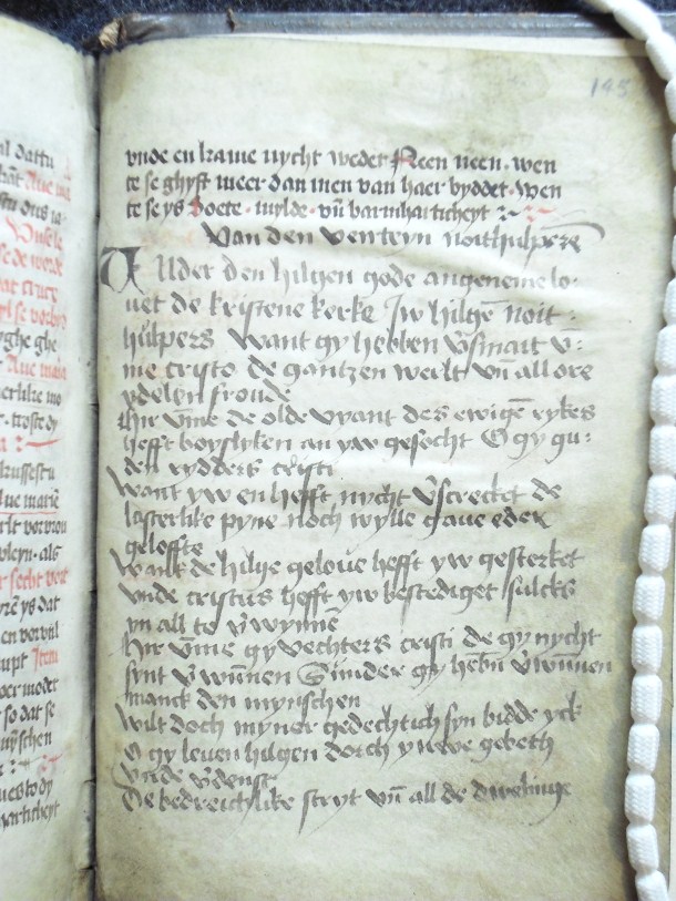 Een gebeden- en getijdenboek uit het noord oosten van de Nederlanden (in het Middel-Nederlands). Gedateerd door Gumbert in het laatste kwart van de 15de eeuw. De getijden lopen van f. 1 t/m 116 en de gebeden van 117 t/m 145. Het handschrift op perkament, heeft enkele fraaie initialen in blauw en goud, telt één miniatuur ...