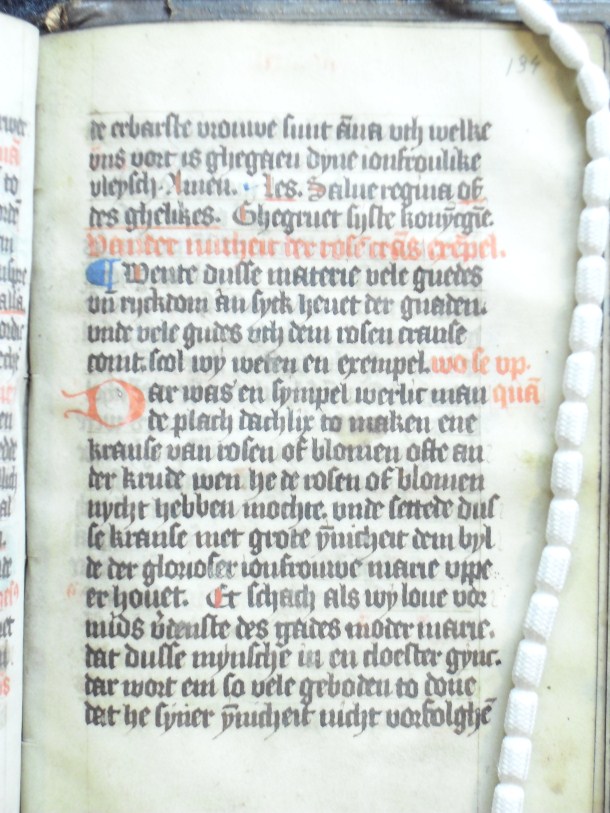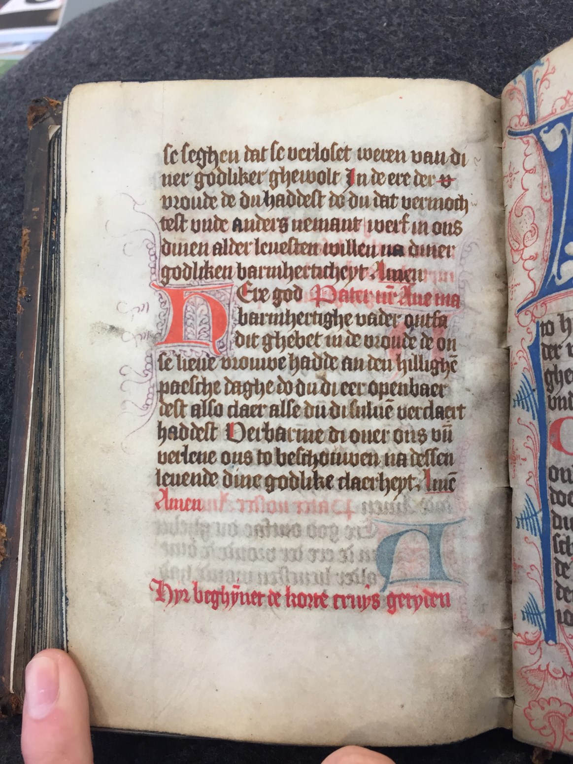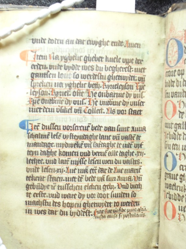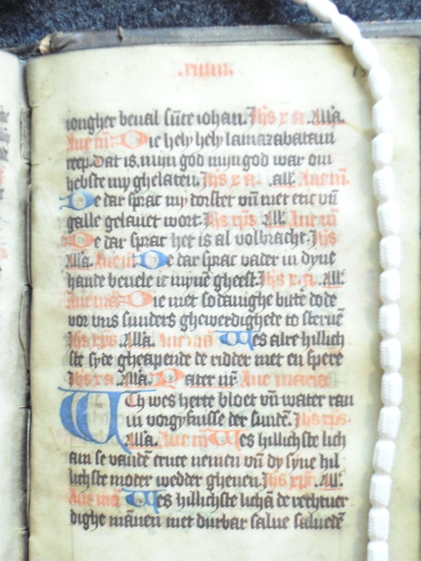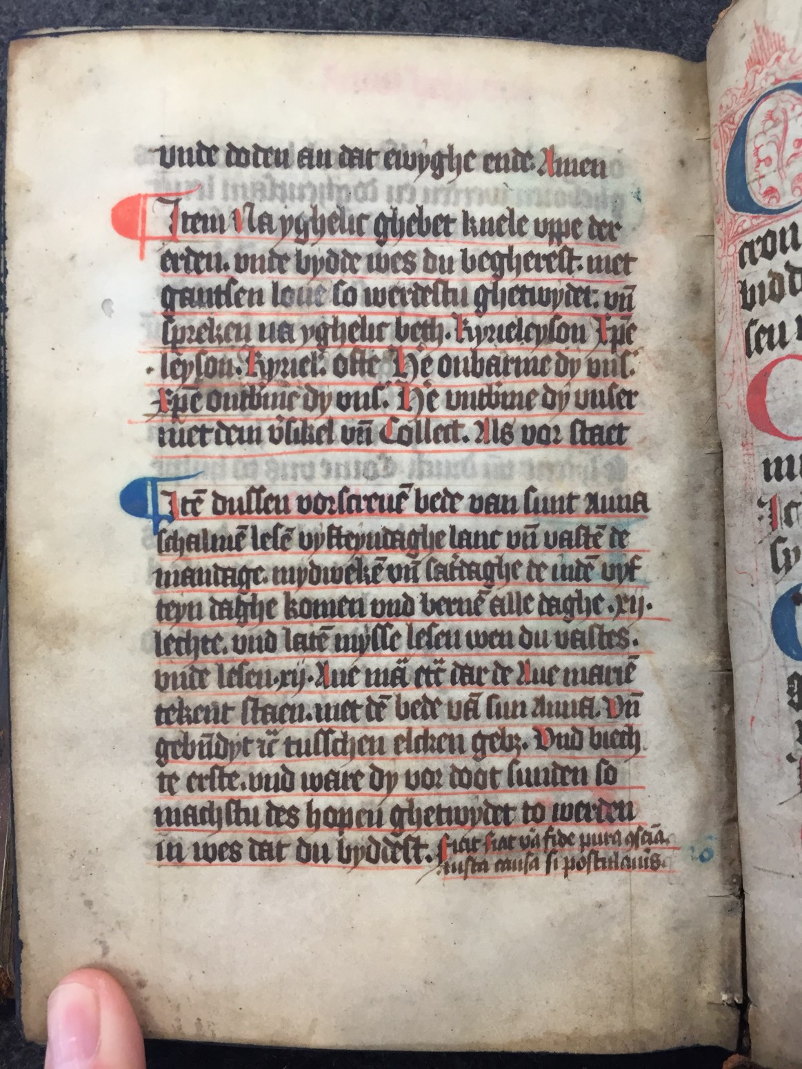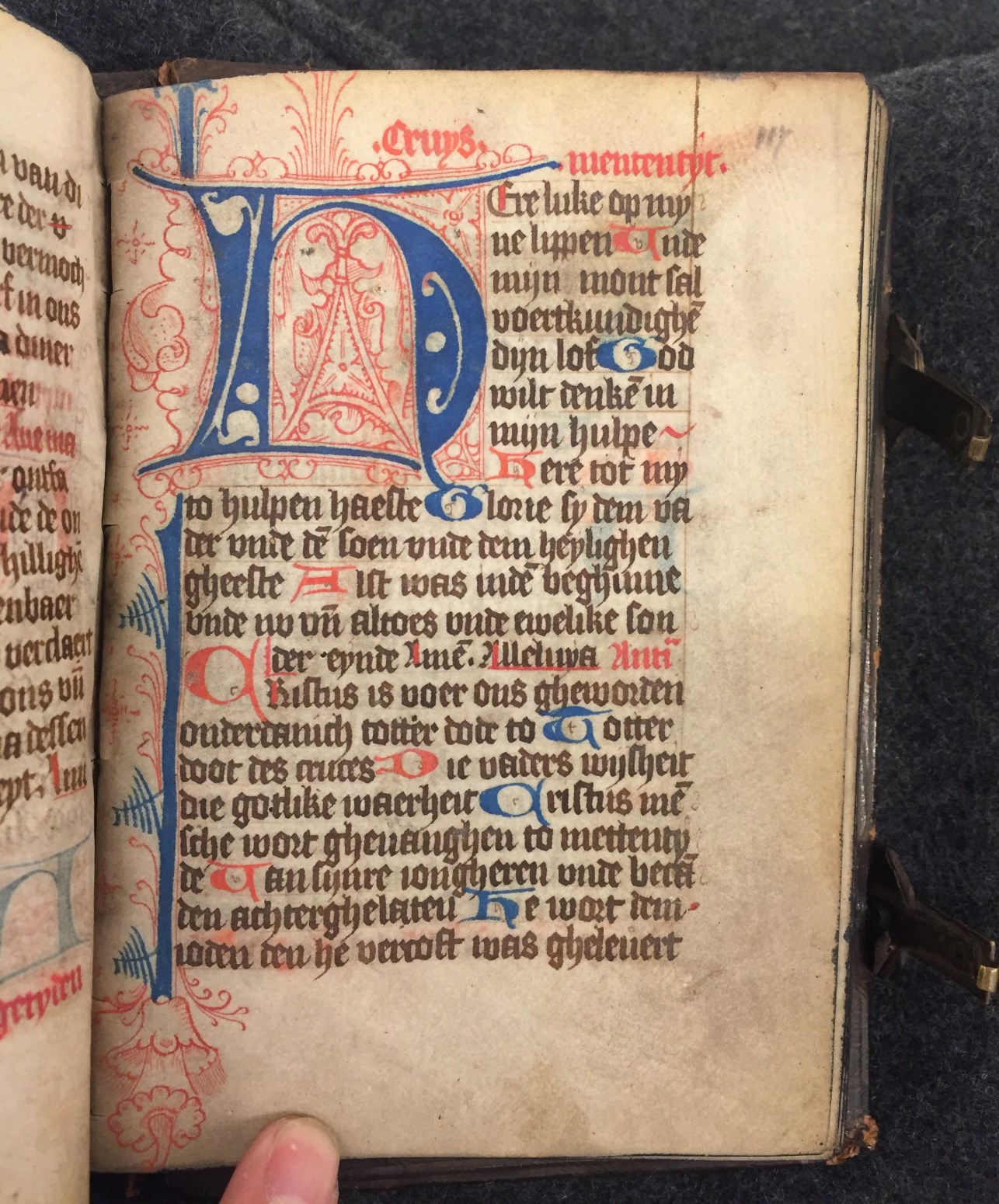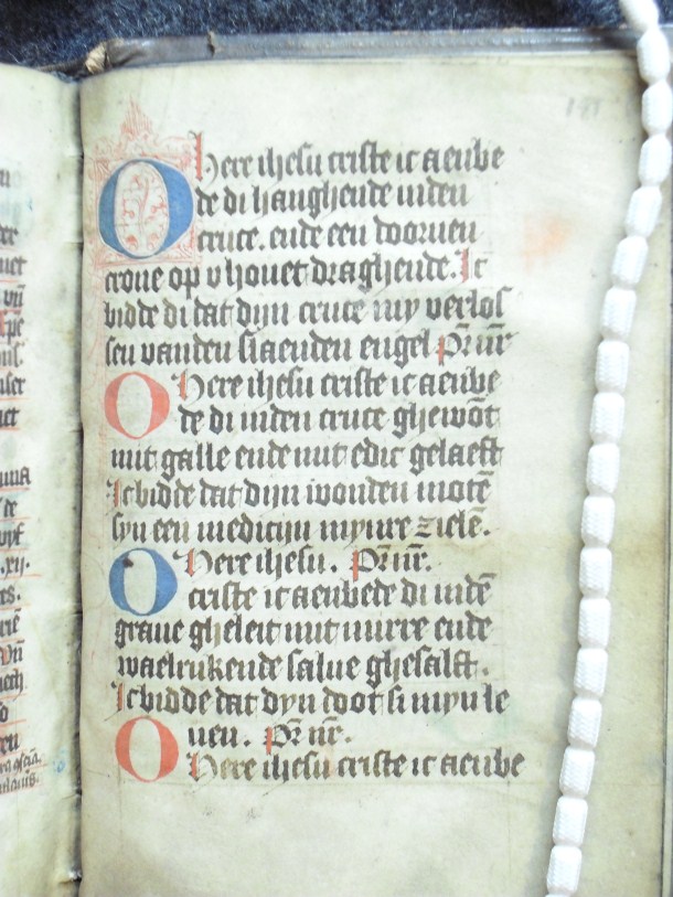 Een gebeden- en getijdenboek uit het noord oosten van de Nederlanden (in het Middel-Nederlands). Gedateerd door Gumbert in het laatste kwart van de 15de eeuw. De getijden lopen van f. 1 t/m 116 en de gebeden van 117 t/m 145. Het handschrift op perkament, heeft enkele fraaie initialen in blauw en goud, telt één miniatuur ...