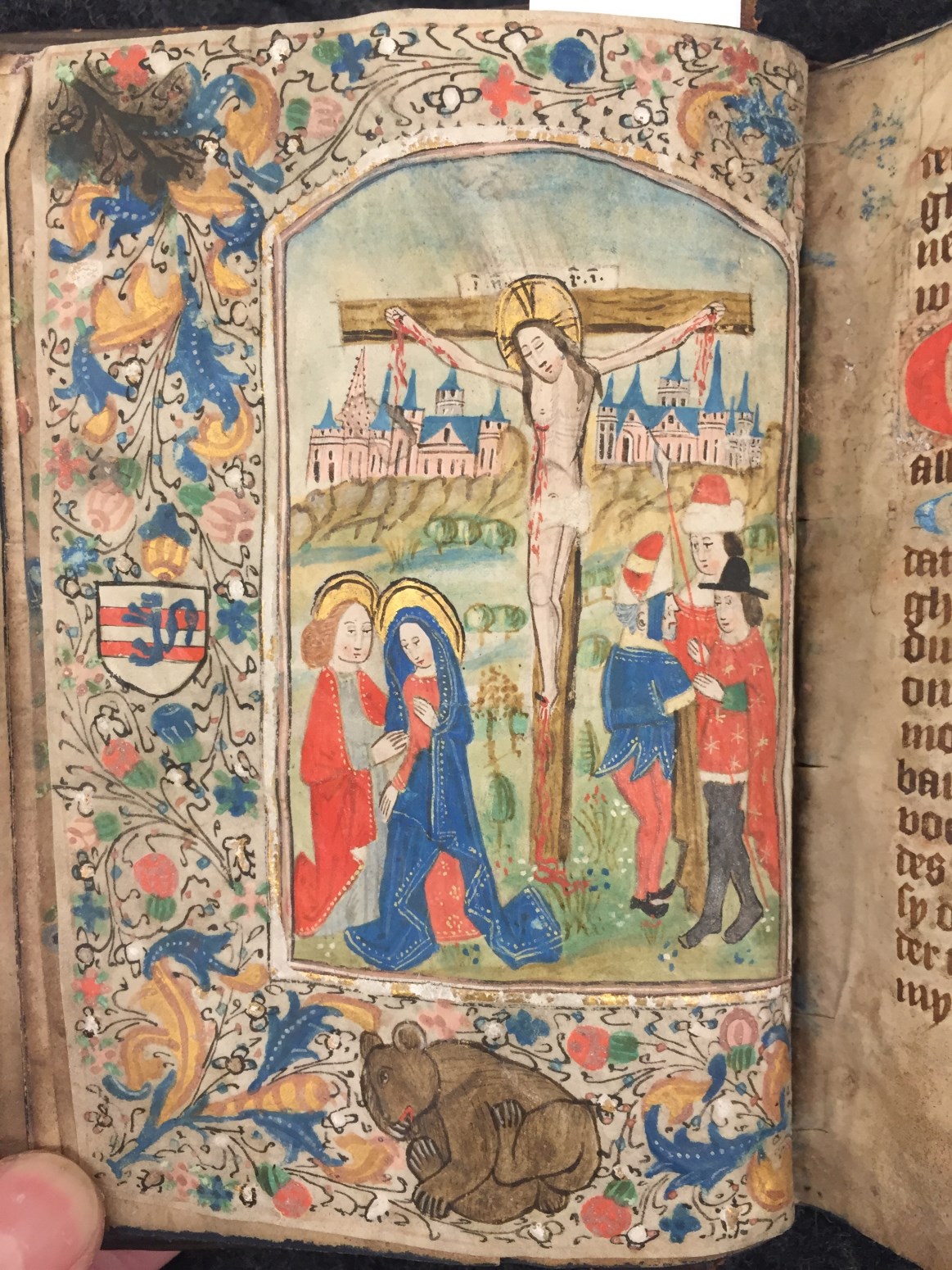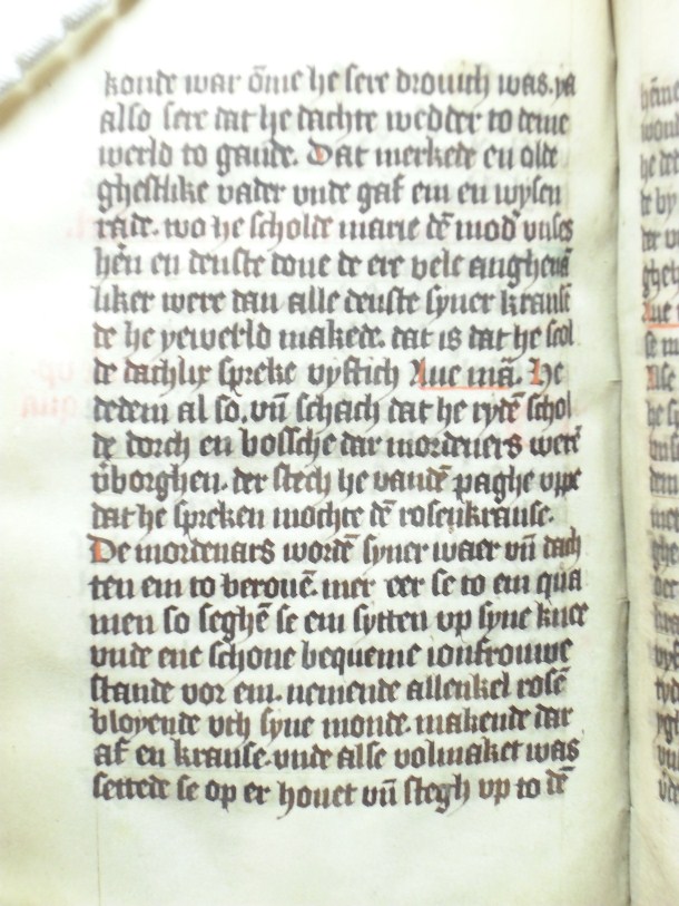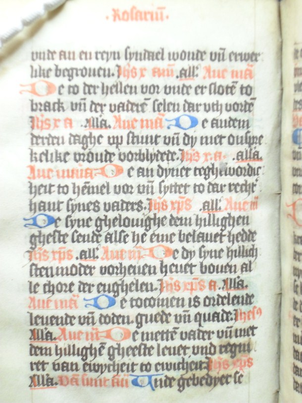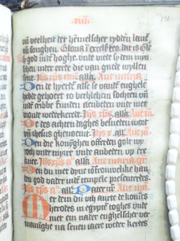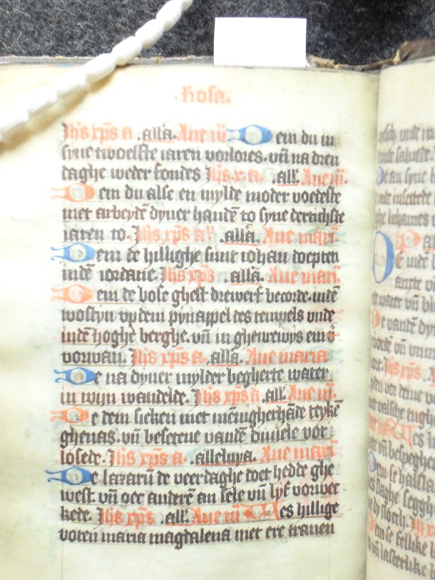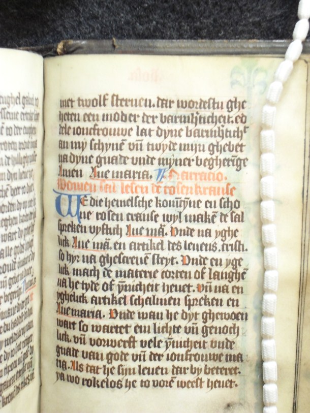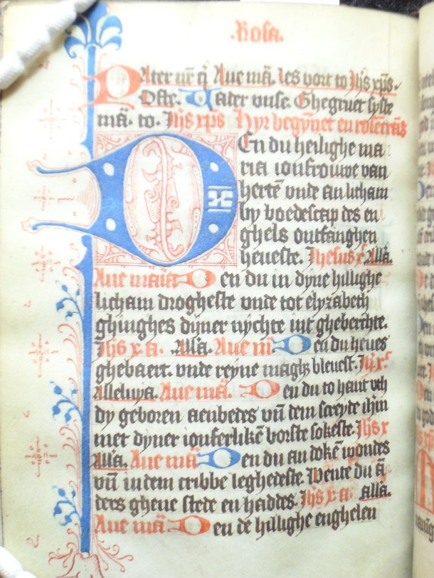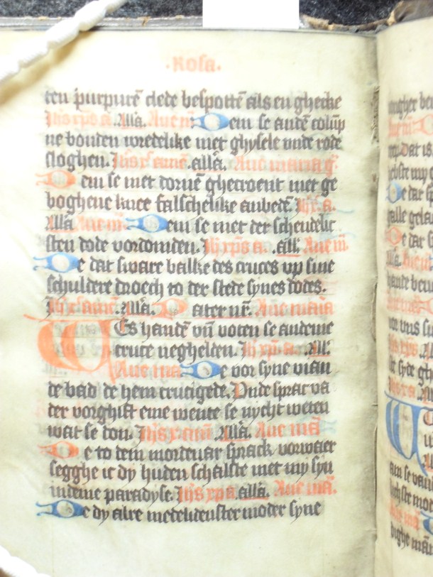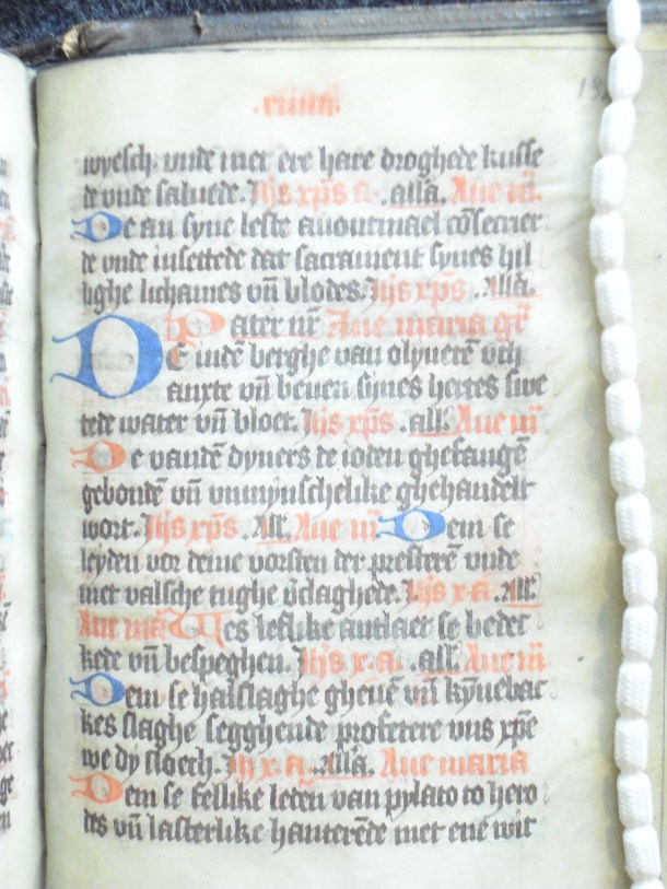 Een gebeden- en getijdenboek uit het noord oosten van de Nederlanden (in het Middel-Nederlands). Gedateerd door Gumbert in het laatste kwart van de 15de eeuw. De getijden lopen van f. 1 t/m 116 en de gebeden van 117 t/m 145. Het handschrift op perkament, heeft enkele fraaie initialen in blauw en goud, telt één miniatuur ...