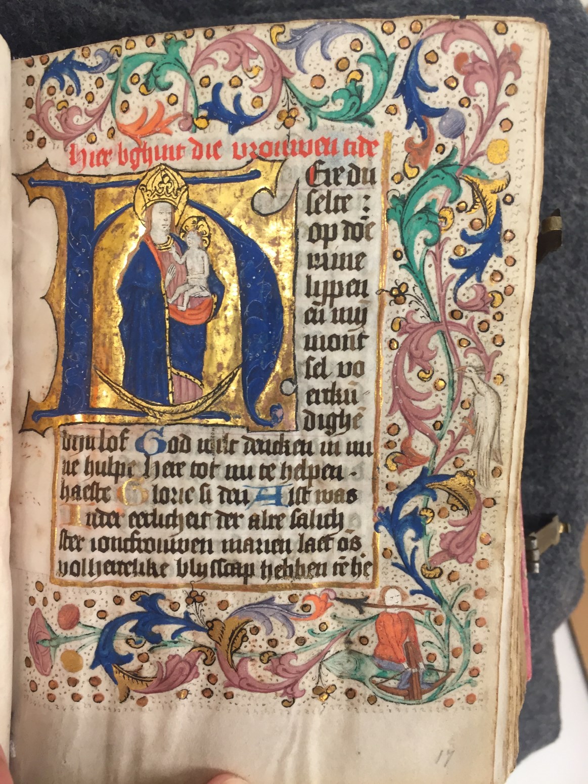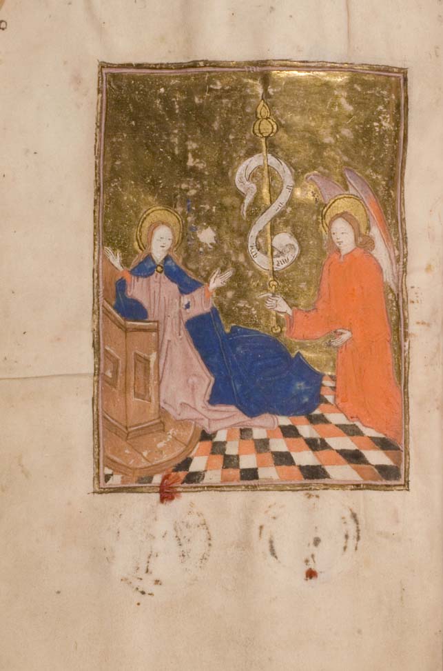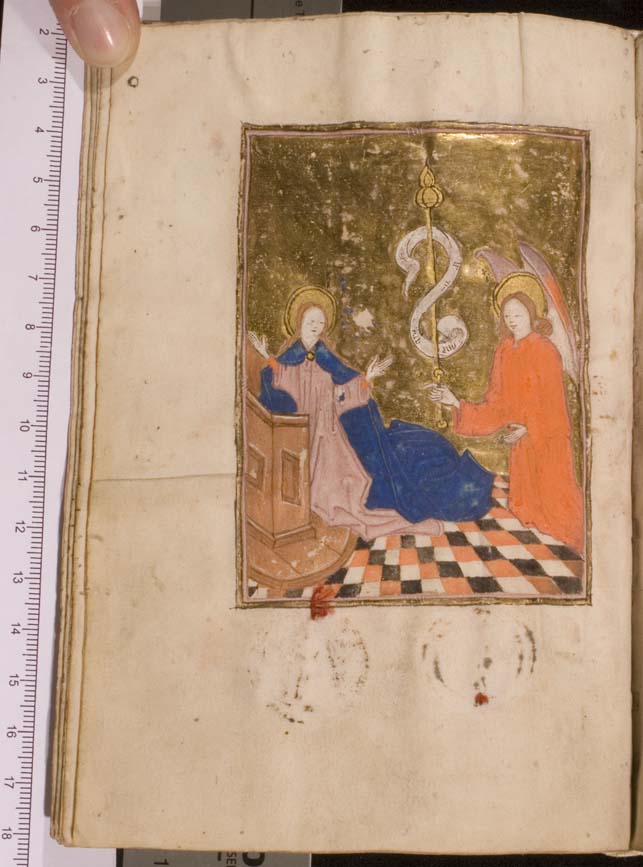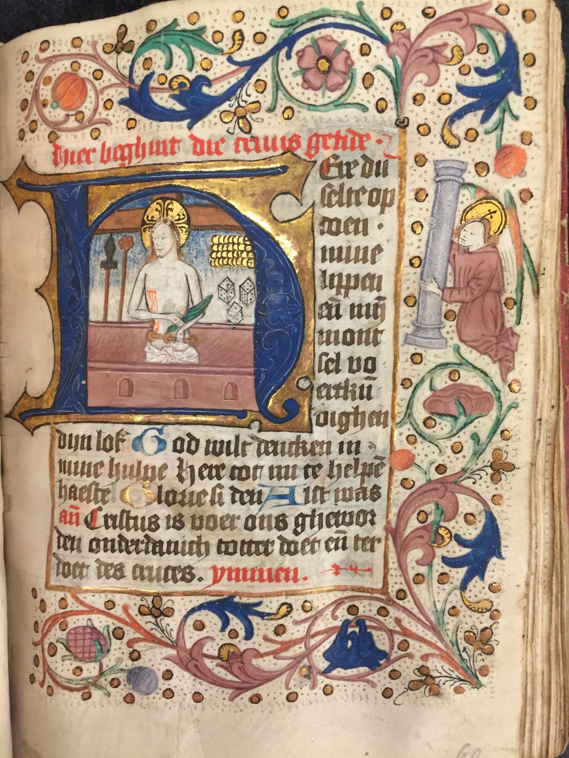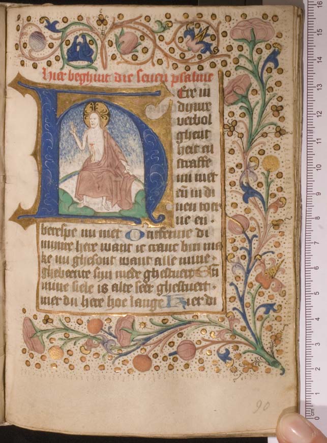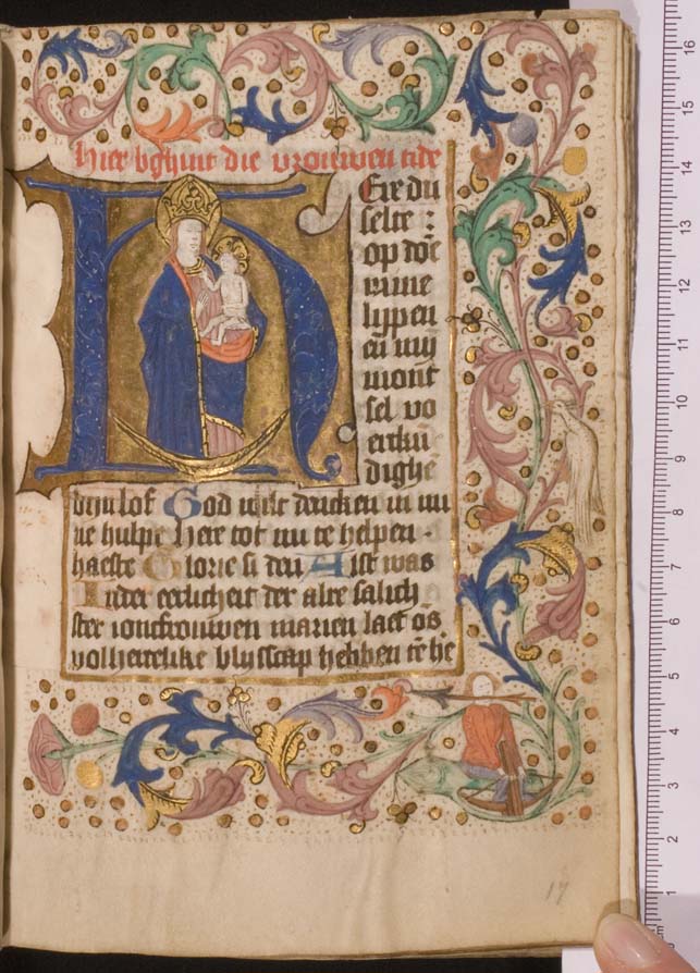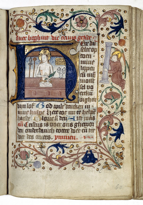 Een getijden- en gebedenboek uit het oosten van Nederland uit circa 1480. De margedecoratie in dit handschrift toont de volgende elementen: engeltjes ten halven lijve, karbonkeltjes (met acht stralen en een gouden kern), blad- en bloemmotieven. De afbeeldingen zijn vrij eenvoudig, waarbij men zelden veel figuren zal aantreffen. Scènes zijn vaak geplaatst binnen een gewelfd ...