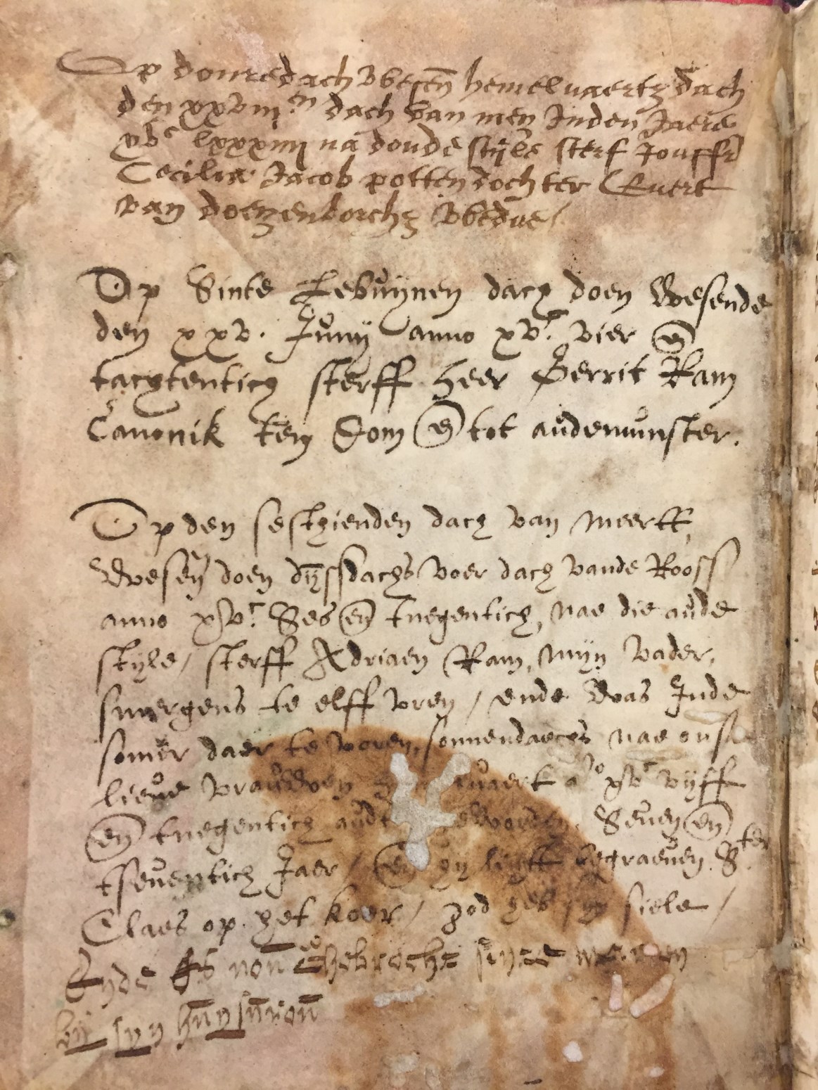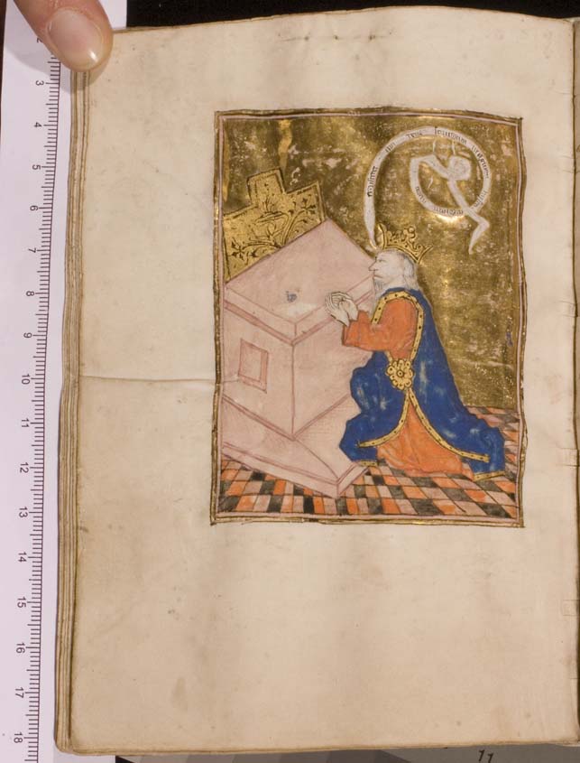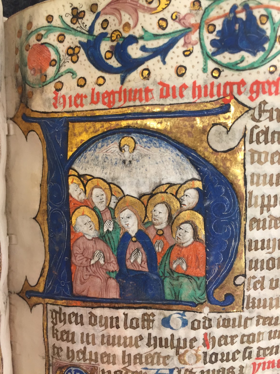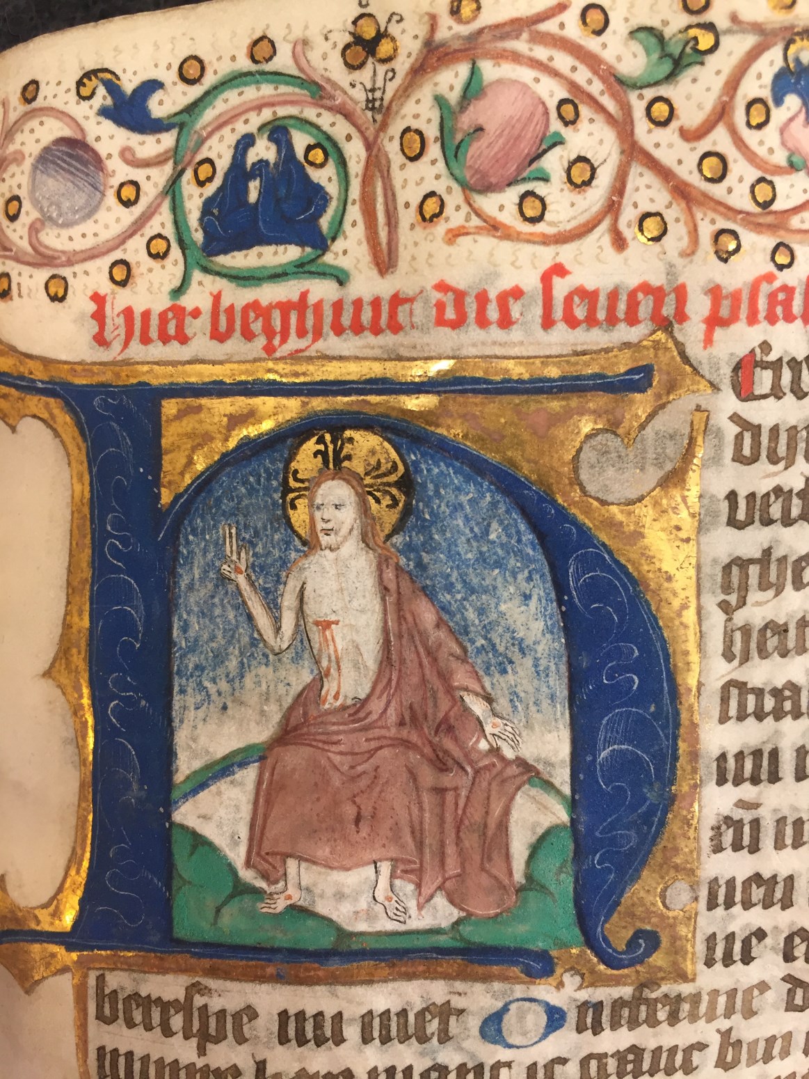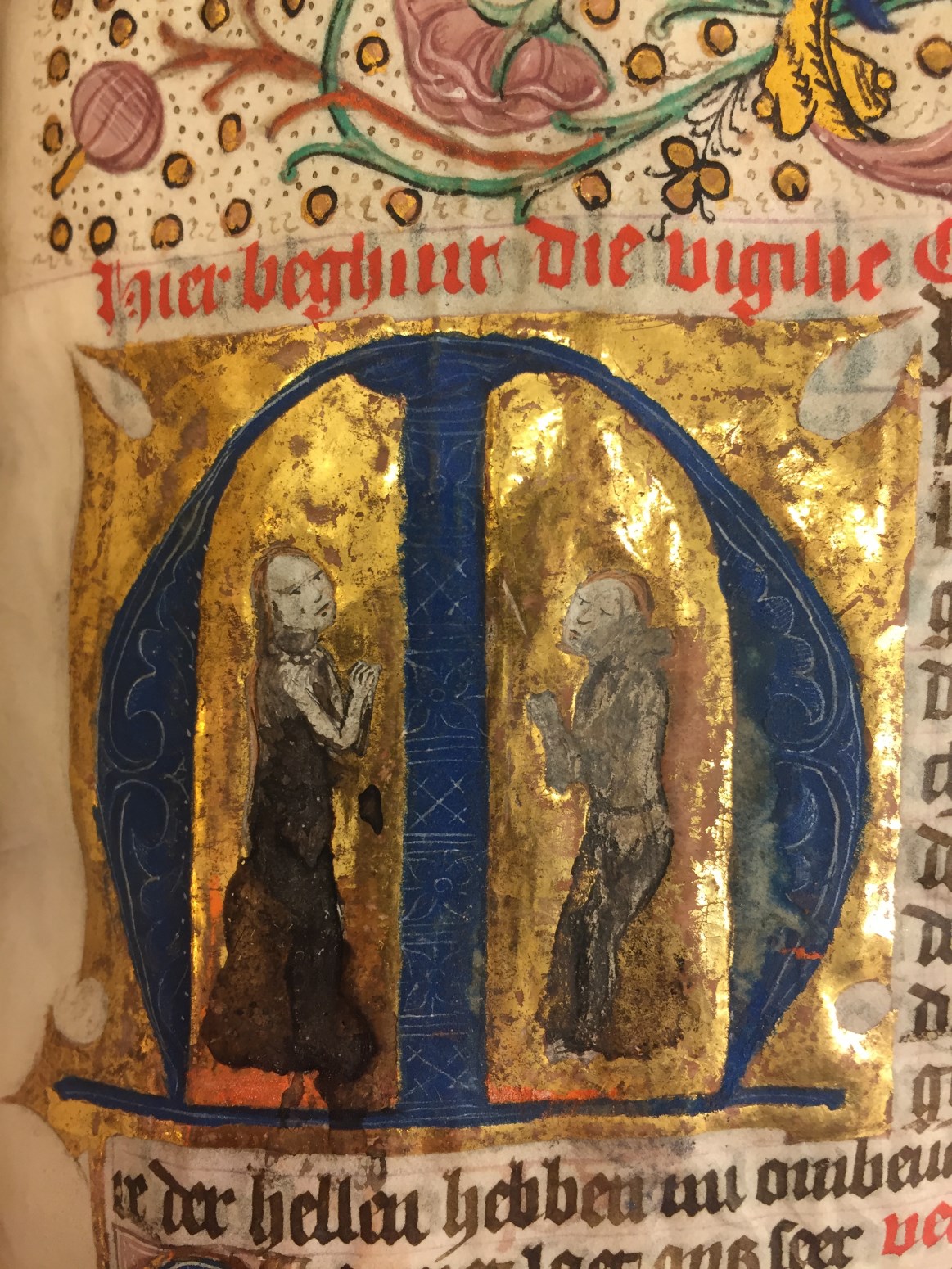 Een getijden- en gebedenboek uit het oosten van Nederland uit circa 1480. De margedecoratie in dit handschrift toont de volgende elementen: engeltjes ten halven lijve, karbonkeltjes (met acht stralen en een gouden kern), blad- en bloemmotieven. De afbeeldingen zijn vrij eenvoudig, waarbij men zelden veel figuren zal aantreffen. Scènes zijn vaak geplaatst binnen een gewelfd ...