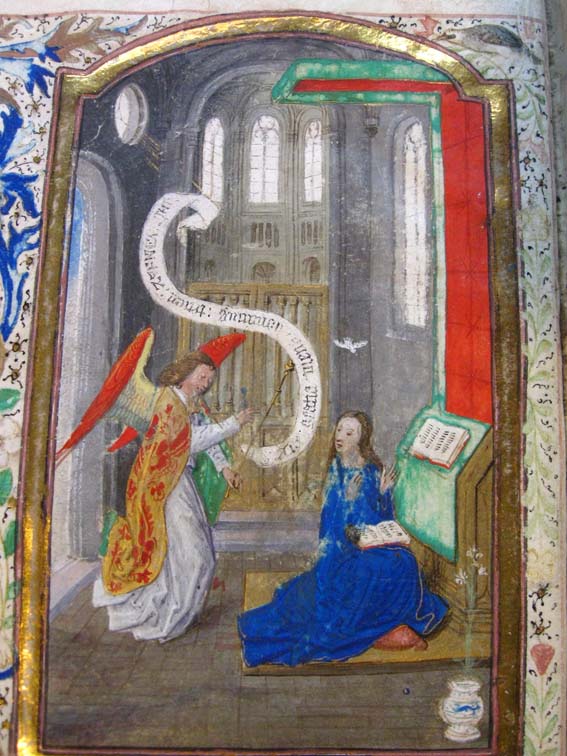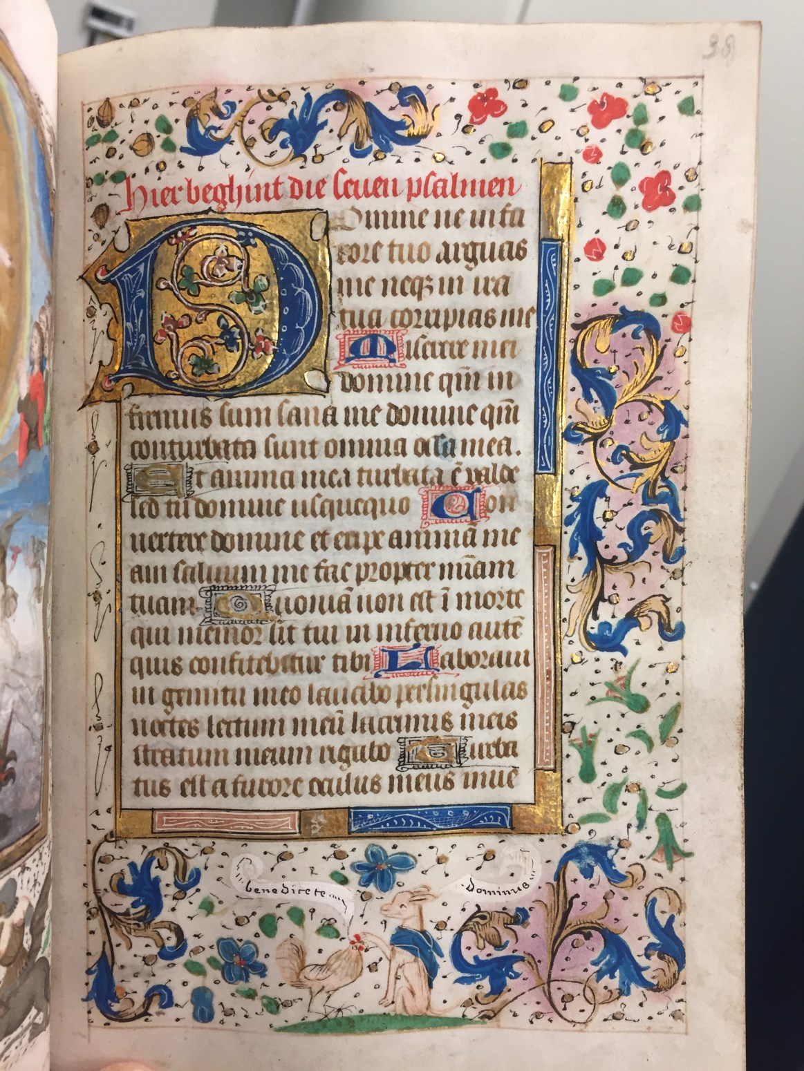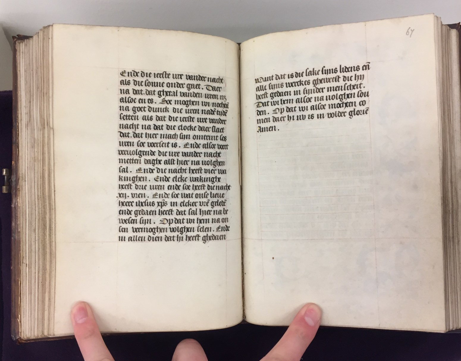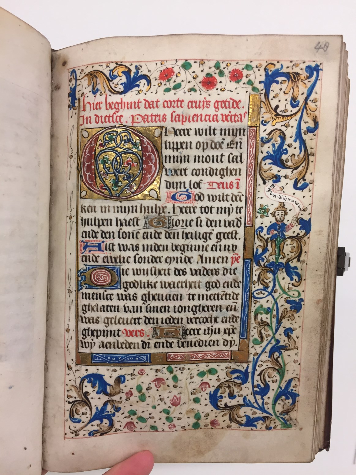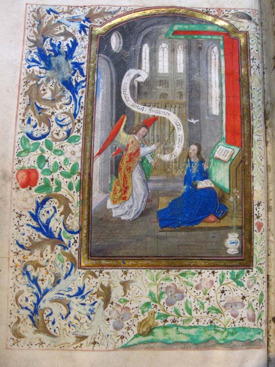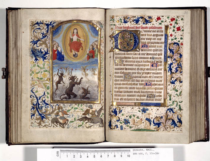 In het handschrift zijn twee miniaturen bewaard, een annunciatie naar voorbeeld van Hans Memlinc (f. 8v, behoorlijk beschadigd) en een bijzondere afbeelding van het laatste oordeel bij het begin van de zeven boetpsalmen (f. 37v). Tenminste twee miniaturen zijn uitgesneden, een voor de korte Kruisgetijden (f. 48) en vermoedelijk ook een bij de suffragie voor ...