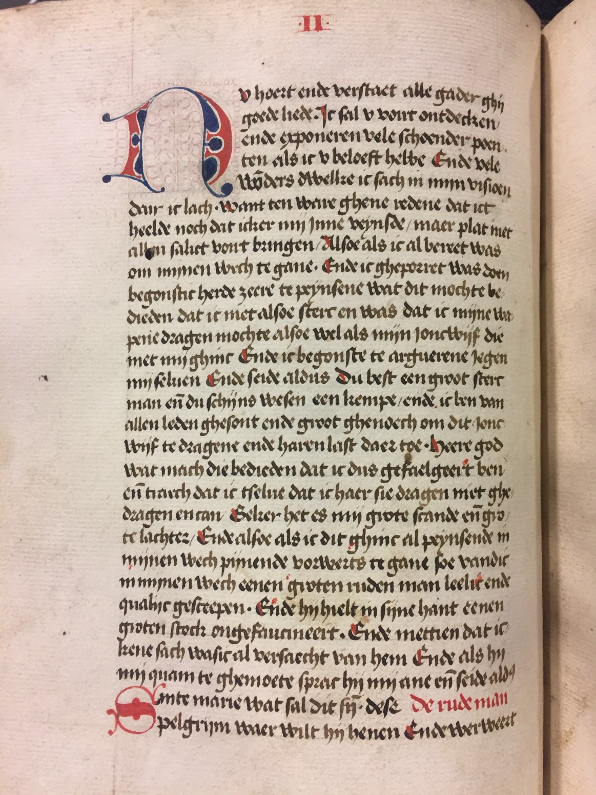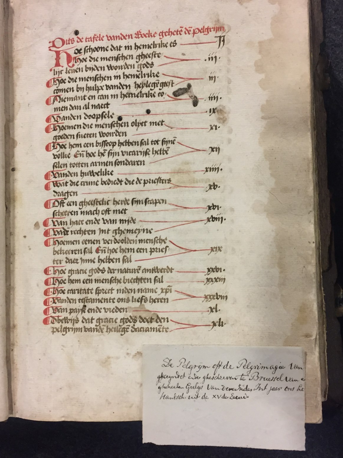 Deze Middel-Nederlandse vertaling de Pélerniage de la vie humaine (van Guillaume de Digulleville [+ voor 1358]) is opgetekend door Gielis van den Inde uit Brussel in 1463. Het handschrift (foliant formaat) telt 208 folia en heeft enkele fraaie initialen in rood en blauw. Aan het einde staat een Italiaans gedicht (gedateerd 1525).