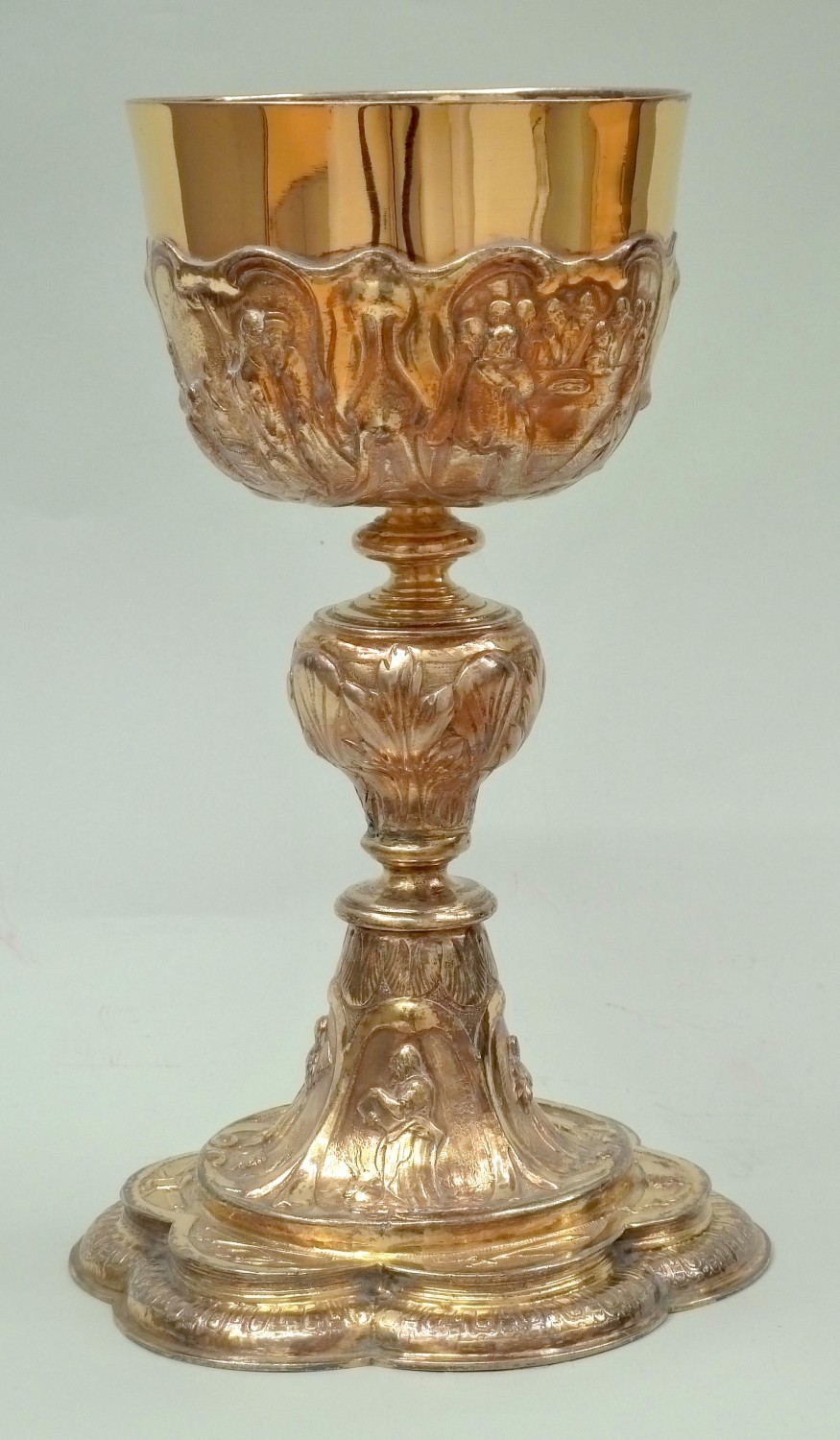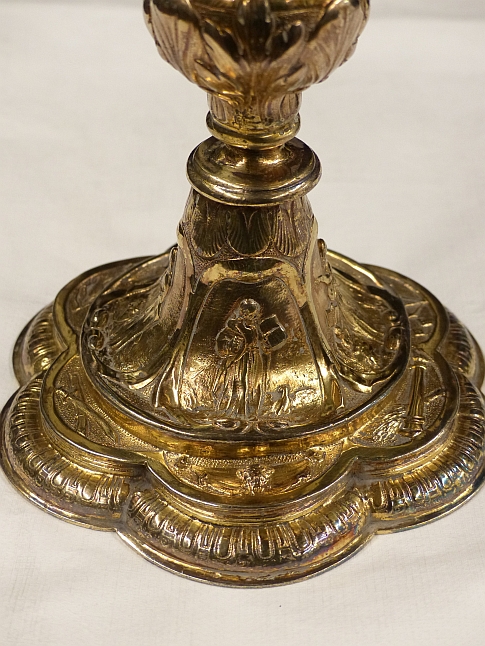 Zeslobbige voet in twee geledingen: op de onderste knorren op de bovenste de lijdenswerktuigen. Hierboven, in drijfwerk, de vier evangelisten. Peervormige nodus met staande bladmotieven. Op de tegencuppa in cartouches voorstellingen van 1. het Laatste Avondmaal, 2. Elia die door de engel wordt gespijzigd, 3. het offer van Abraham, 4. de Mannaregen. Gladde, tulpvormige cuppa. ...