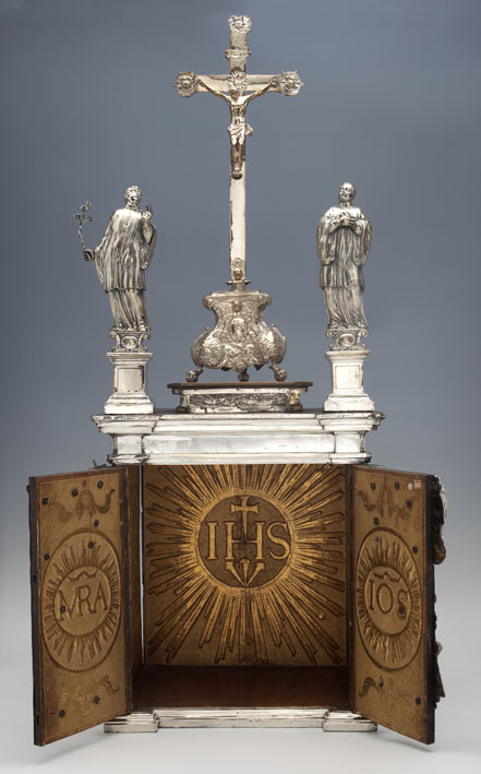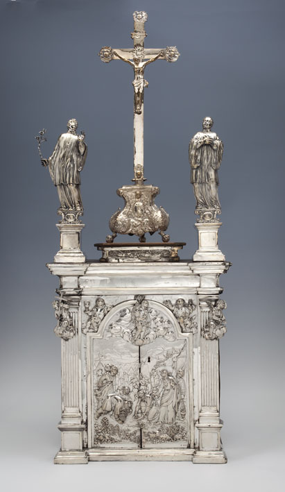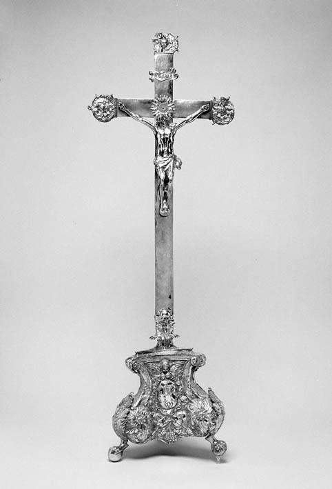 Crucifix met op kruisarmen cherubijnen, rustend op voetstuk met in een medaillon IHS