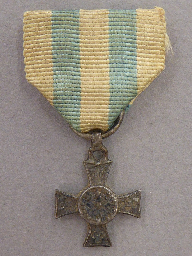 Klein model Mentanakruis met "Fidei et ... Pius IX 1867", kz. met "Hinc Victoria", blauw-wit lint