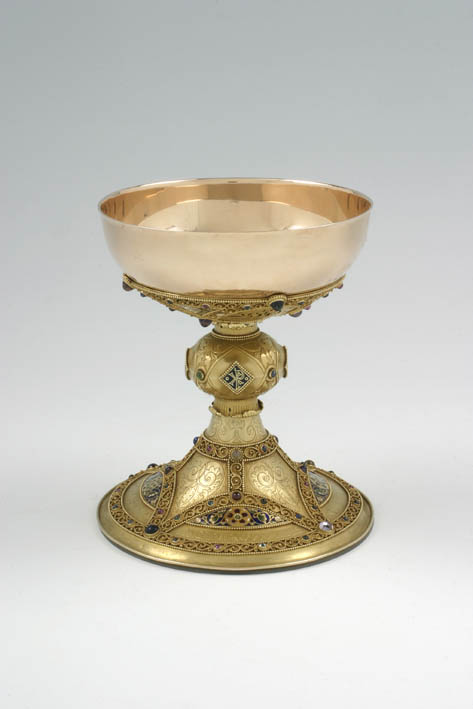 Kelk met filigraanwerk en email, bezet met ronde stenen en met wijde gouden cuppa, op onderzijde voet met "Petrus van der Burg ... anno D MCMIX D D"