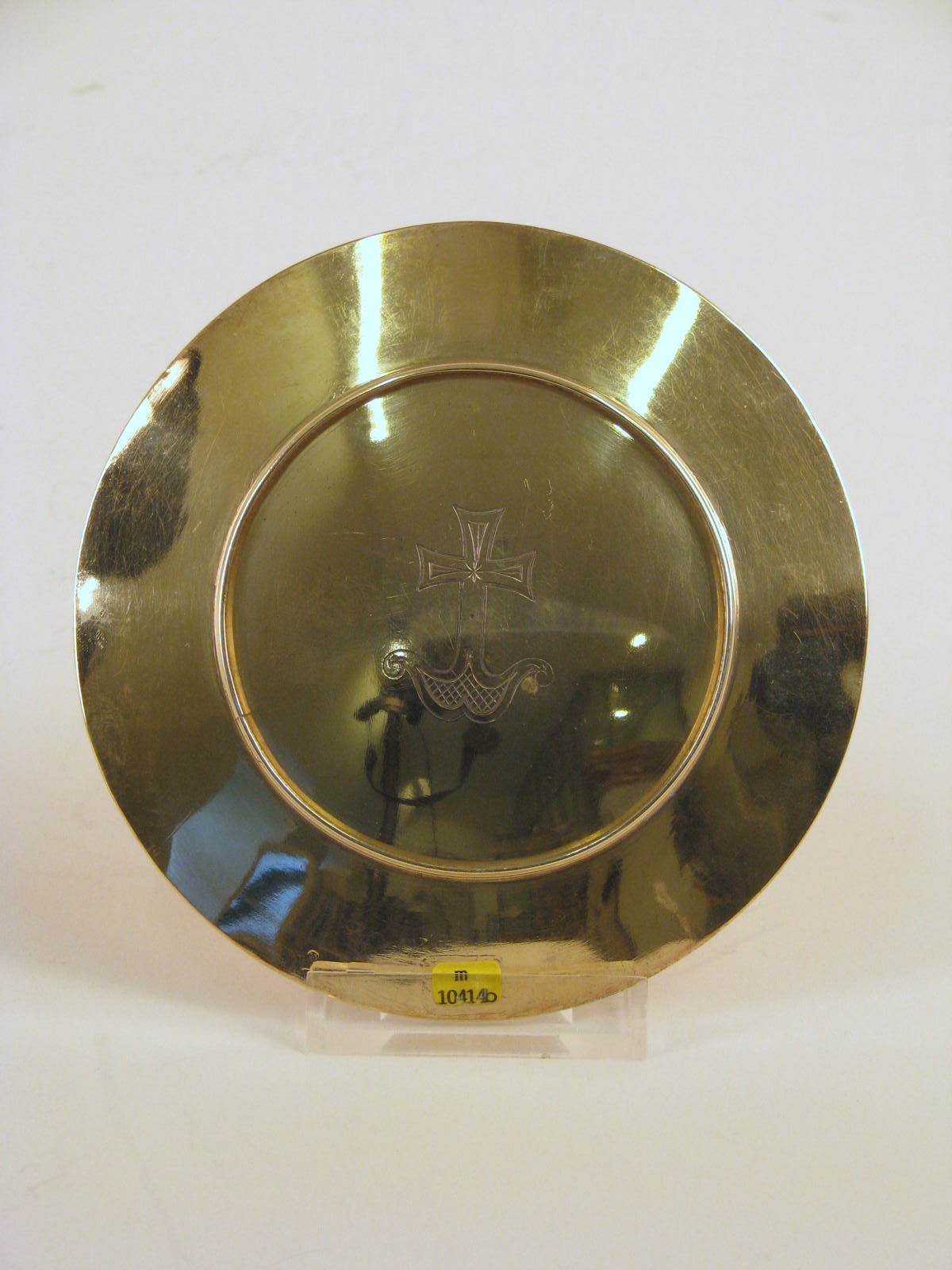 Pateen met gesoldeerde rand en gegraveerd staand kruis op siervoetstuk aan onderzijde