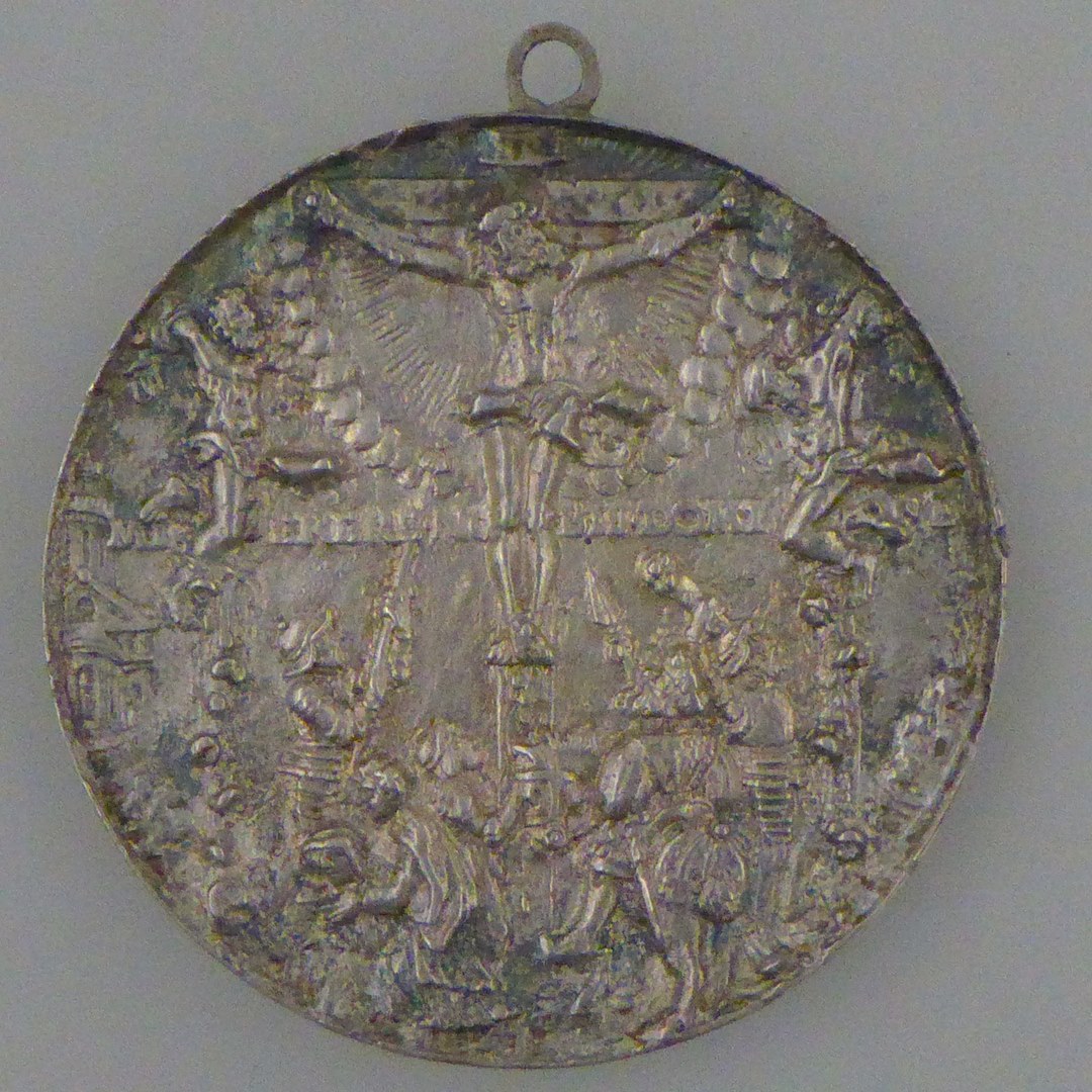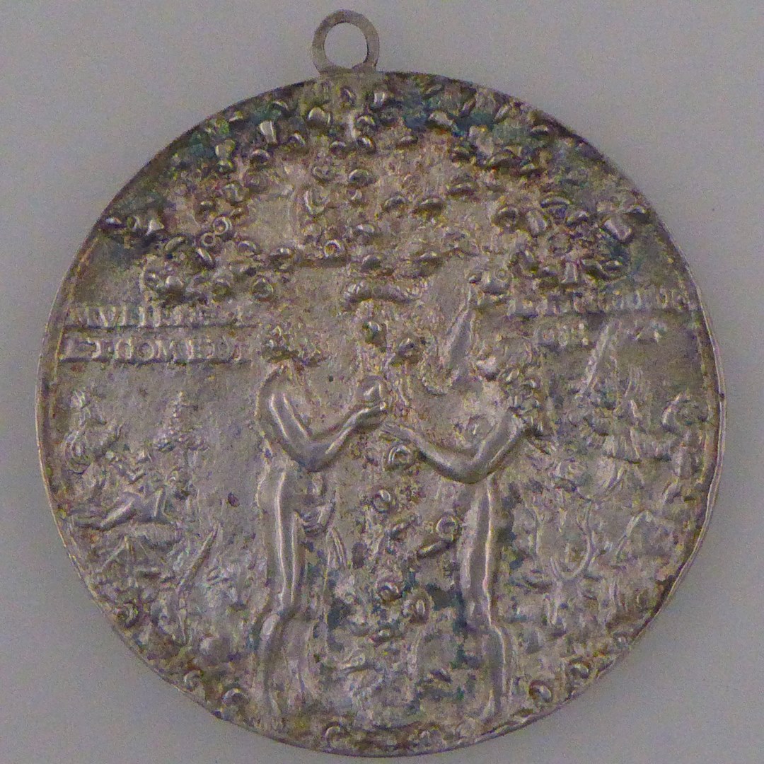 Draagpenning met Adam en Eva, kz. kruisigingsgroep