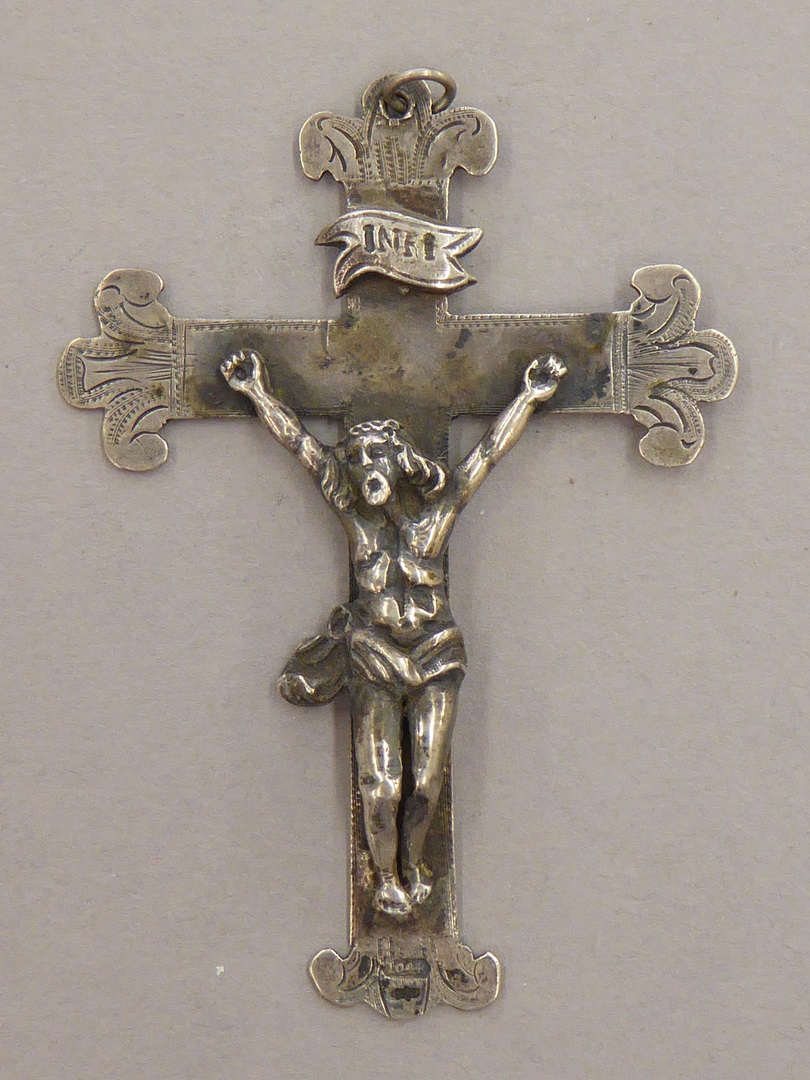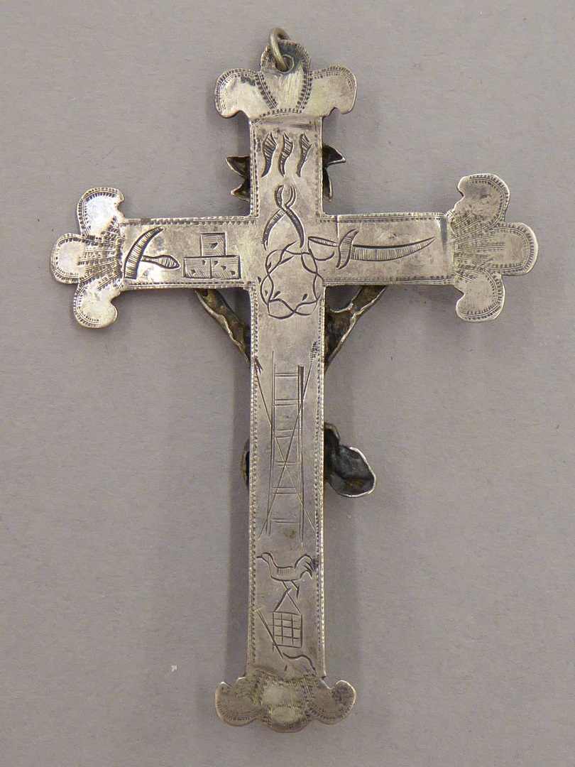 Kruisje met corpus en met "1644", op achterzijde zijn de passieinstrumenten gegraveerd