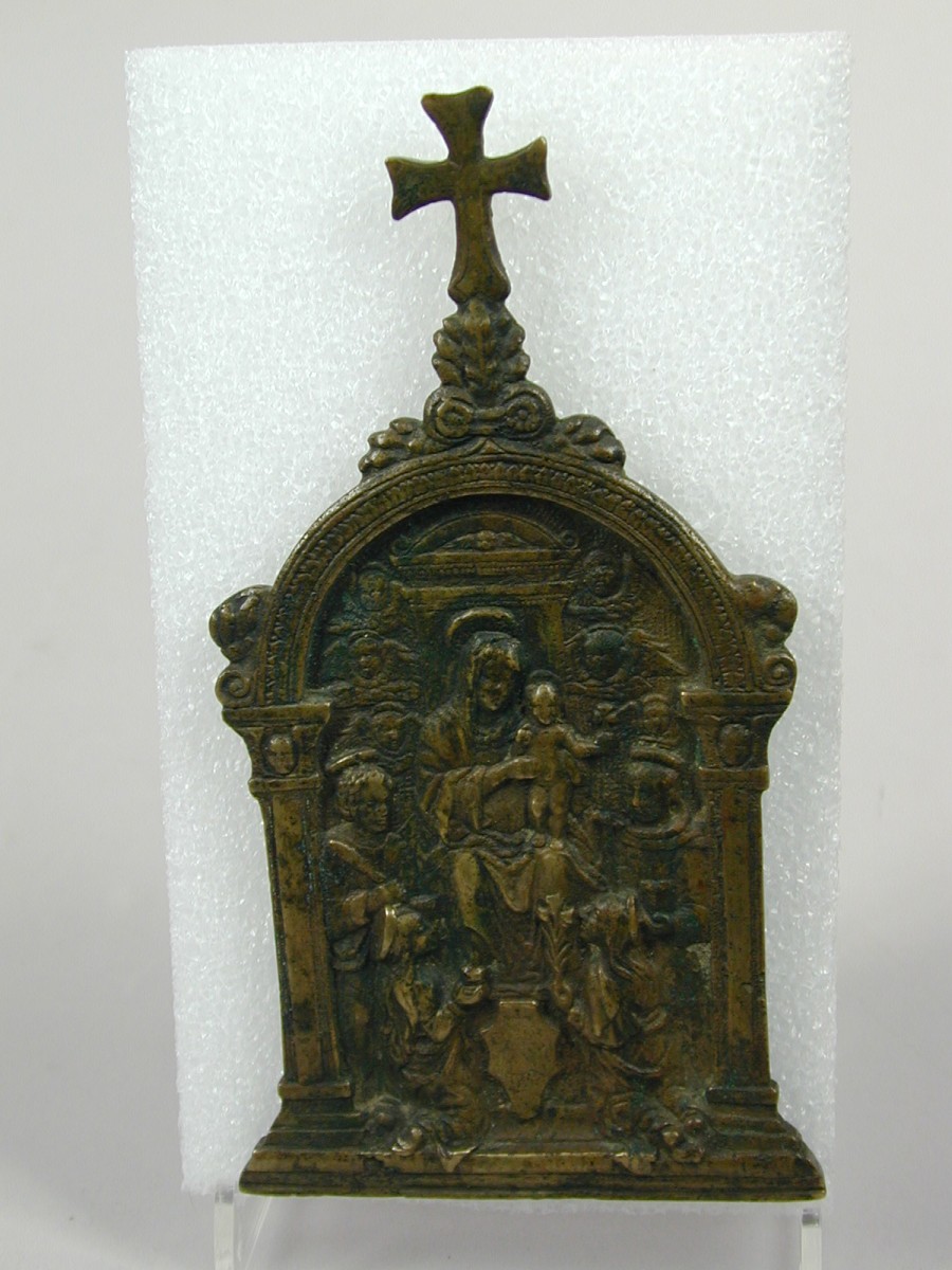 Paxtafel waarop afgebeeld troenende Maria met kind en enige heiligen