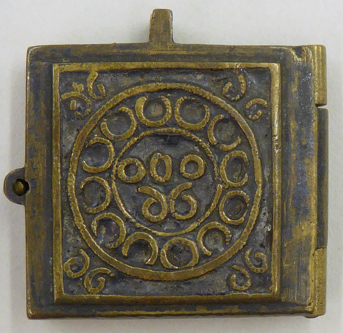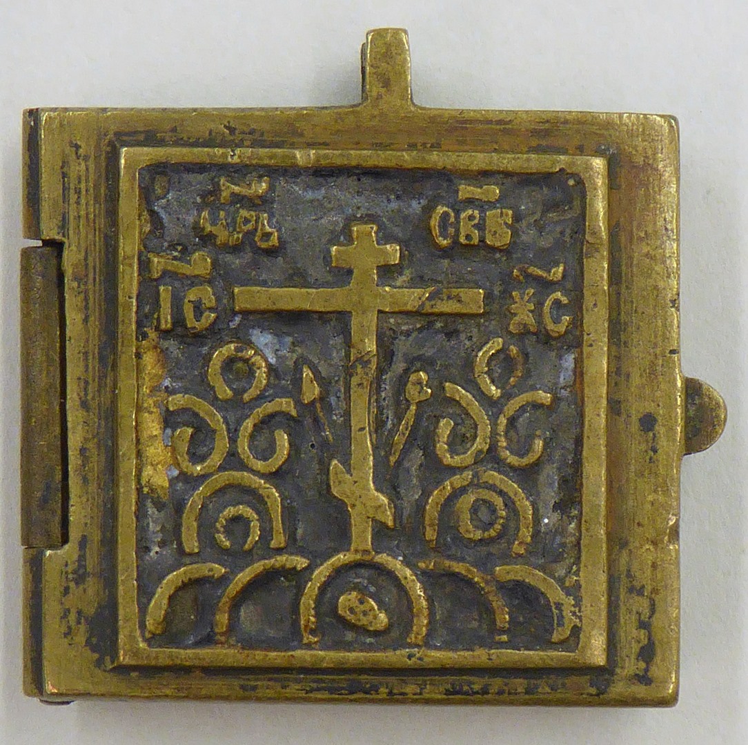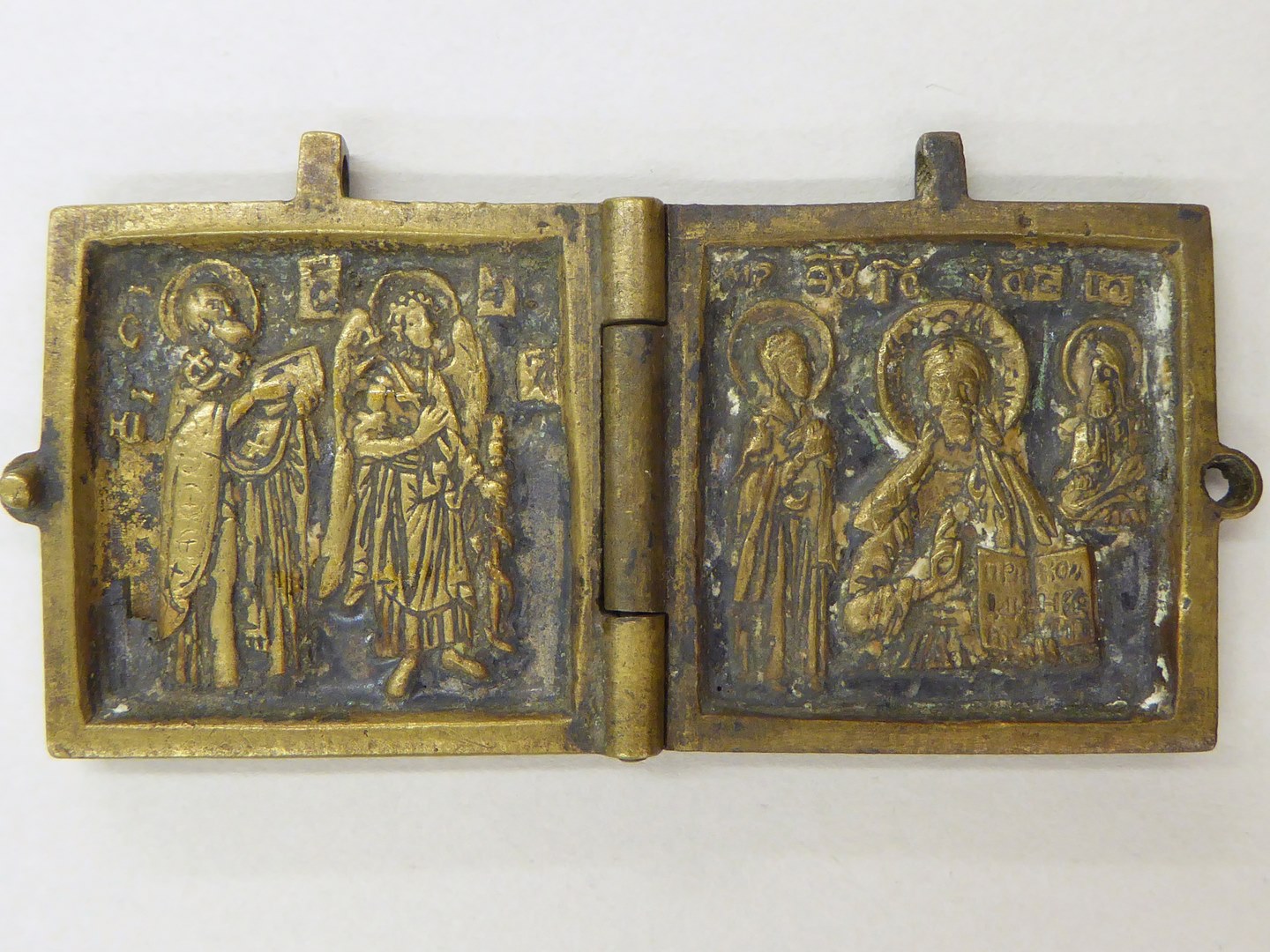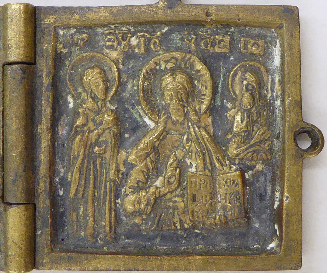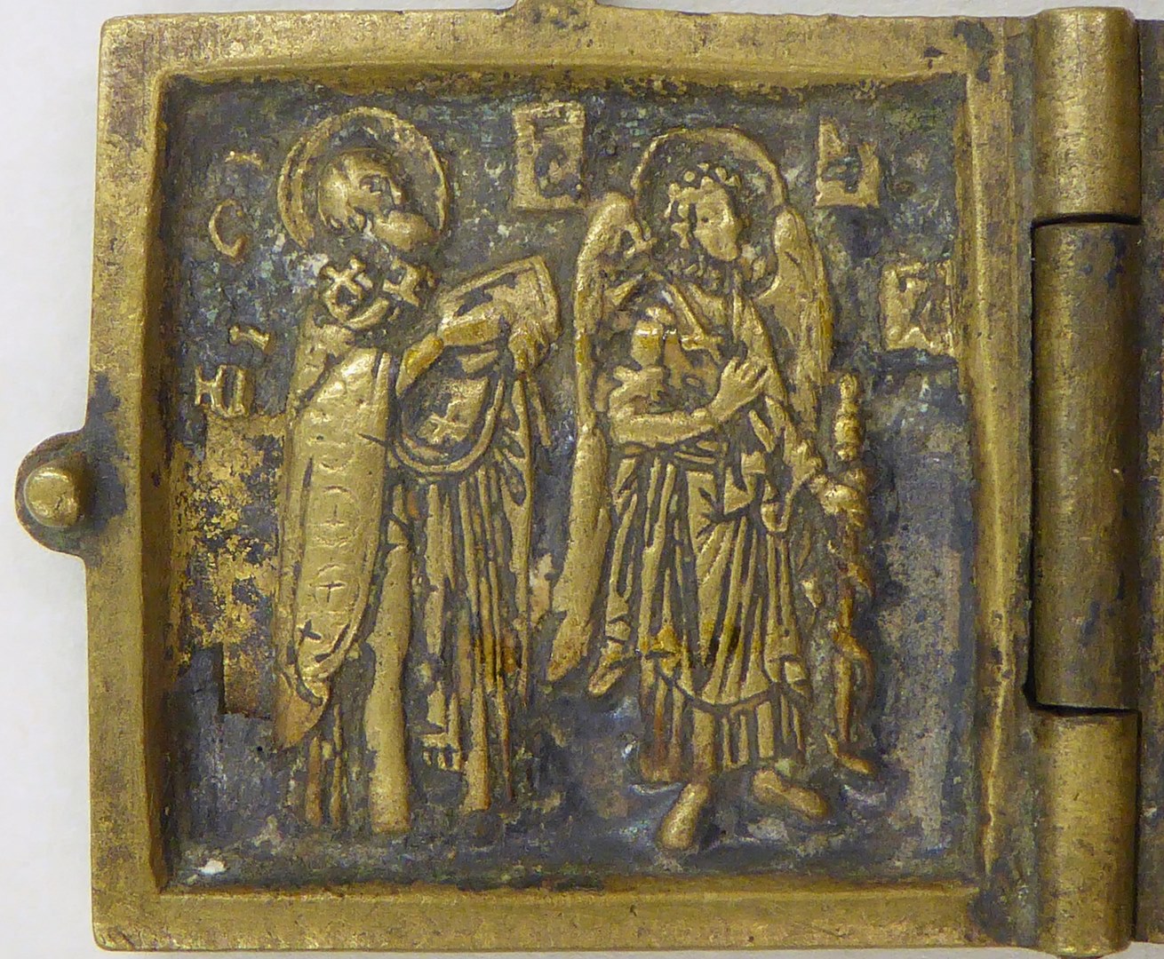 Diptiekje, links Nicolaas en de Engelbewaarder, rechts Christus met evangelieboek tussen Maria en Johannes