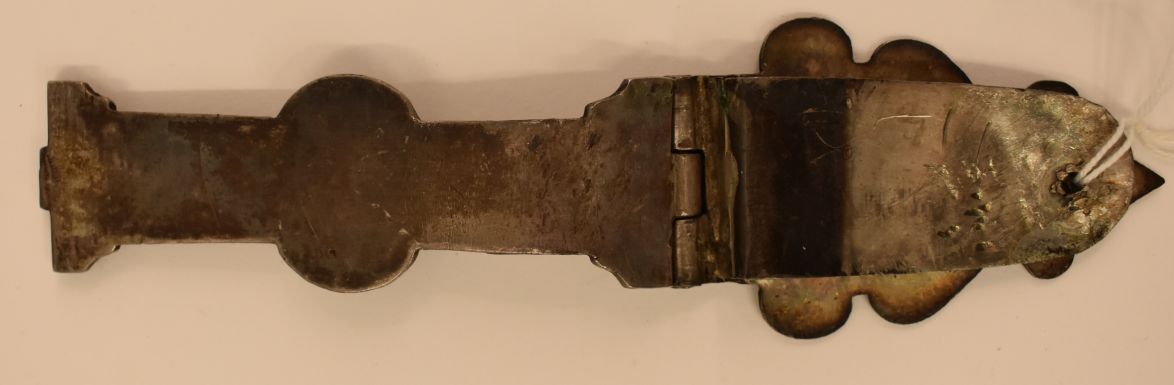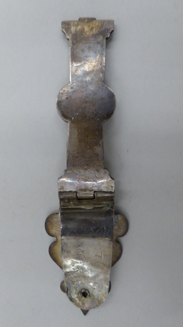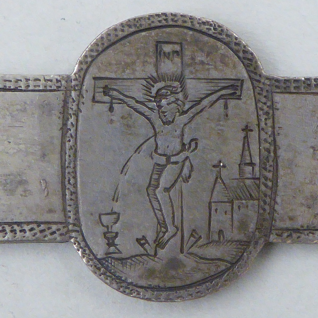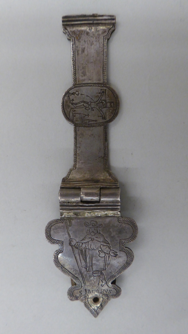 Een zilveren klamparm met daarin gegraveerd in een medaillon de gekruisigde Christus en gegraveerd in het aanzetstuk de Heilige Jacobus met daaronder ’S IACOBUS’. De eindhaak is van de klamparm afgebroken.