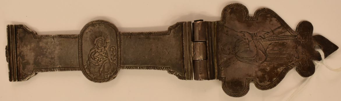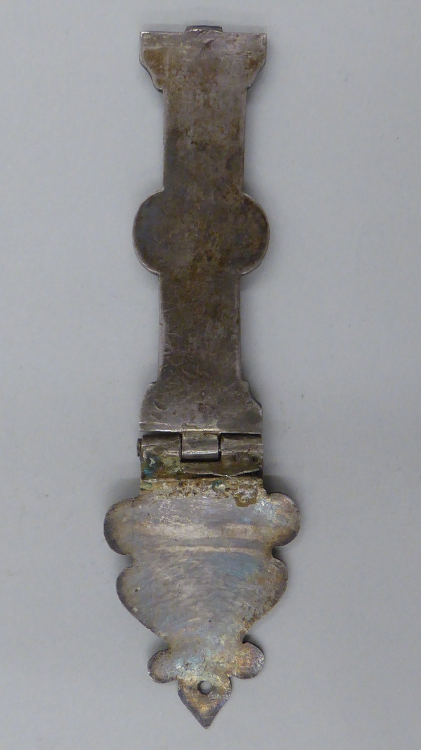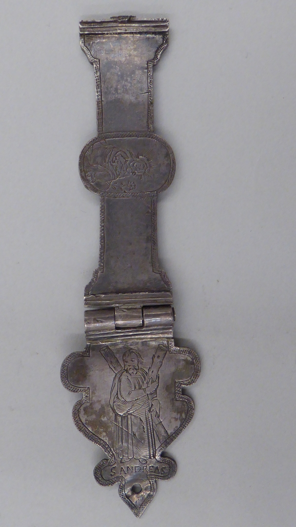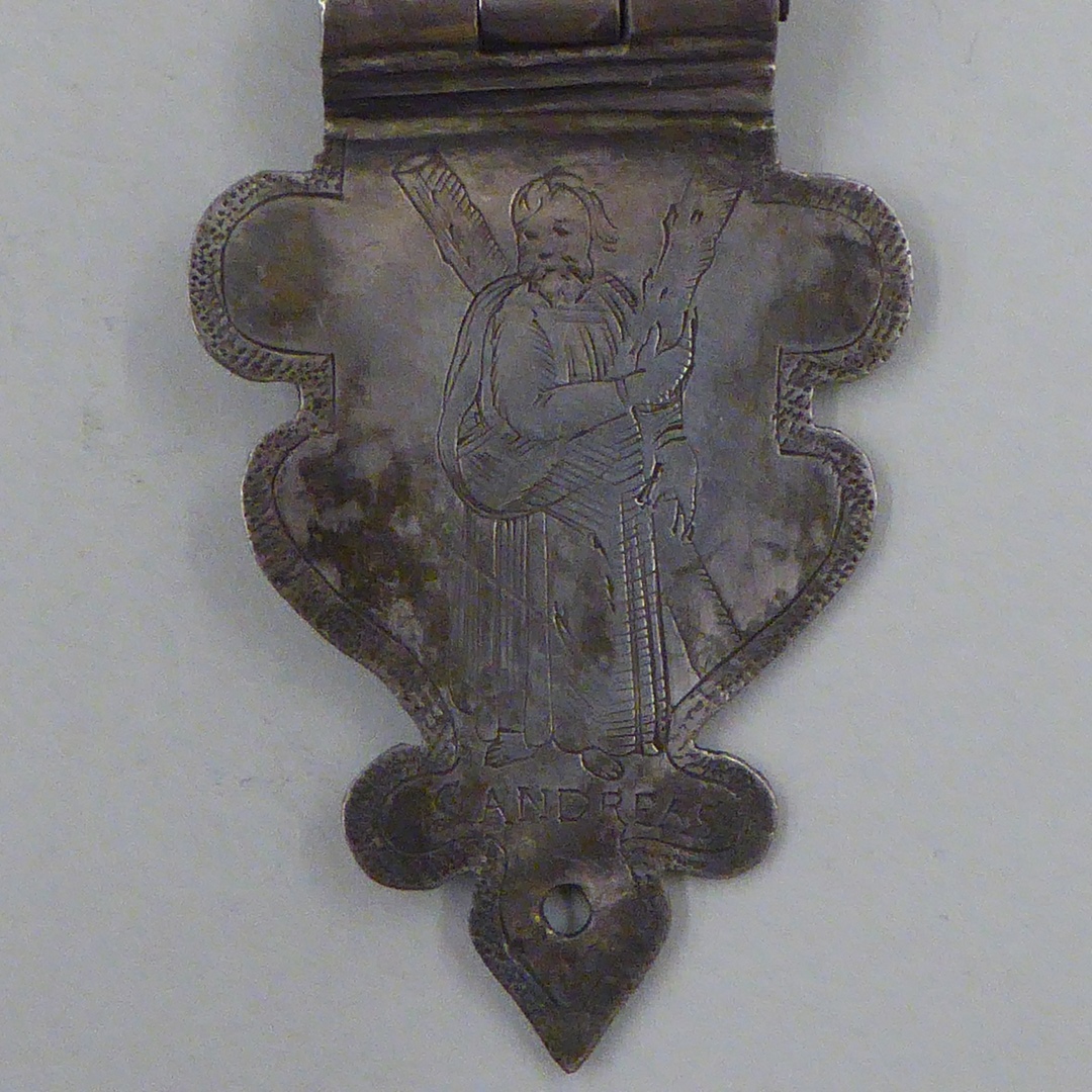 Een zilveren klamparm met daarin gegraveerd in een medaillon Maria met het Christus Kind en gegraveerd in het aanzetstuk de Heilige Andreas met daaronder ’S ANDREAS’. De eindhaak is van de klamparm afgebroken.