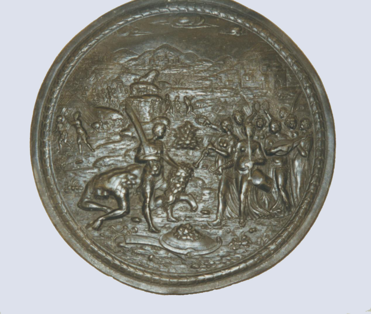 Controle 24 februari 1999: Twee gaatjes van voormalige bevestiging boven in de rand. Kleine beschadigingen langs de onderrand. De hoogste delen van het reliëf zijn iets gesleten.