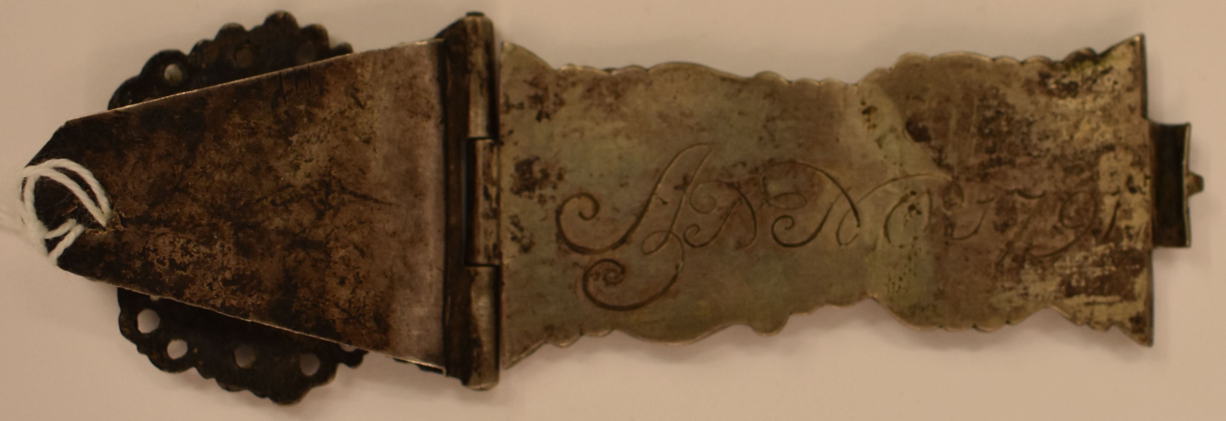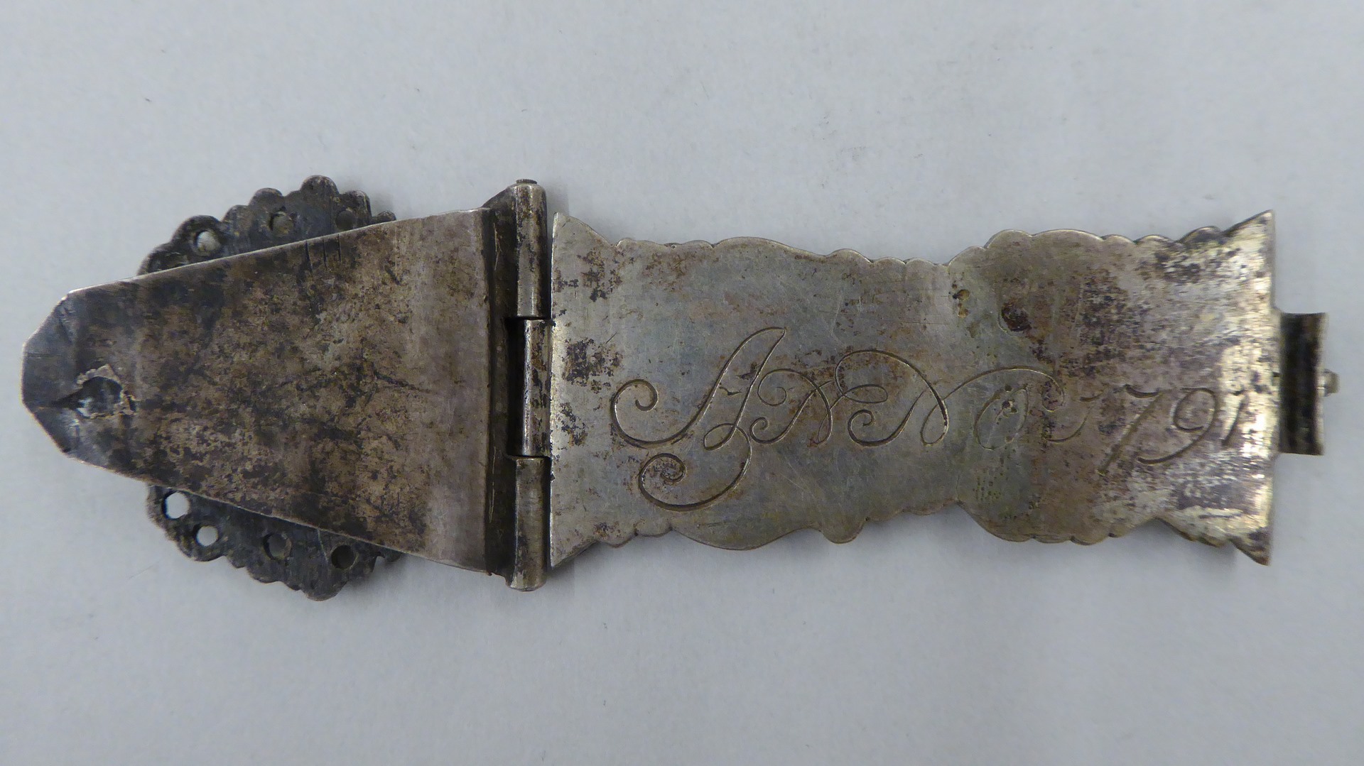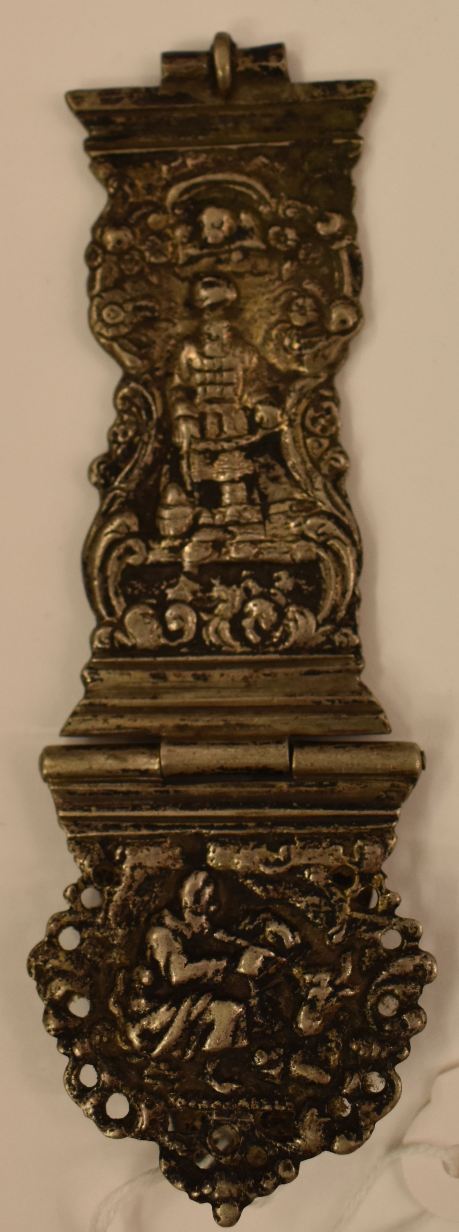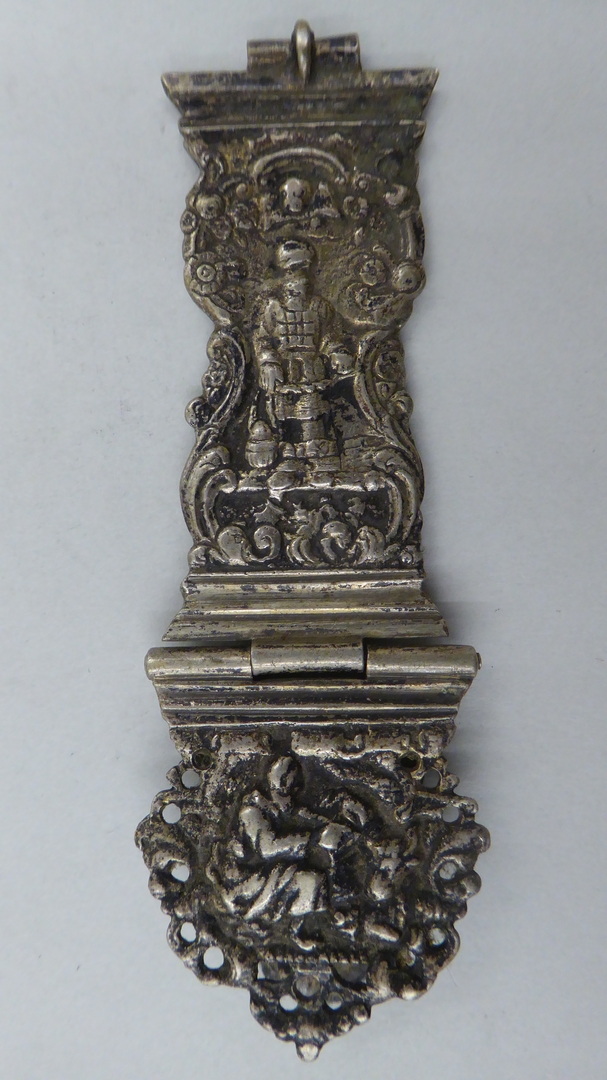 Gegoten zilveren klamparm met Aäron en aanzetstuk met evangelist Lucas. Op de achterzijde van de klamparm staat gegraveerd 'Anno 1791'