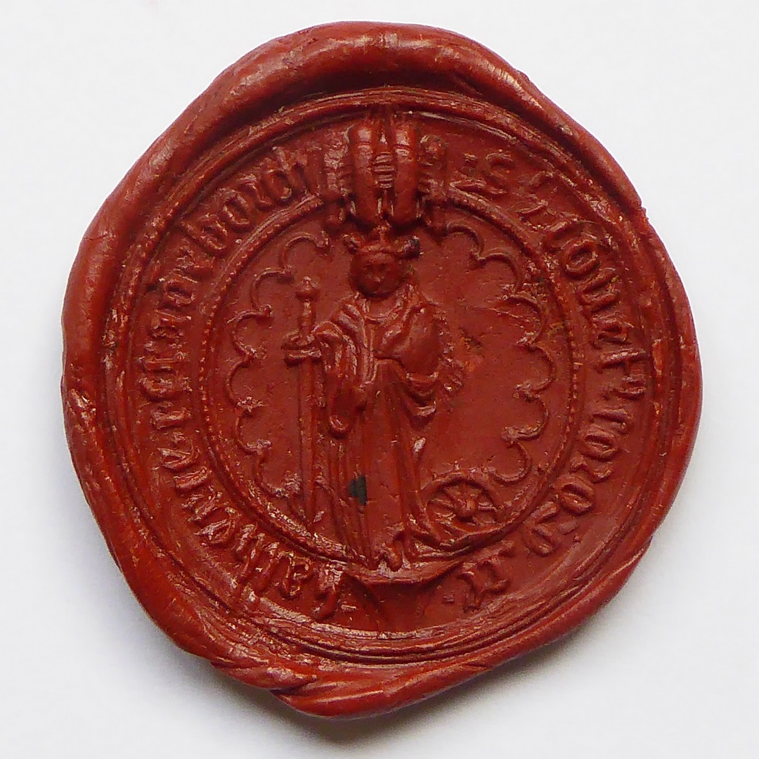 Afdruk van zegelstempel (15de eeuw) zusterconvent H. Catharina, met Catharina met zwaard en rad