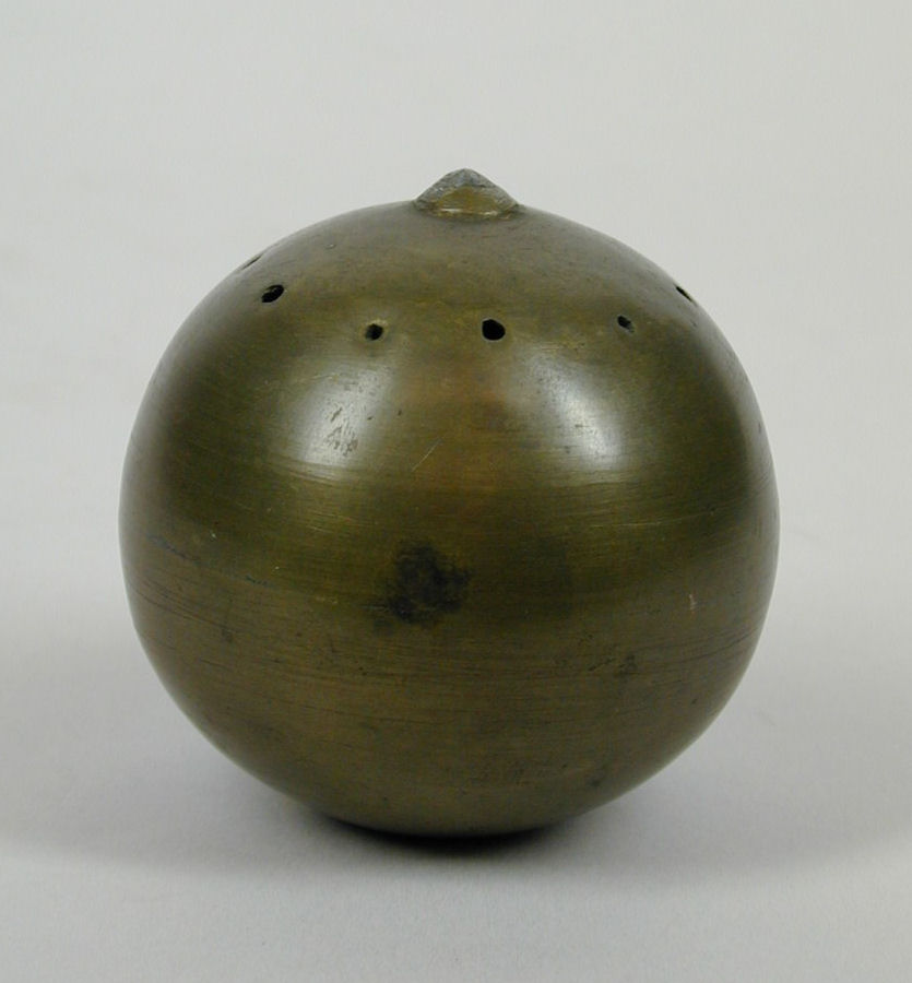 Koperen bal van een aspersorium met uitsteeksel waaromheen tien gaatjes