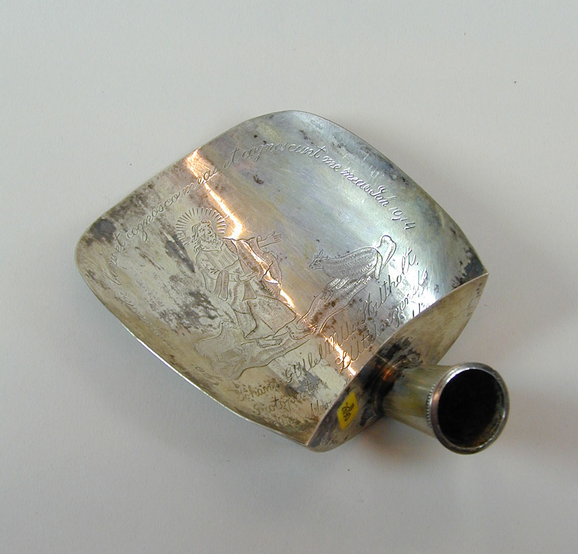 Herdersschepje met de goede Herder erin gegraveerd met omschrift en chronicum