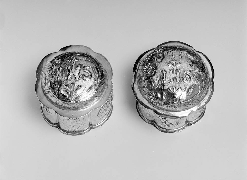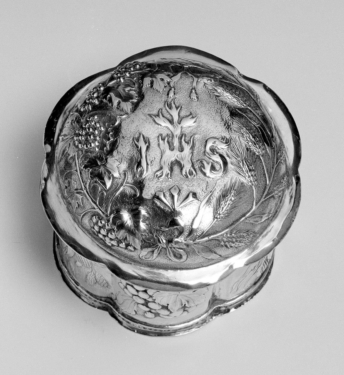 Hostiedoos, op gelobe zijkanten en deksel druiventrossen en korenaren, met IHS en drie kruisnagels op deksel