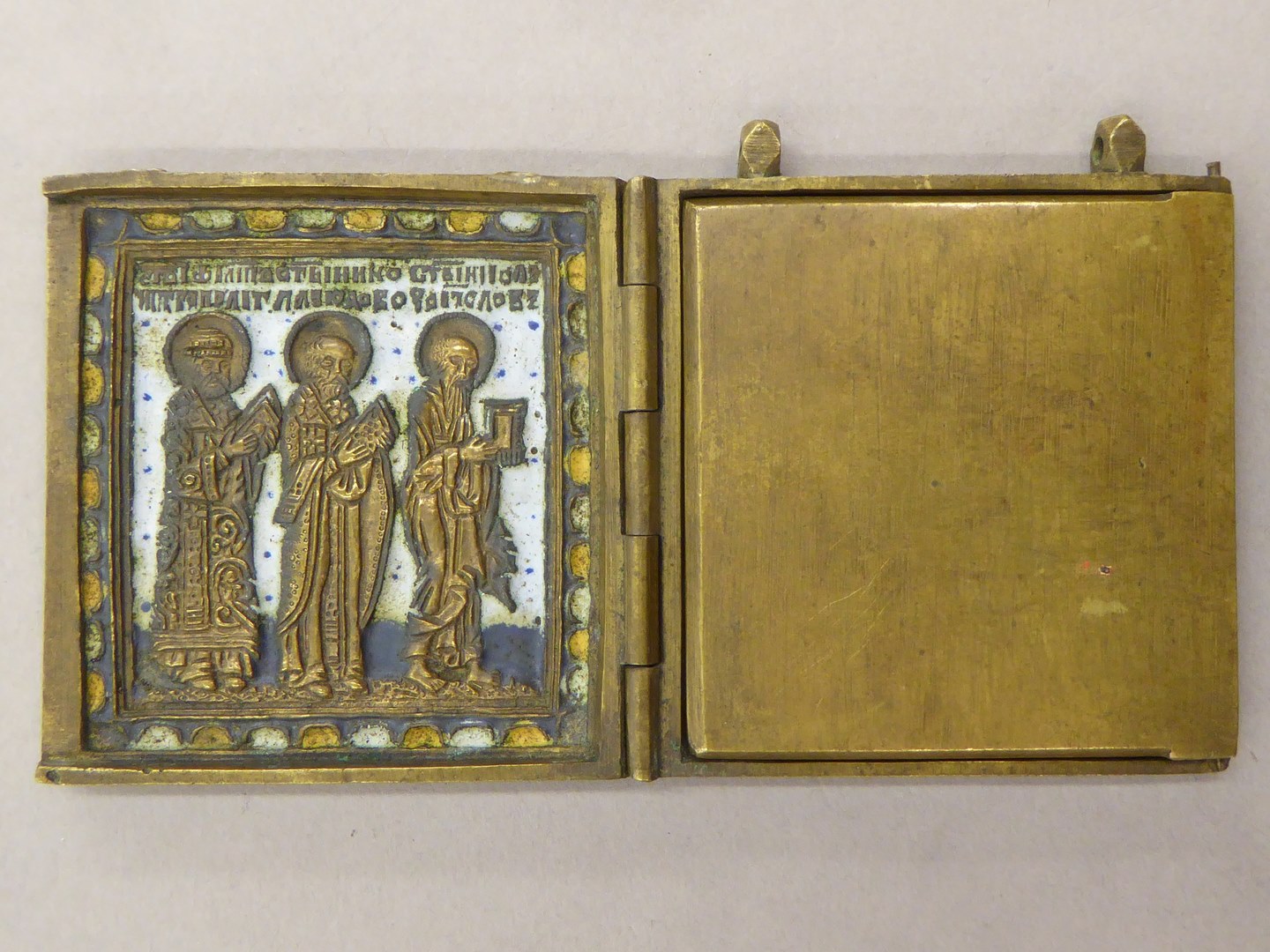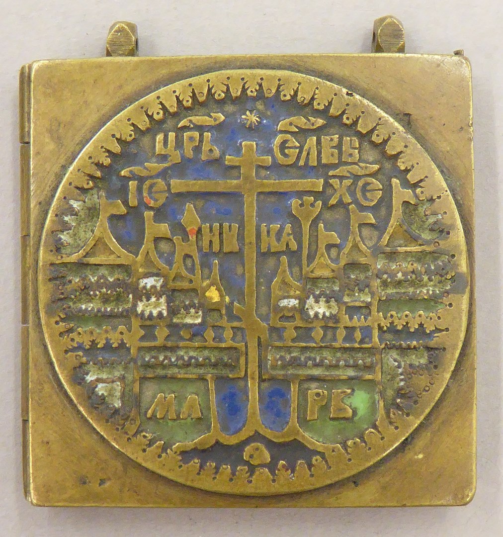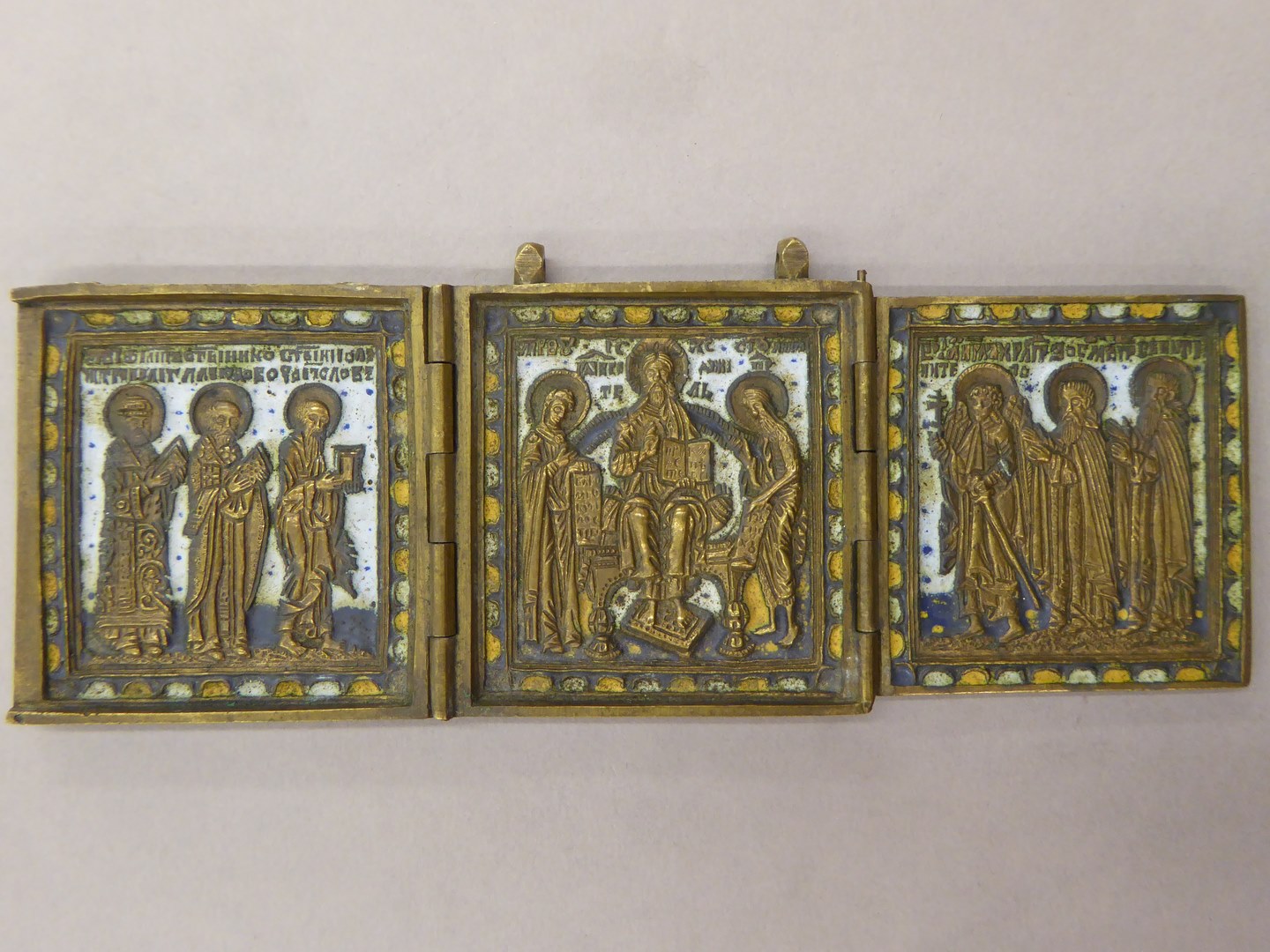 Klein drieluik met uitgebreide Deësis. Op het centrale luik staan van links naar rechts: Moeder Gods, Christus en Johannes de Voorloper (de Doper). Op het linkerluik staan: Filip, metropoliet van Moskou, Nicolaas en Johannes de Theoloog. Op het rechterluik staan: de Engelbewaarder, Zosima en Savattij. Op de voorzijde van het drieluik staat het kruis van ...
