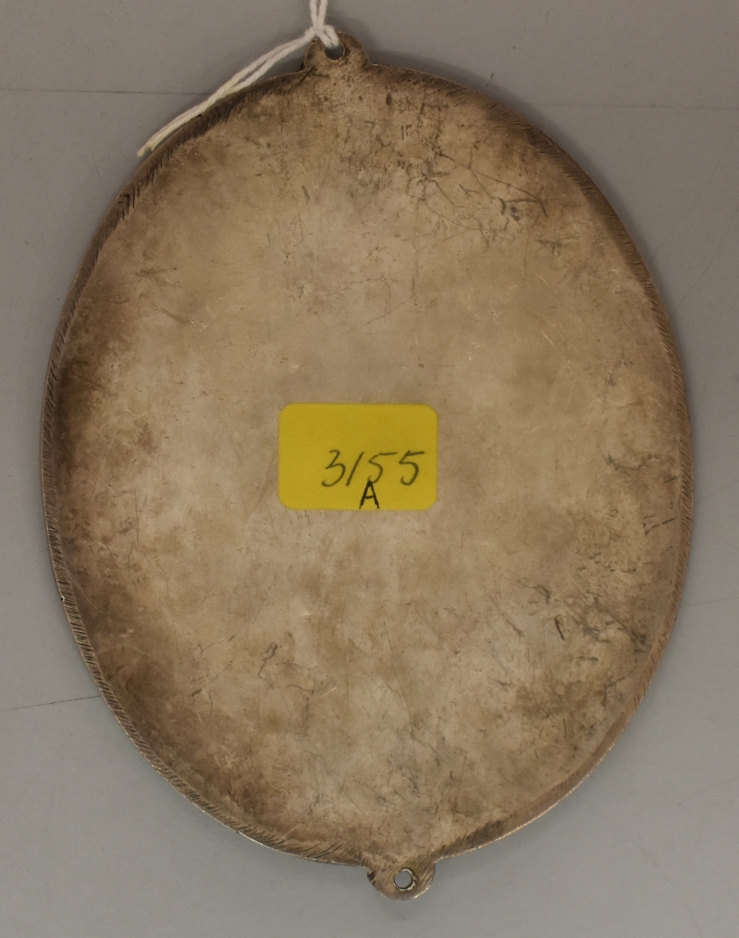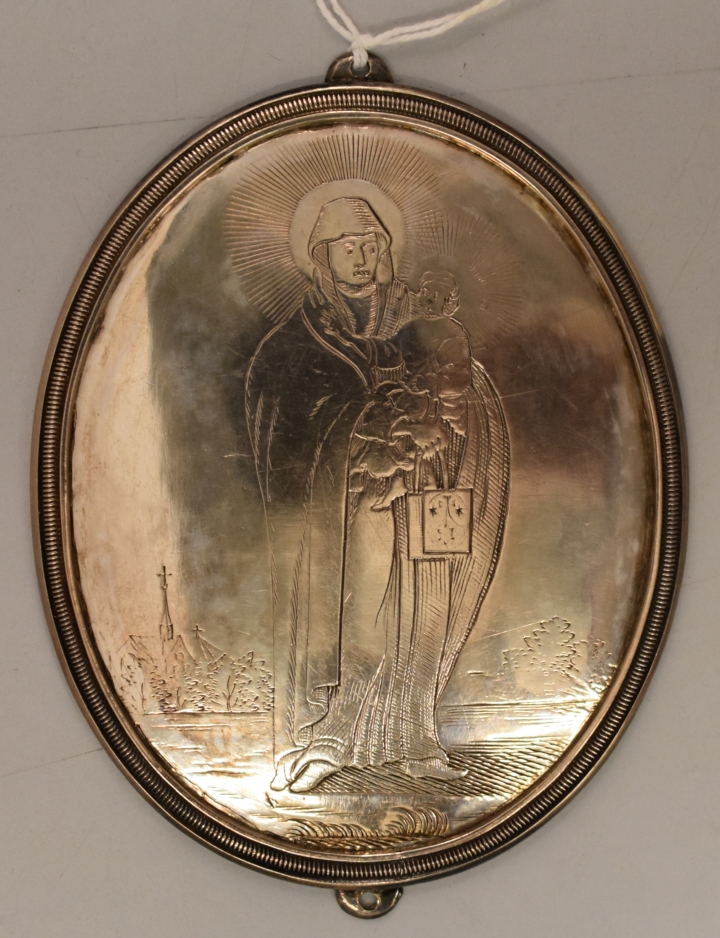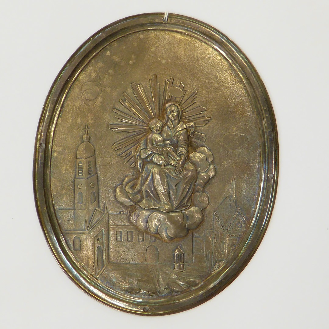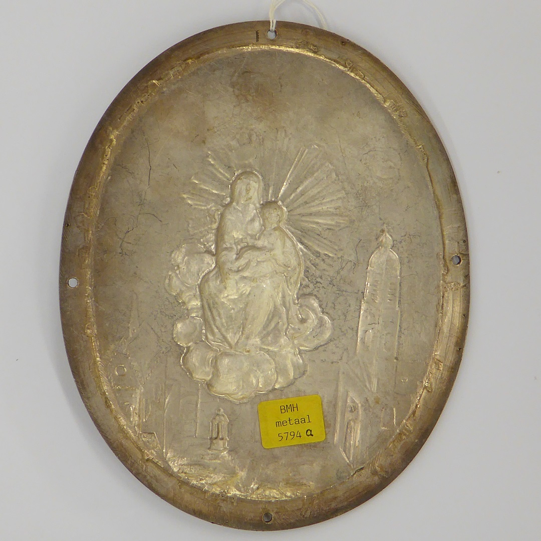 Een ovalen zilveren middenstuk met daarin gegraveerd O.L. Vrouw met scapulier