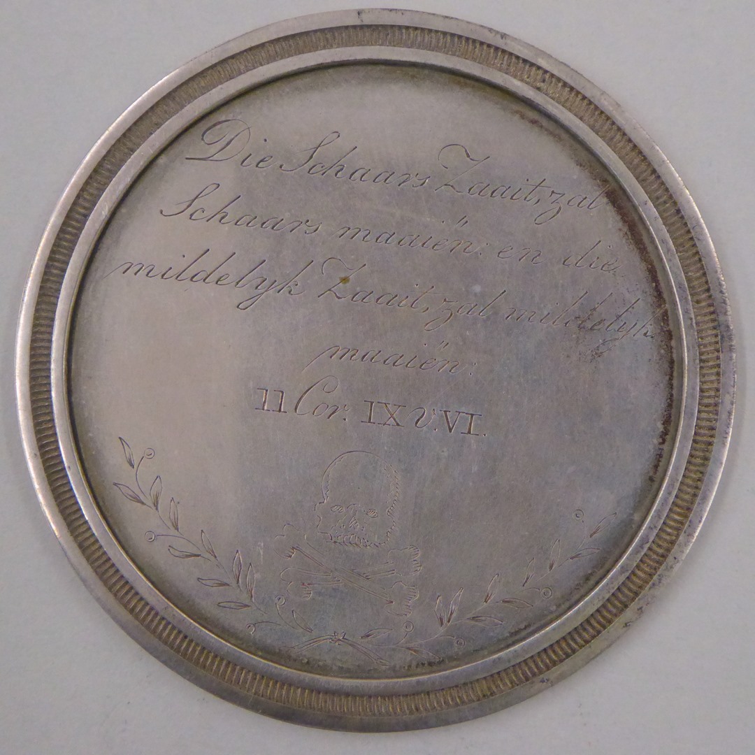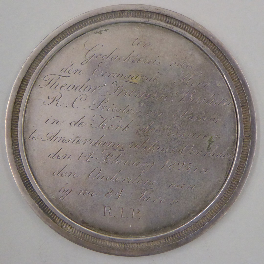 Begrafenispenning Theodorus Franciscus Bastian (+1825), pastoor kerk de Zaaier te Amsterdam, kz. "Die schaars ..."