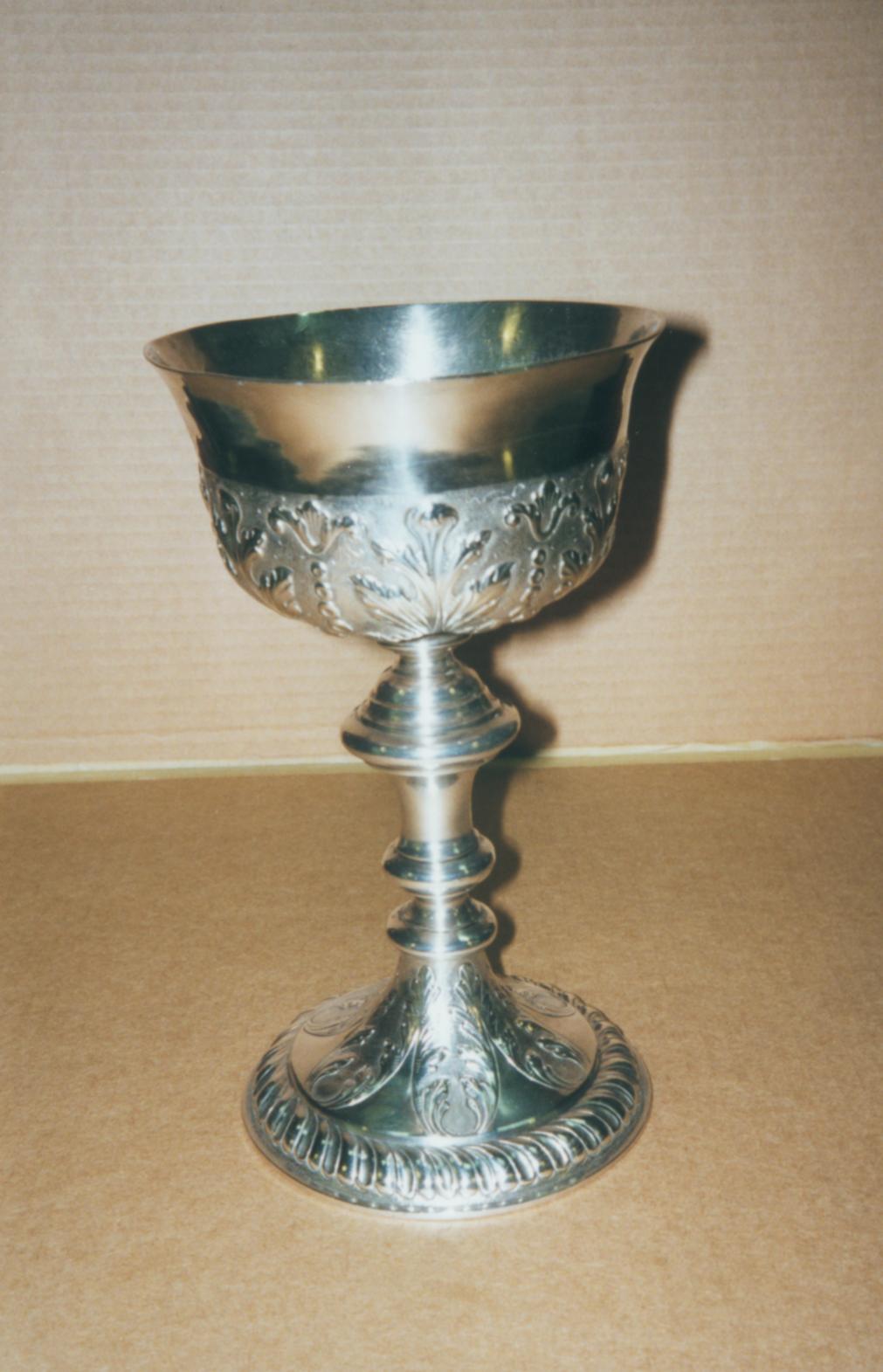 Ablutiekelk op ronde voet met bladmotieven op voet en cuppa